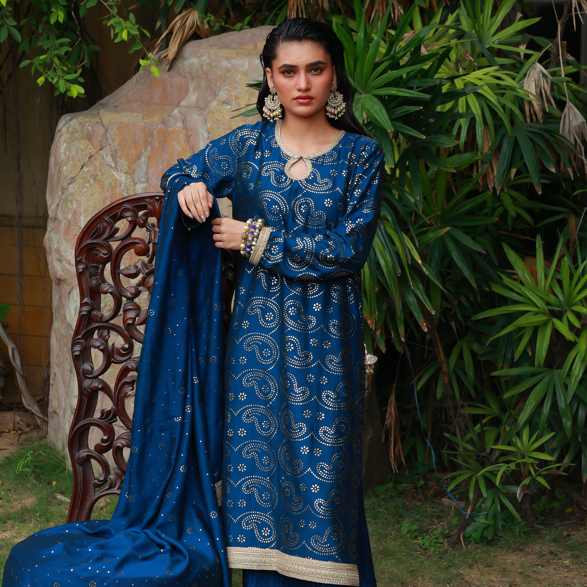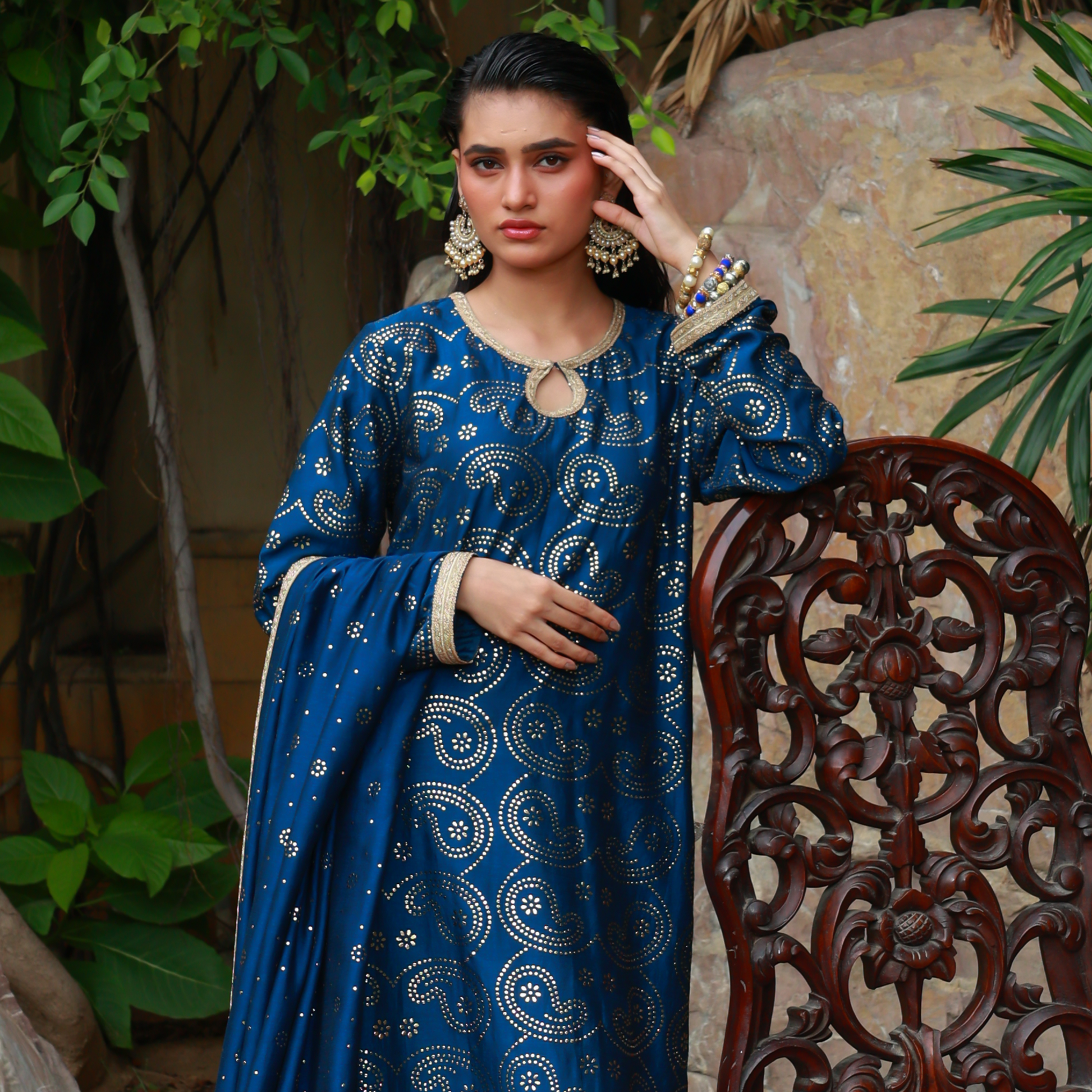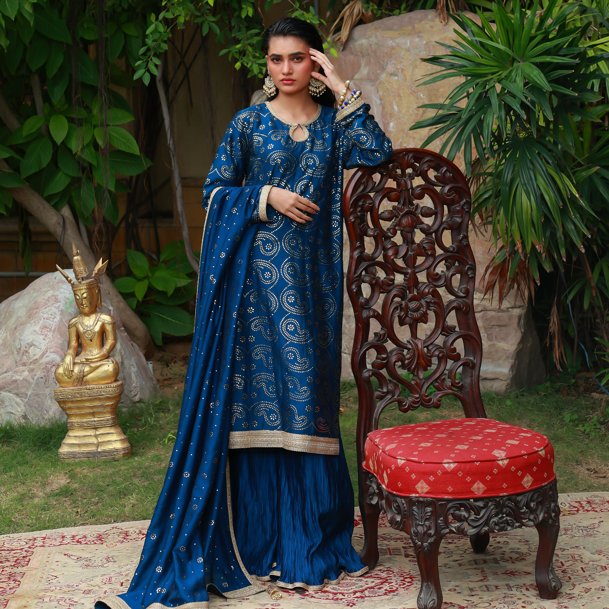 Teal kamdani long shirt with a keyhole neckline adorned with gota lace, featuring additional gota detailing on the borders and sleeves, accented with a tassel on the side. Paired with a silk crushed gharara finished with a gota border, and a kamdani dupatta edged with gota on all four sides and tassels along the corners.