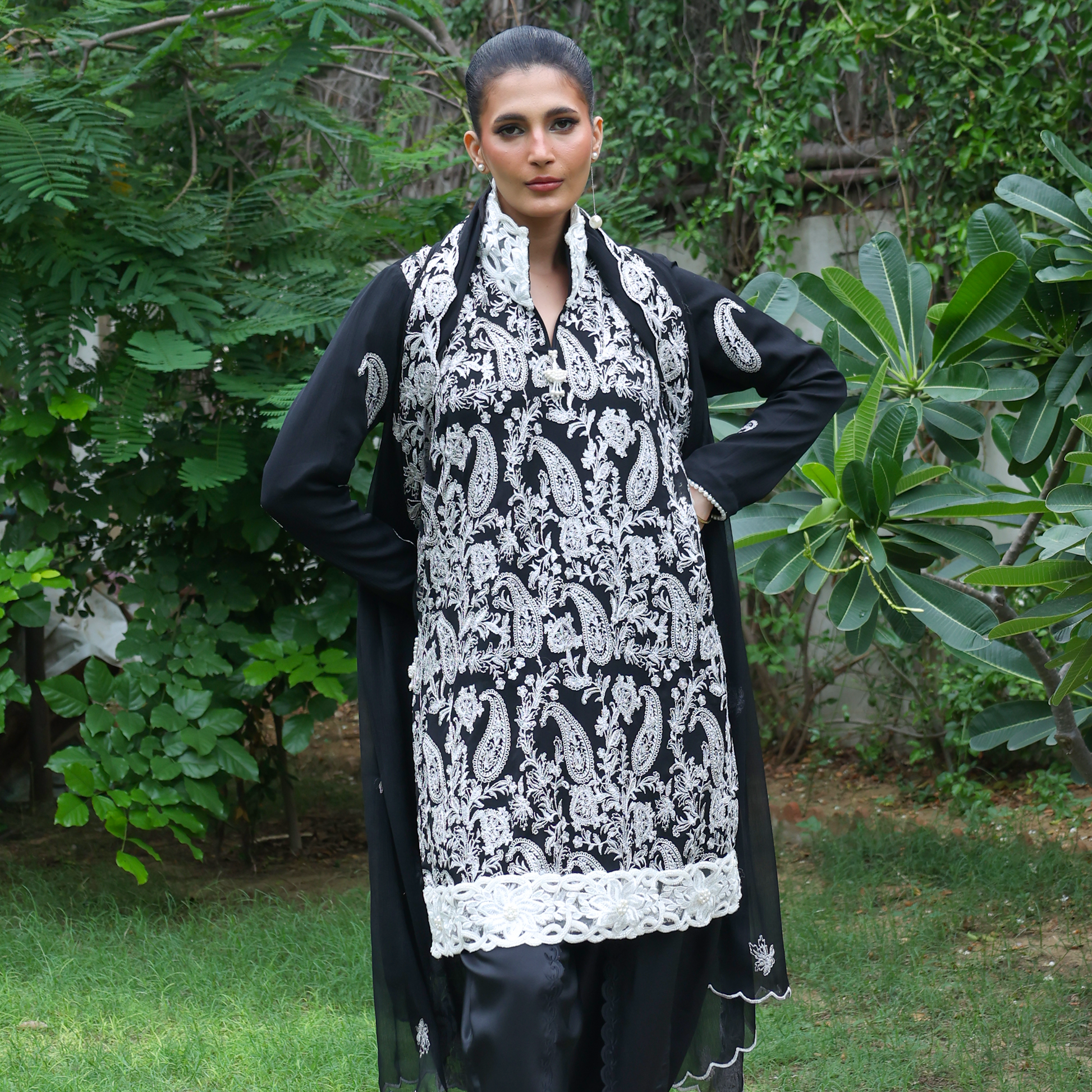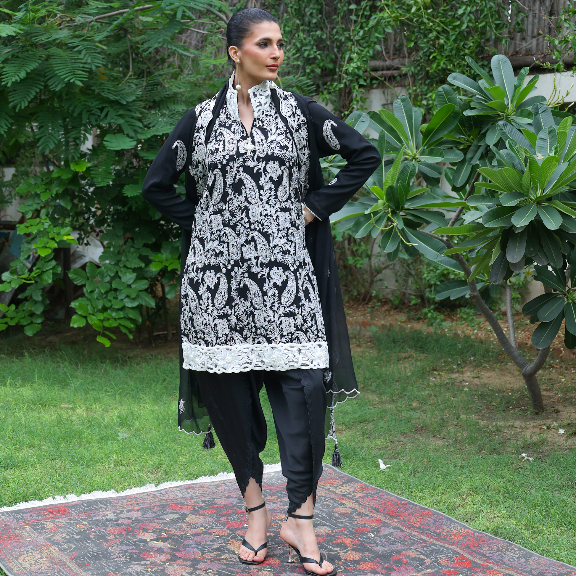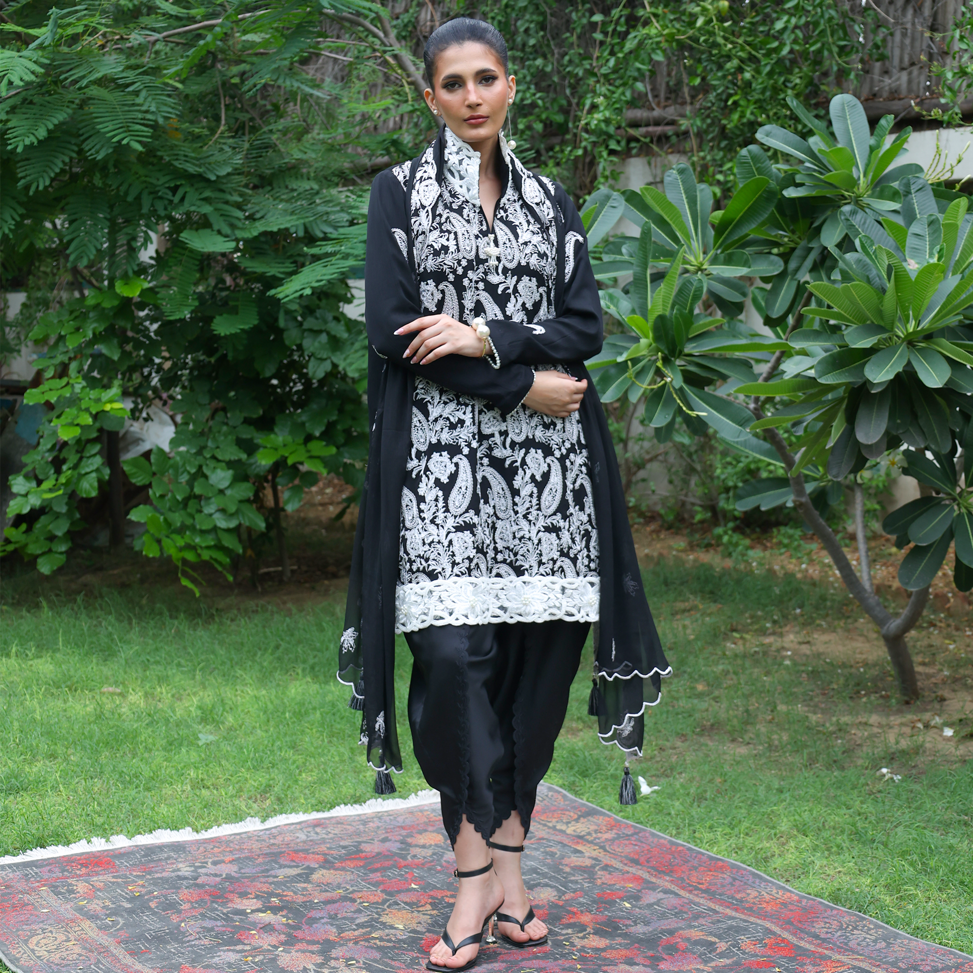 This black and white outfit features a short shirt with paisley embroidery and a high band collar. The shirt has pearl tassels and lace detailing for an elegant touch. It is paired with silk satin tulip pants and a chiffon embroidered dupatta, making it perfect for festive and semi-formal occasions.