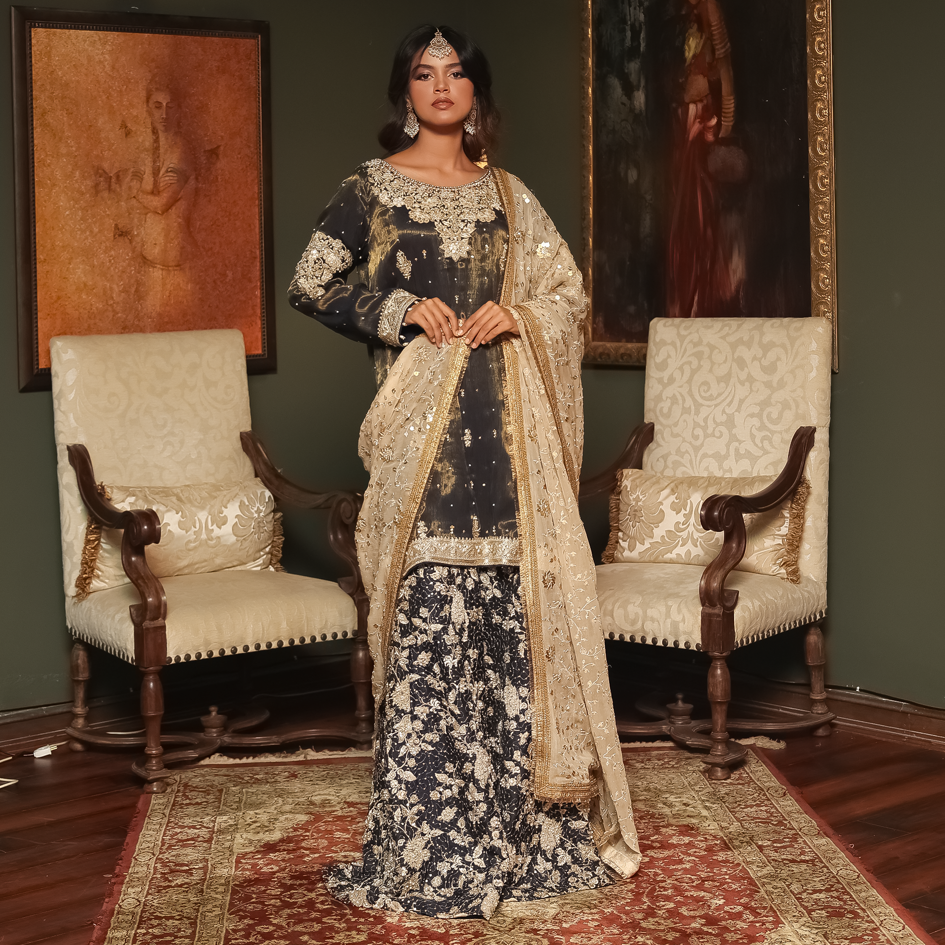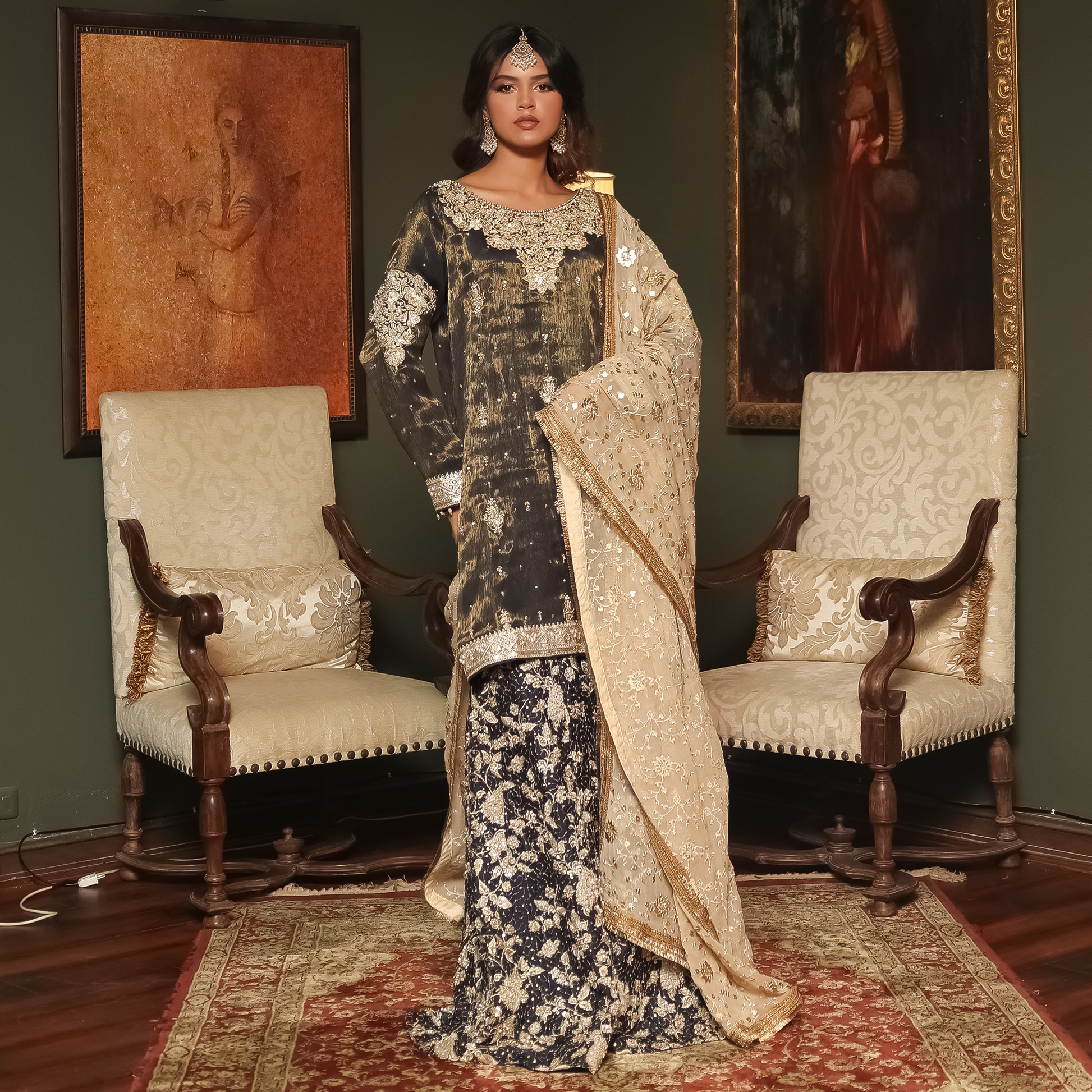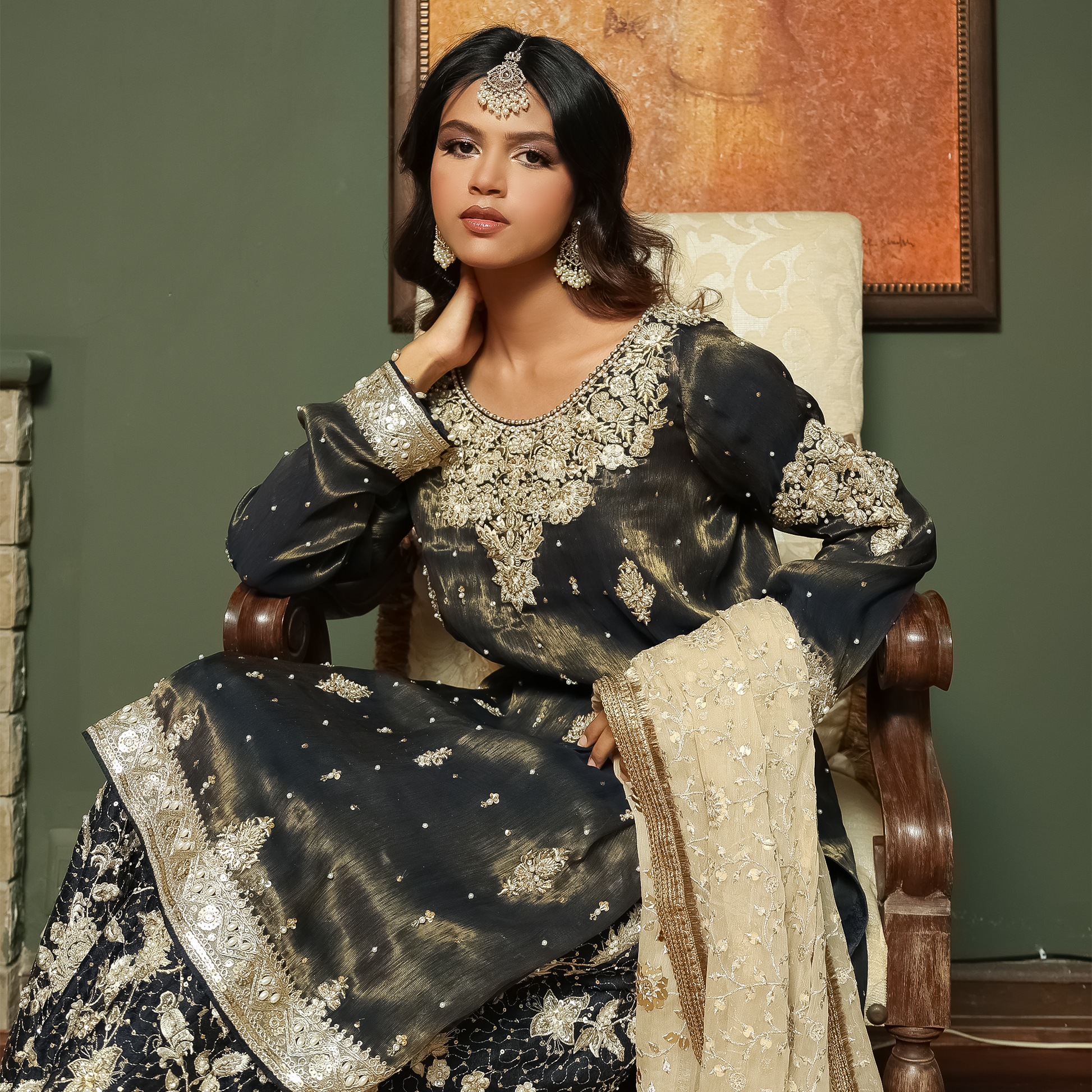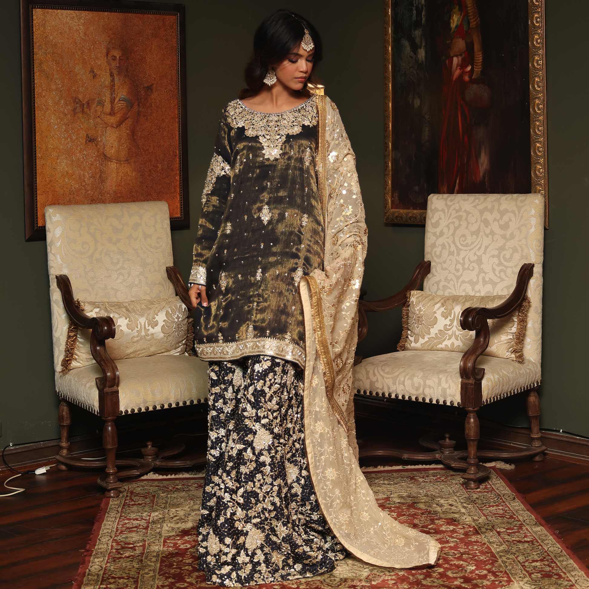 This elegant black mehsoori shirt features a round neckline adorned with intricate machine and hand embroidery on the neck, sleeves, and hemline. The outfit is beautifully enhanced with gota embroidery, adding a touch of festive charm. It is paired with jamawar embroidered palazzo pants for a luxurious look. The ensemble is completed with a beige chiffon dupatta, delicately detailed with sequin embroidery and gota finishing on all sides. Perfect for weddings, festive events, and formal occasions, this outfit blends traditional craftsmanship with modern elegance.