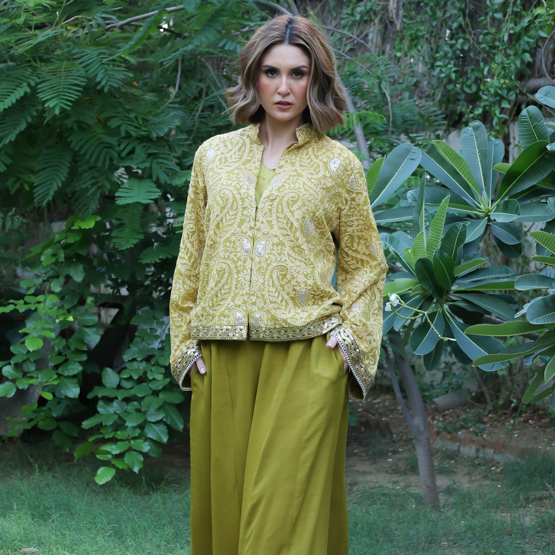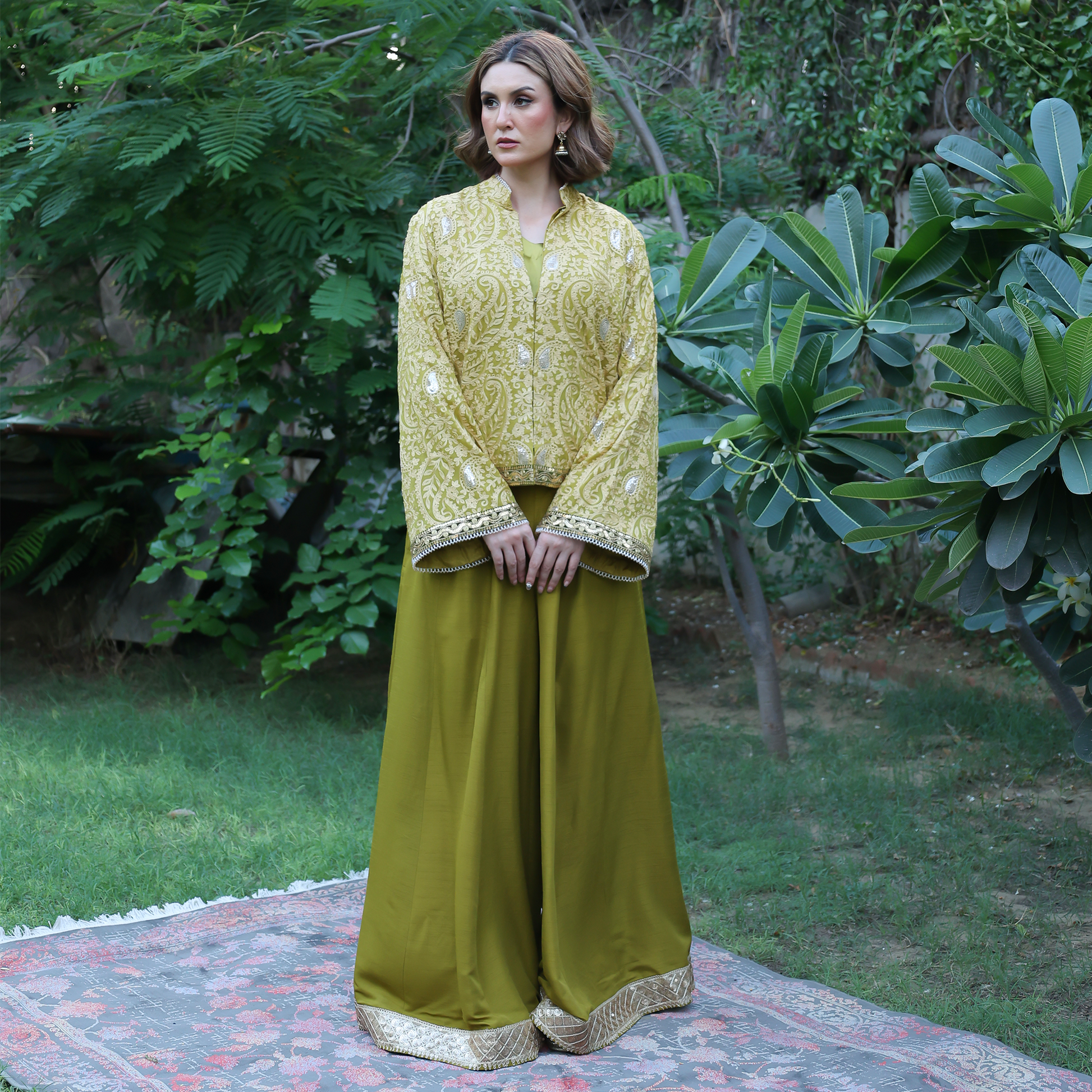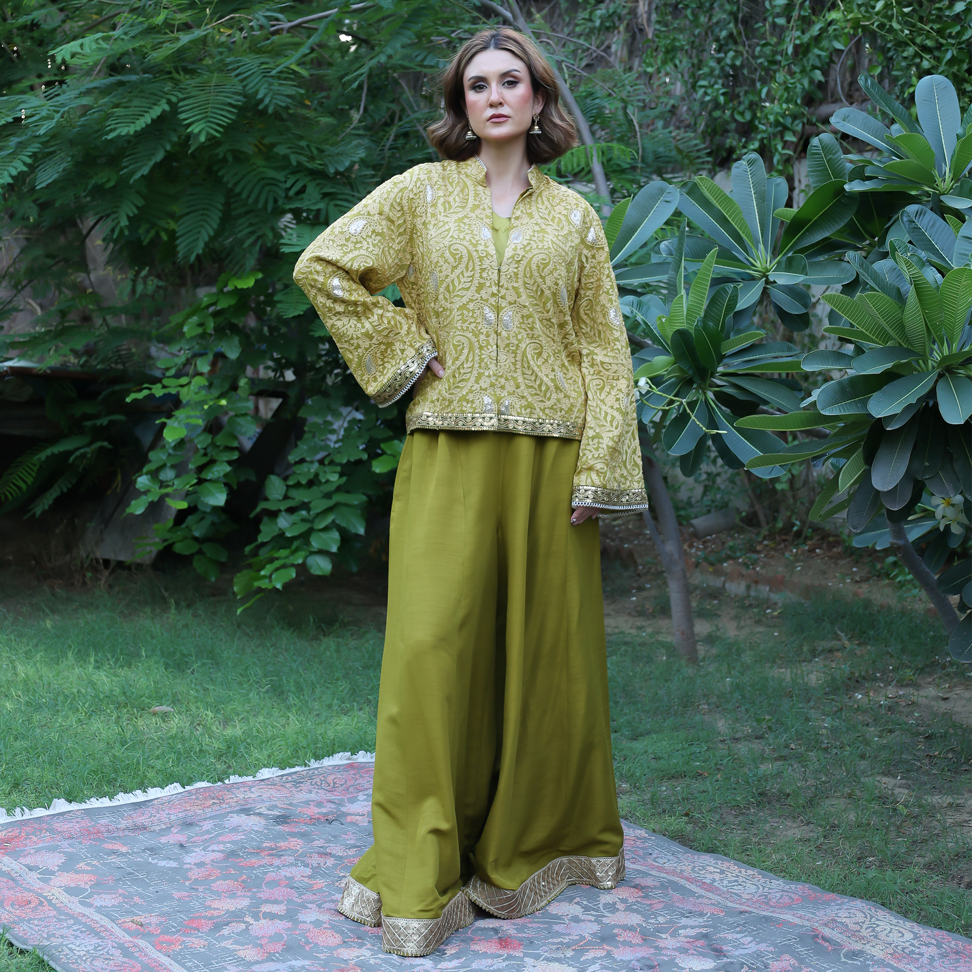 Crafted in a rich green tone, this band-collar jacket is beautifully embroidered in gold with lace and pearl embellishments on the sleeves and hem. The gota-detailed plazo pants add a festive charm, making it a flawless choice for Eid, mehndi functions, or cultural festivities. The combination of green and gold creates a refreshing and regal aesthetic that never goes out of style.