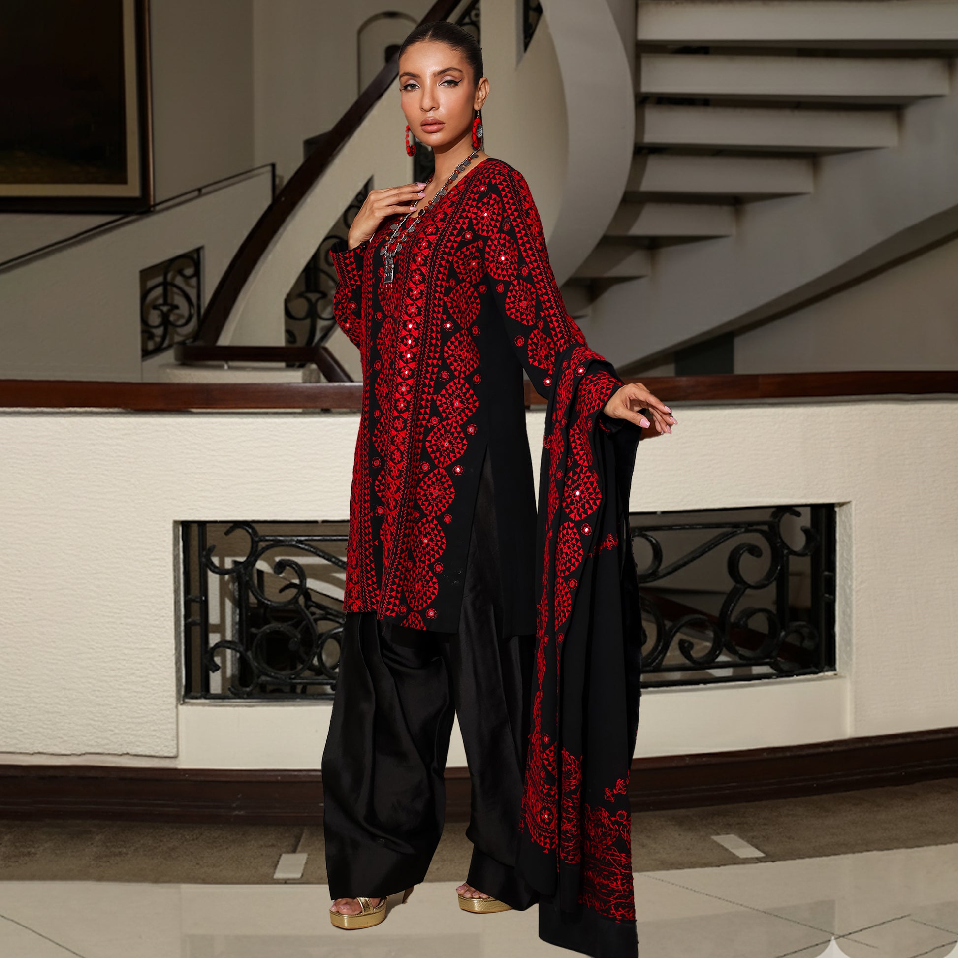 Chiffon Short Shirt with Balochi Embroidery – Traditional Elegance This short chiffon shirt is beautifully adorned with intricate Balochi embroidery, featuring a classic round neckline and straight sleeves for an effortlessly elegant silhouette. Paired with a Sheesha silk farshi shalwar, this ensemble perfectly balances cultural heritage and modern sophistication, making it ideal for festive and formal occasions.