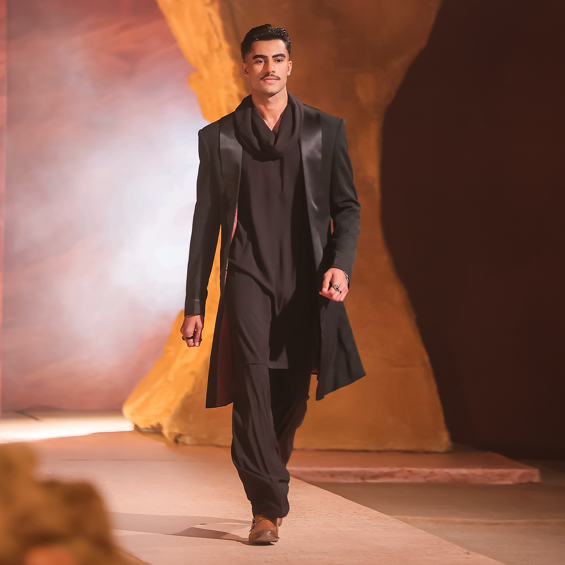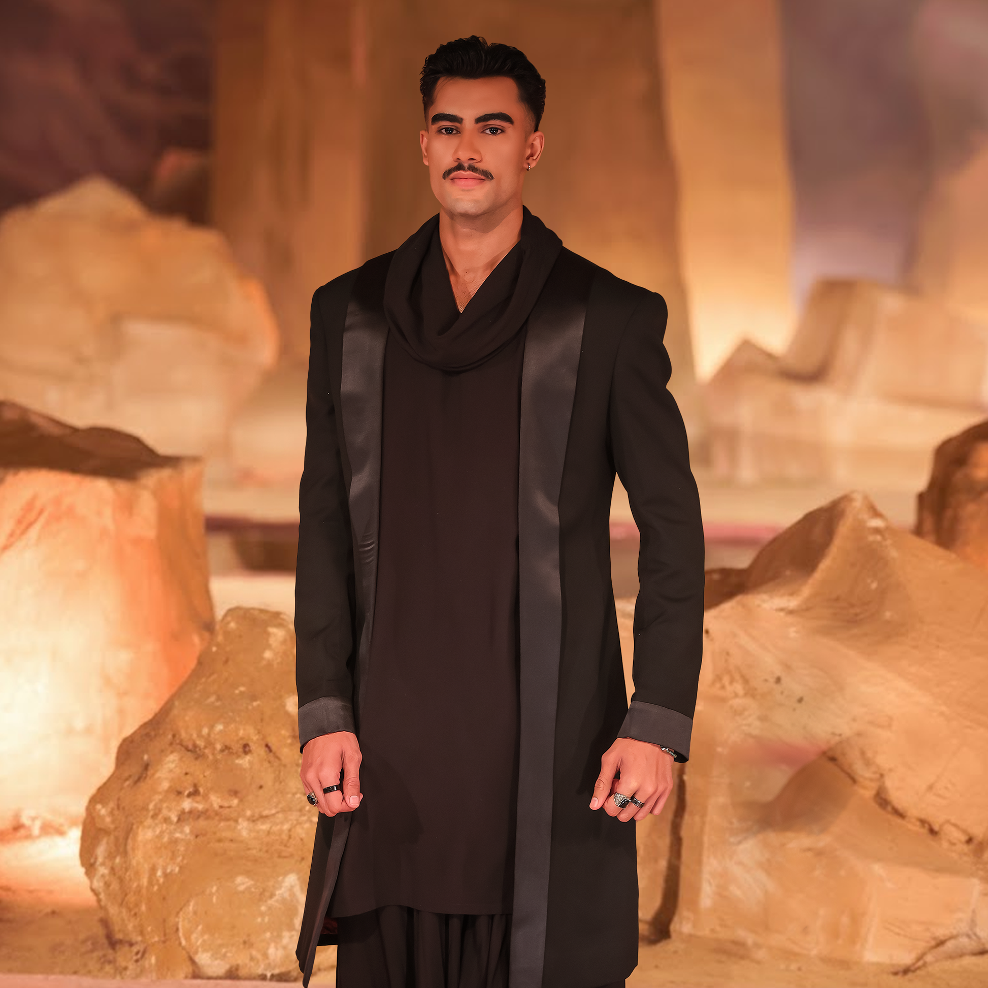 A black linen cowl neck shalwar kameez paired with a front-open black sherwani, detailed with sleek satin trims and the signature Nakhlistan silk lining. This look blends traditional tailoring with modern sophistication, perfect for formal occasions and evening wear.