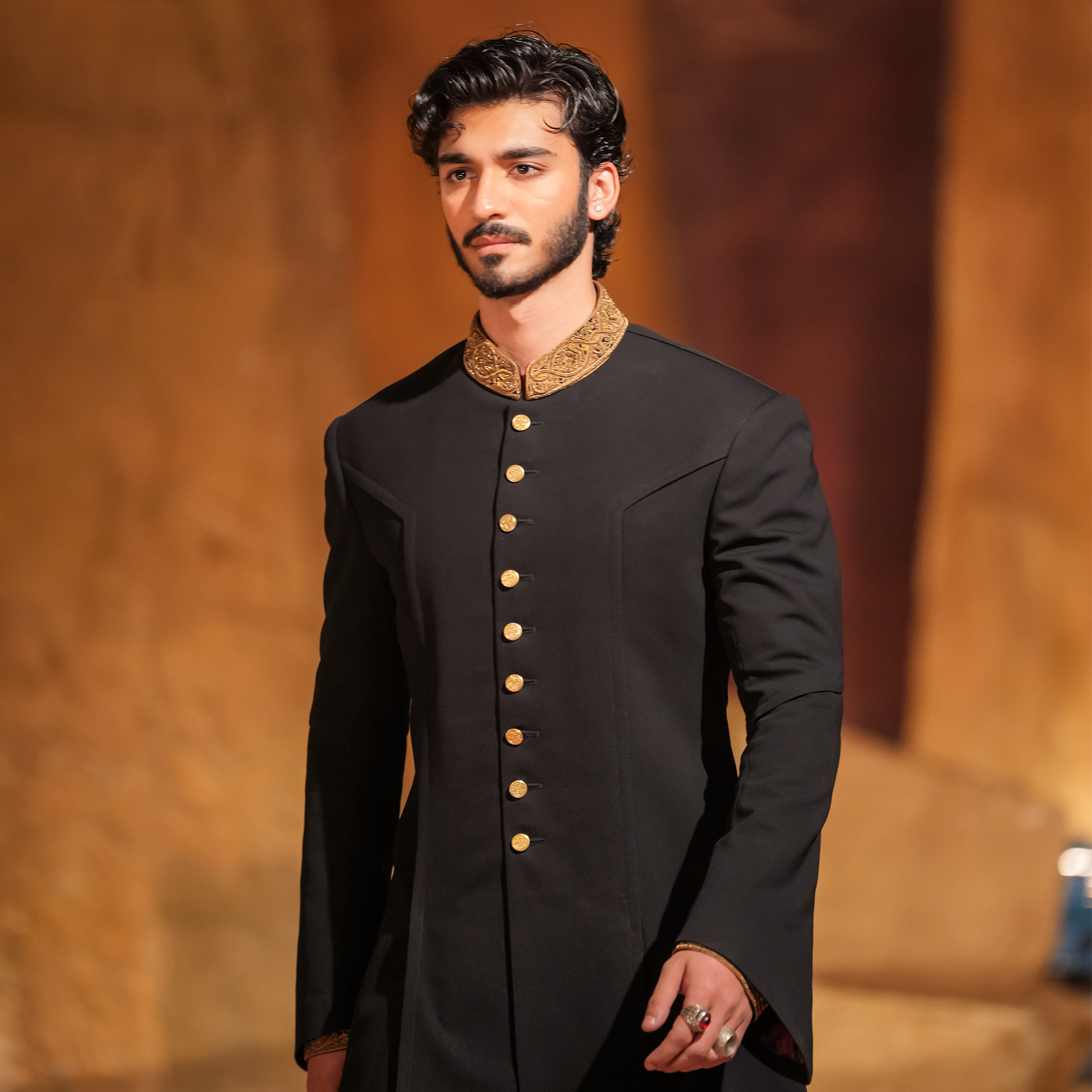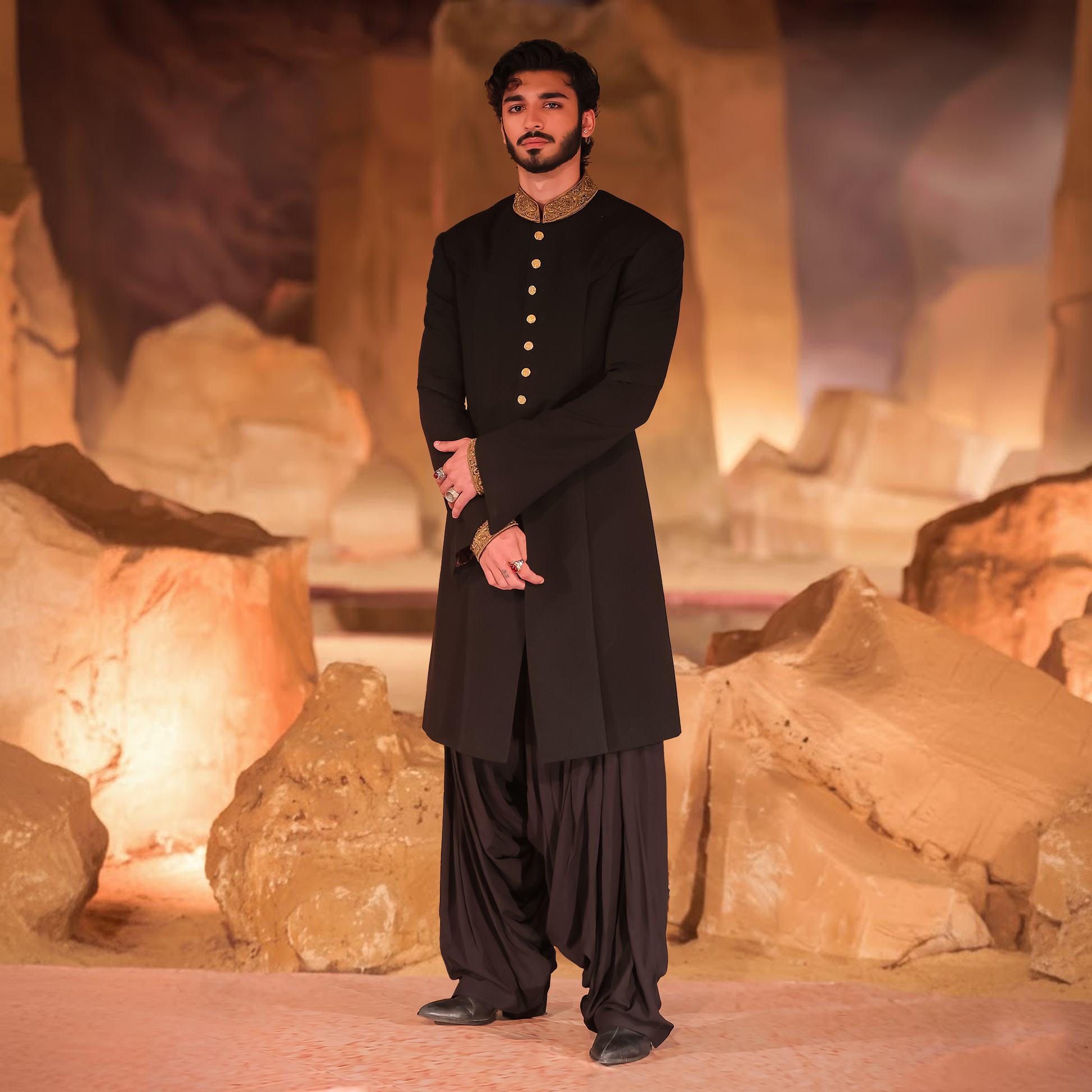 This black woven jamawar sherwani features an eight-paneled silhouette adorned with signature gold buttons and a hand-embroidered metallic gold collar. Paired with a heavy black gher shalwar, the look exudes royal elegance and timeless craftsmanship, making it perfect for weddings, festive occasions, and formal celebrations.