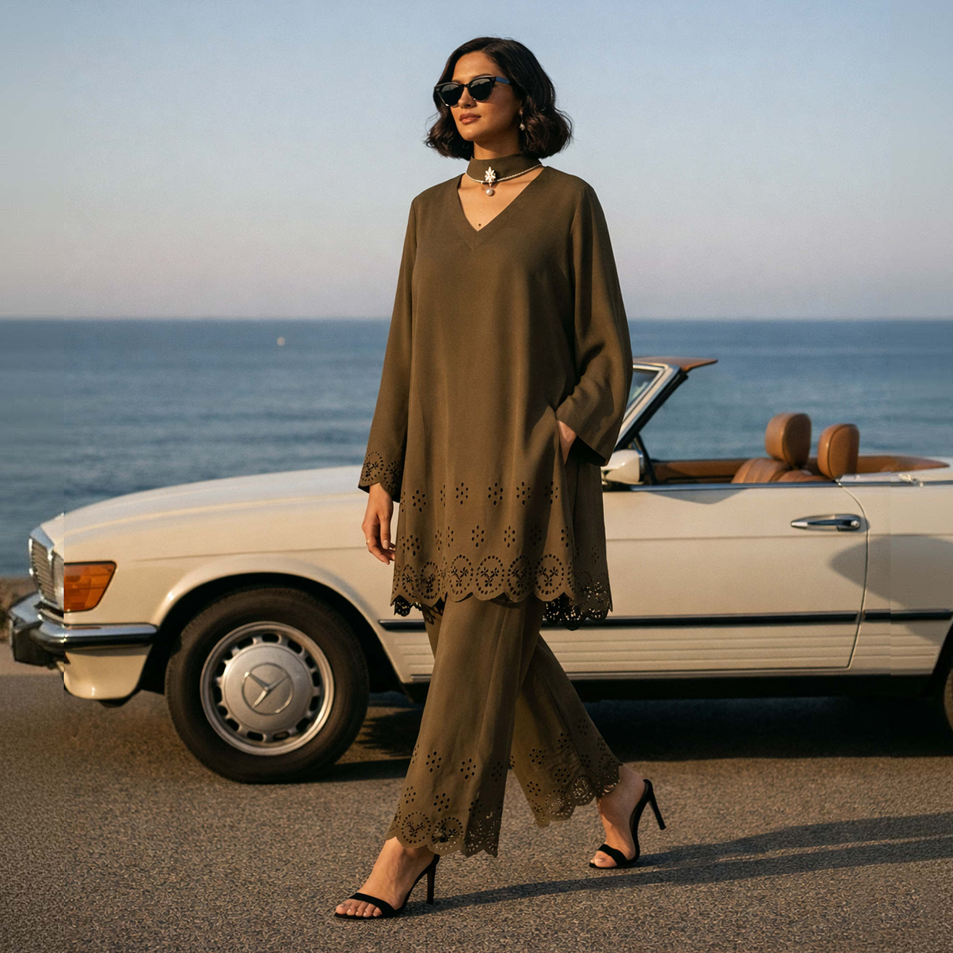 This Chocolate Brown outfit features a short straight shirt with slit open sleeves and a V-neckline with band collar, styled with straight pants for a modern, minimal look. Perfect for casual gatherings, it brings effortless grace and comfort