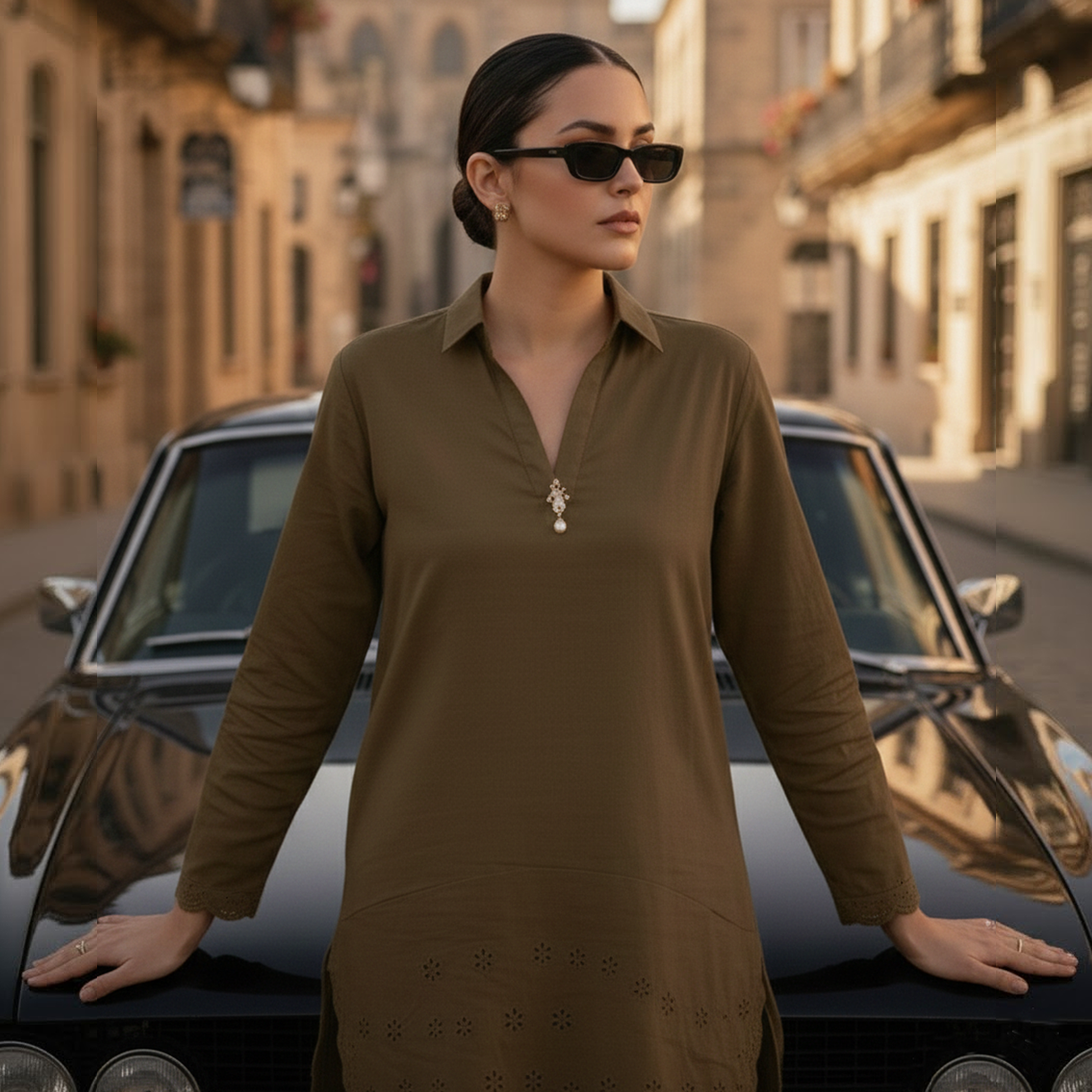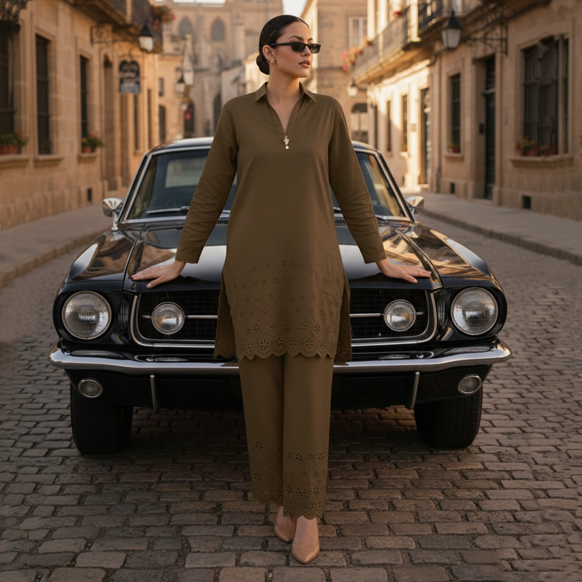 This chocolate brown outfit features a short straight shirt with a slit shirt collar, floral buttons, and cuffed sleeves for a refined yet relaxed look. Designed with two side pockets and paired with straight pants, it’s perfect for everyday wear, blending elegance with ease.
