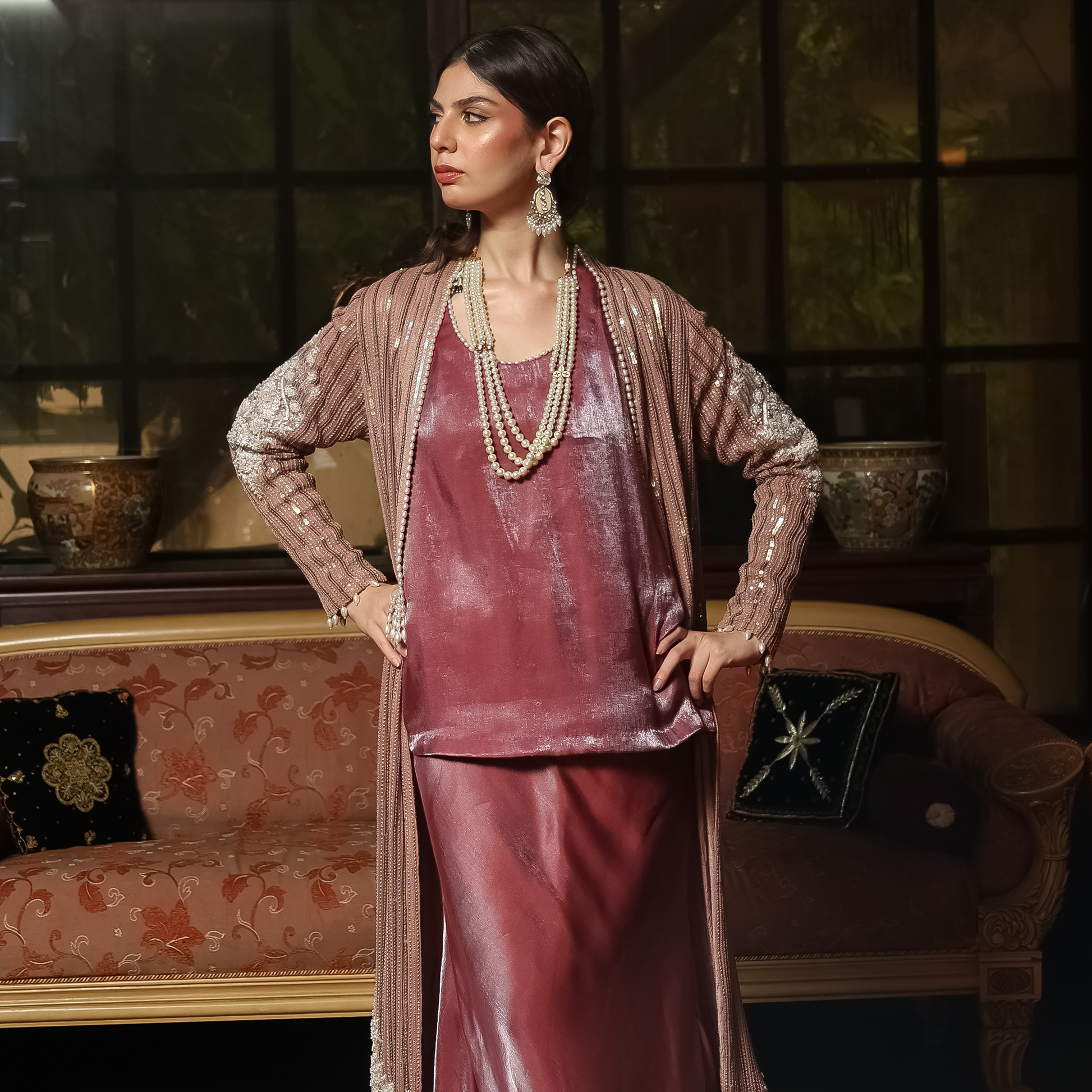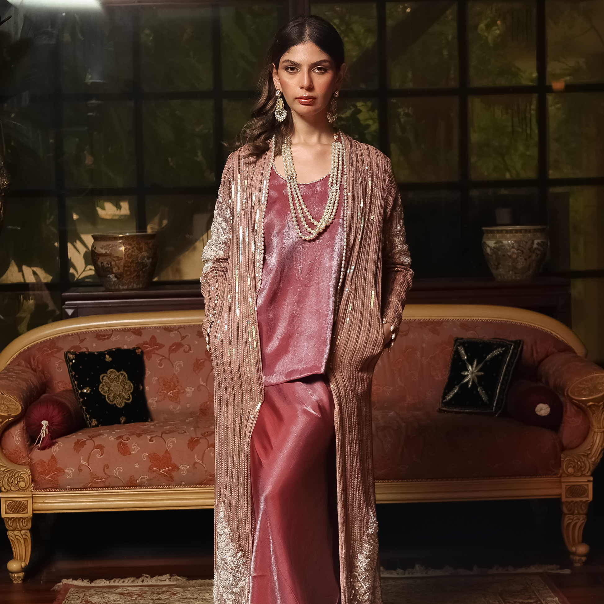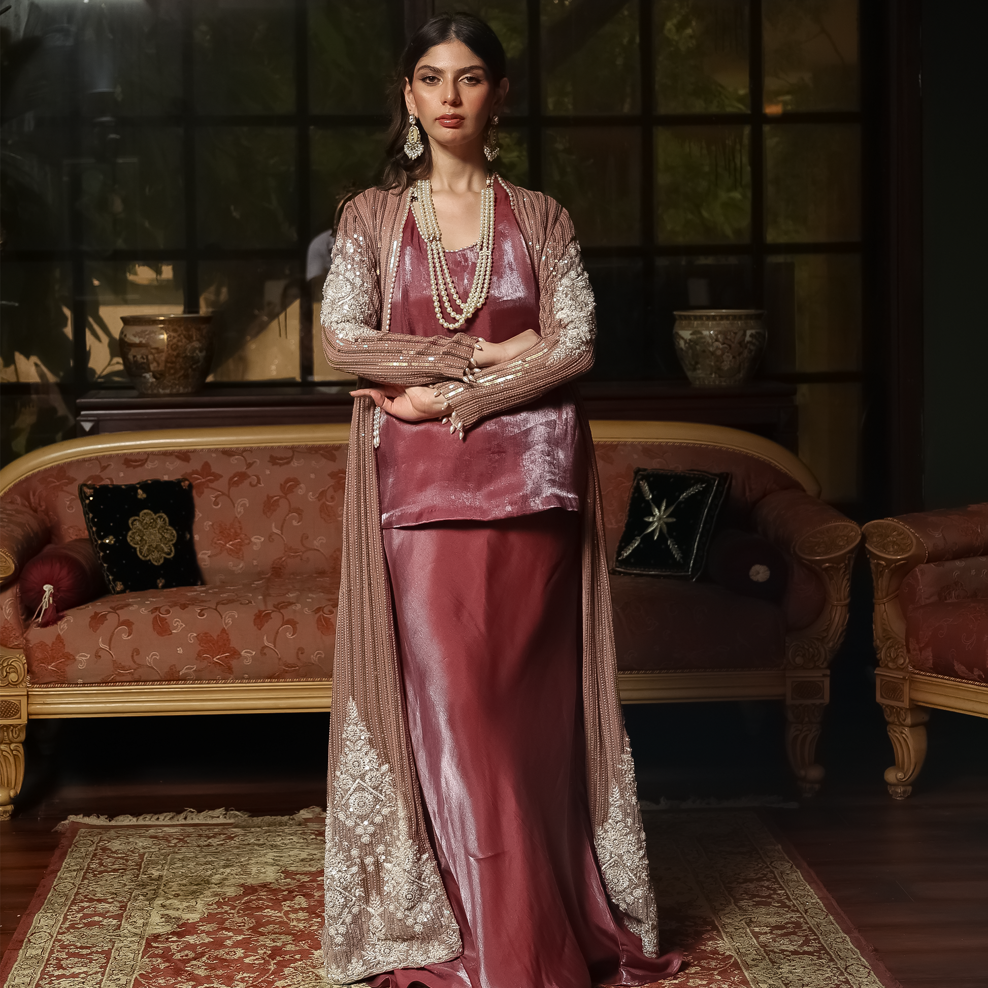 Crimson red long jacket adorned with sequin and cut dana embroidery, exuding refined glamour. Designed with full sleeves finished with delicate pearl detailing on the hems. Paired with a matching crimson red inner and a coordinated skirt, creating a sophisticated and cohesive festive look.