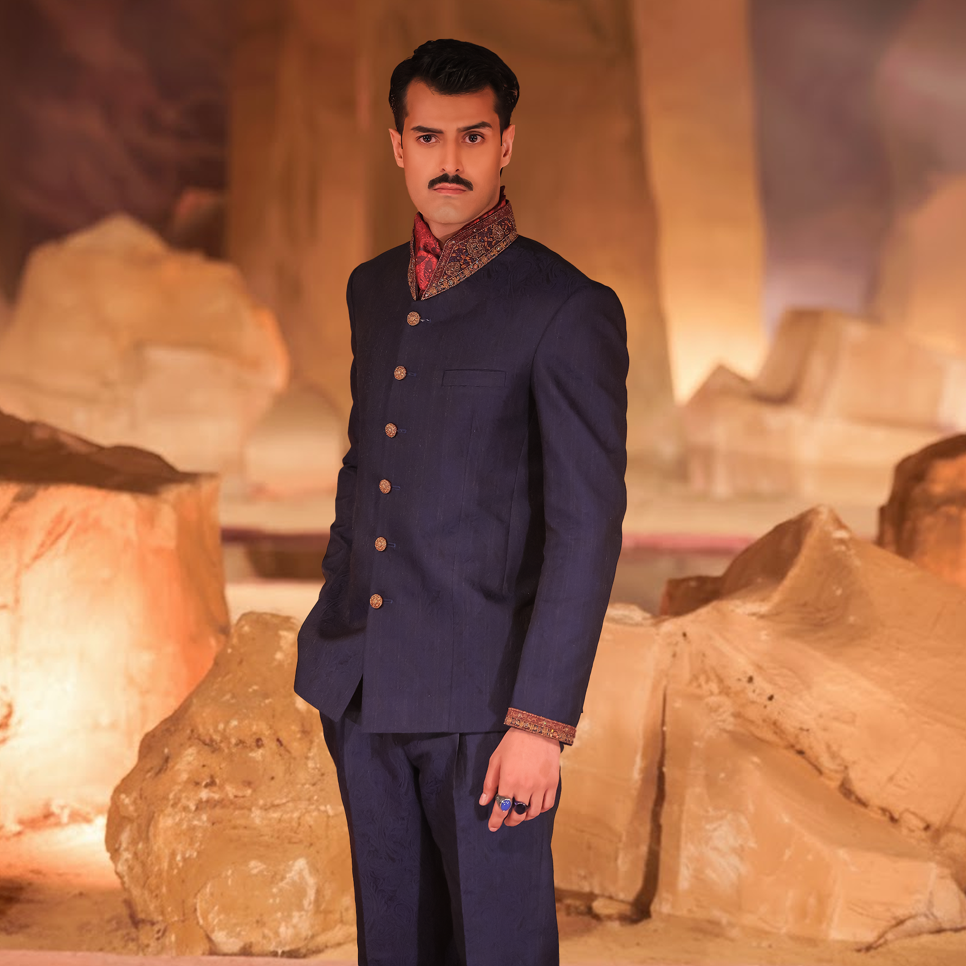 A classic deep blue jamawar prince jacket exuding timeless sophistication. It features copper signature metal buttons, a hand-embroidered MF collar, and delicately embroidered cuffs, showcasing refined craftsmanship. Paired with matching blue textured jamawar pants, this ensemble is the perfect choice for formal events, weddings, and festive occasions.