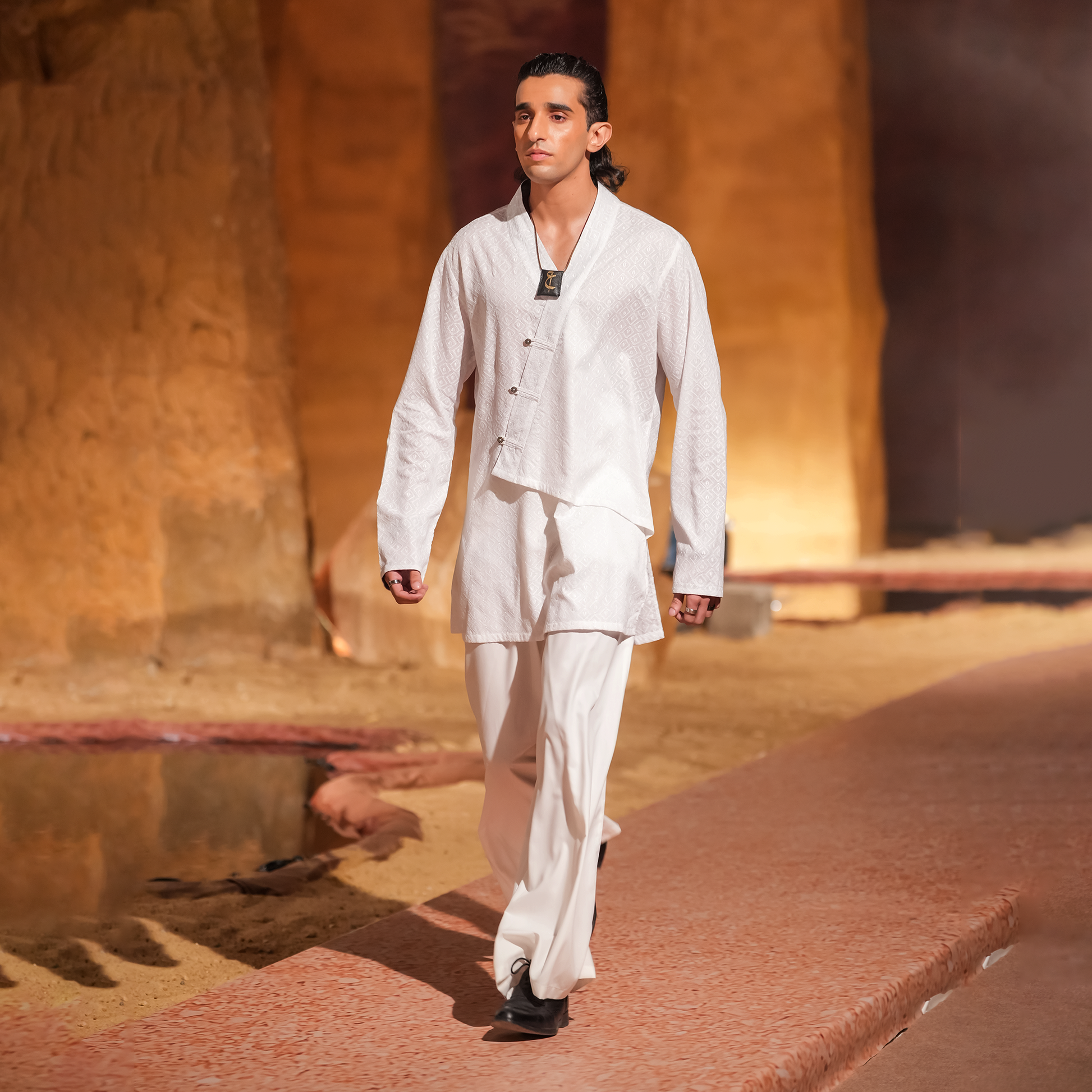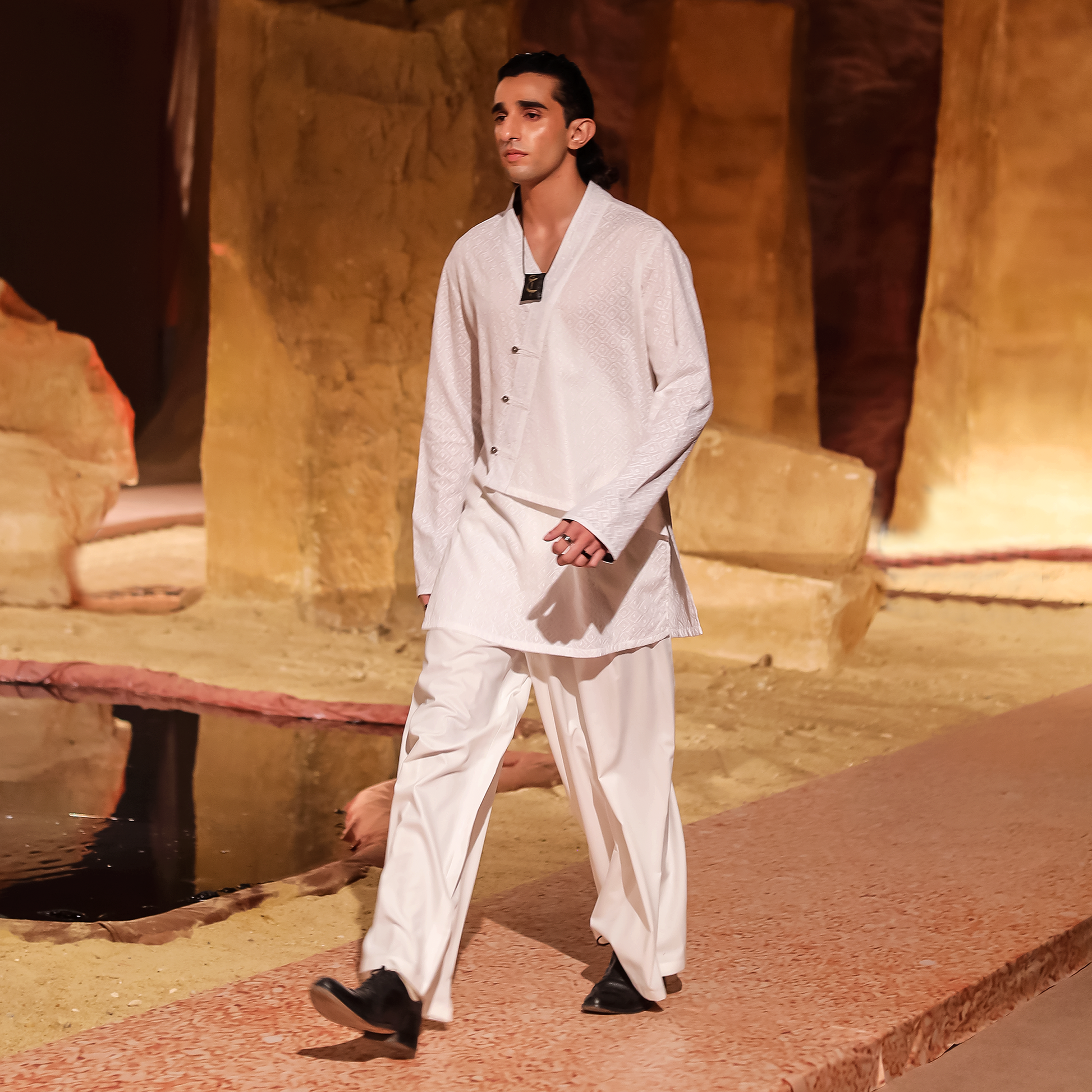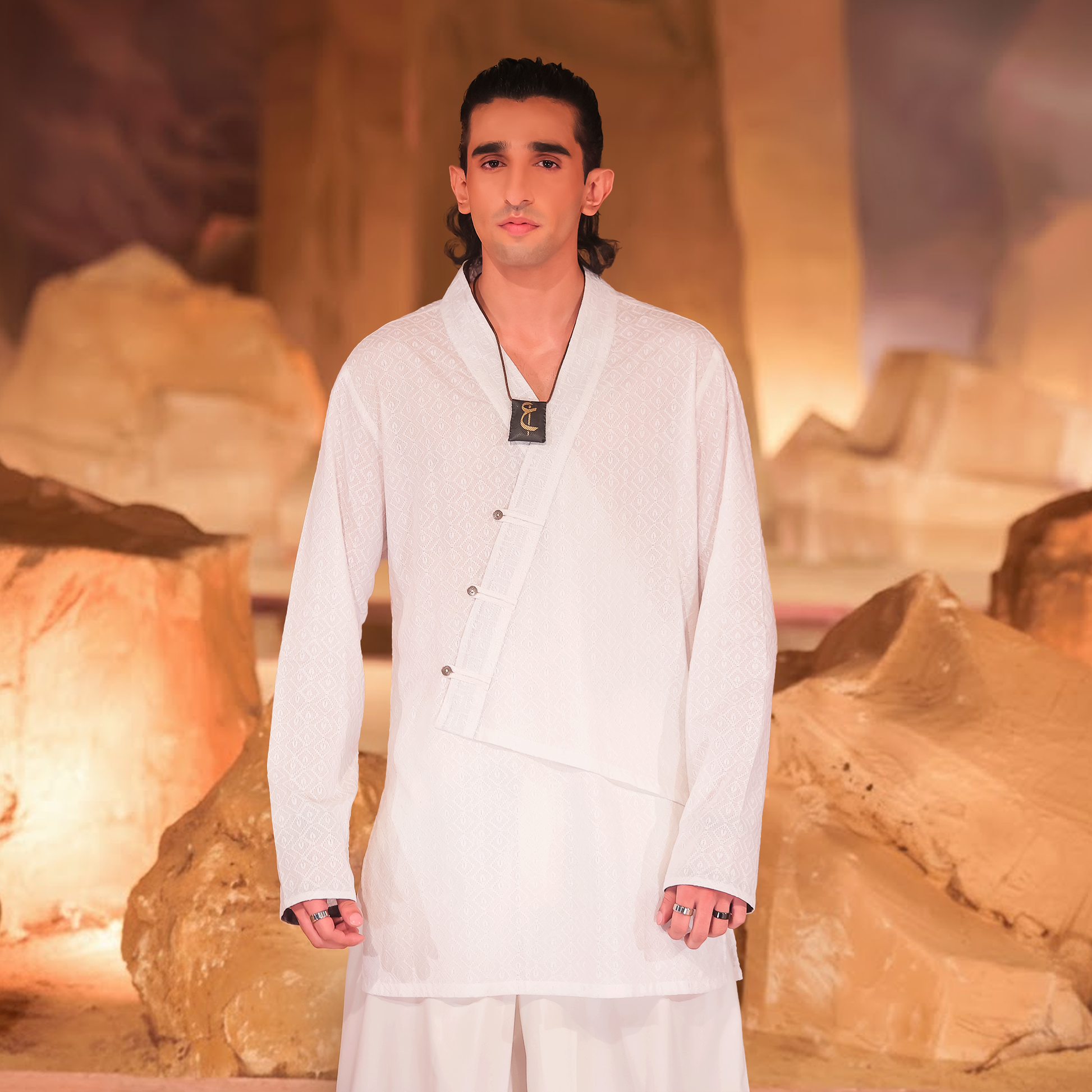A white cotton Chikankari top featuring a looped Chinese collar with an overlapping front panel and rounded sleeves for a soft, contemporary silhouette. Paired with wide-leg PV trousers, this ensemble blends traditional craftsmanship with modern minimalism, perfect for refined everyday wear