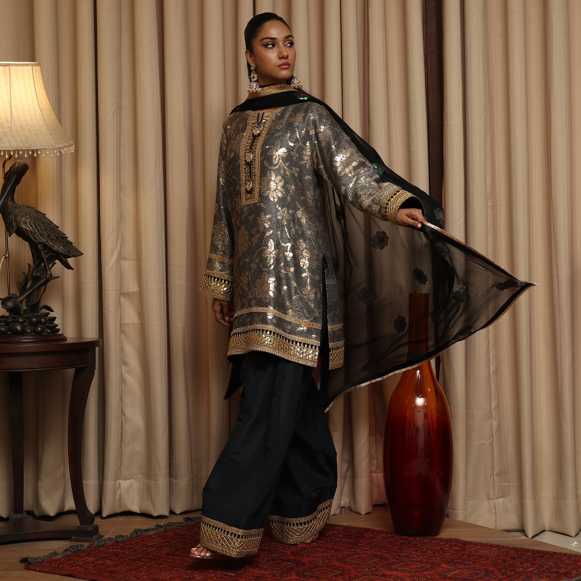 Chiffon Embroidered Short Shirt Set – Timeless Festive Elegance This elegant short chiffon embroidered shirt features a round neckline adorned with hand-stitched gota work and handmade buttons, exuding refined craftsmanship. The gota detailing on the hem and sleeves adds a graceful touch, while the ensemble is completed with a luxurious raw silk farshi shalwar and a chiffon dupatta. Perfect for festive occasions and celebrations, this outfit beautifully blends traditional artistry with modern sophistication.