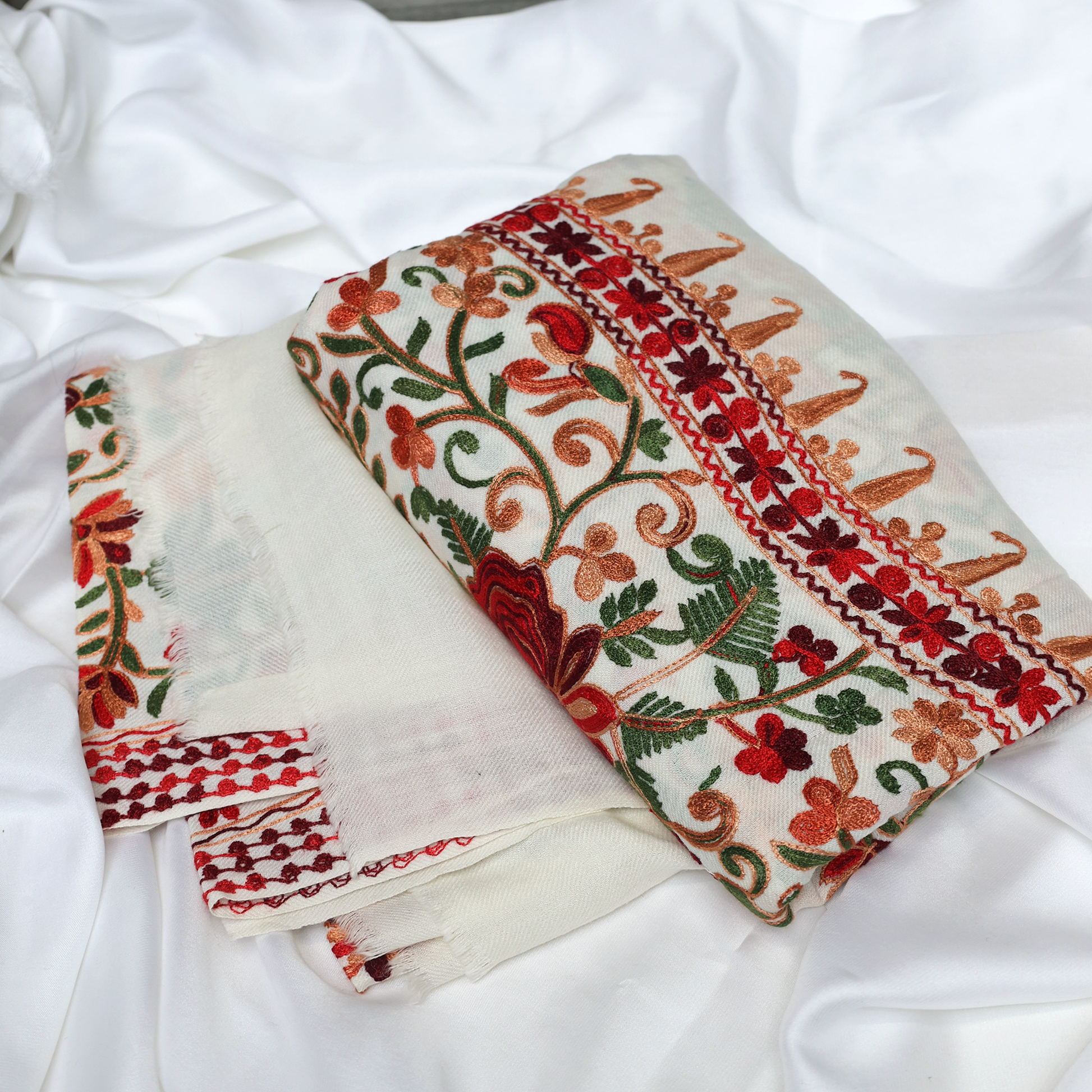 Amir Adnan White Machine-Embroidered Shawl. Luxurious, soft woolen fabric featuring authentic, vibrant Kashmiri Aari embroidery. This generous (90" x 54") shawl is the perfect blend of warmth, tradition, and style. A must-have accessory