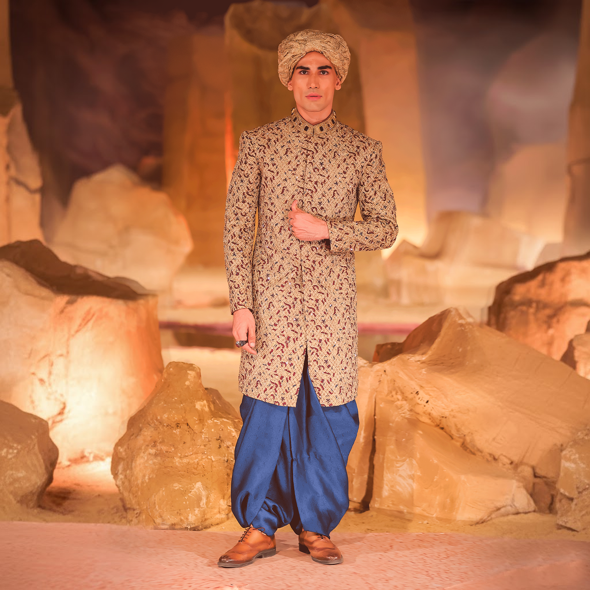This luxurious gold woven jamawar sherwani features intricate all-over embroidery in the brand’s signature overlapping pattern, blending tonal gold with plum and turquoise threadwork. The collar is exquisitely hand-embellished with semi-precious rubies and onyx, adding a regal touch. Paired with a turquoise dhoti shalwar crafted from matching jamawar and complemented by a gold embroidered turban, this ensemble embodies royal elegance — perfect for weddings, receptions, and grand festive occasions.