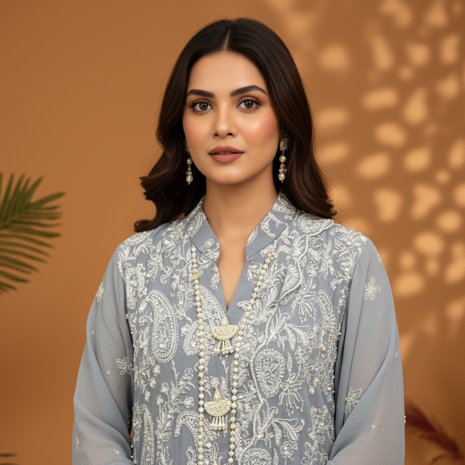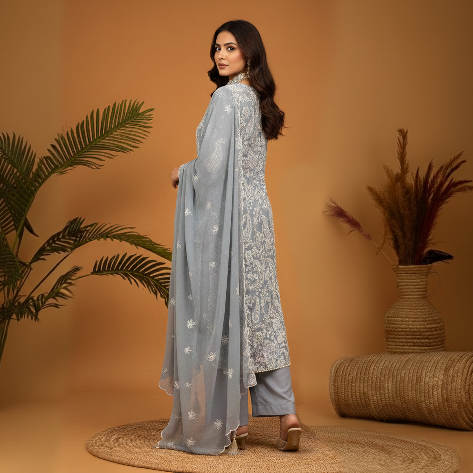 This elegant grey outfit features band collar neckline with long shirt adorned with paisley embroidery and hand-to-machine embellishment throughout with button detail. The design is completed with pearl-detailed lace finishing, satin silk wide-leg pants, and a chiffon embroidered dupatta that adds a soft, graceful touch. Perfect for formal occasions, festive wear, and wedding events, this ensemble combines traditional craftsmanship with modern sophistication