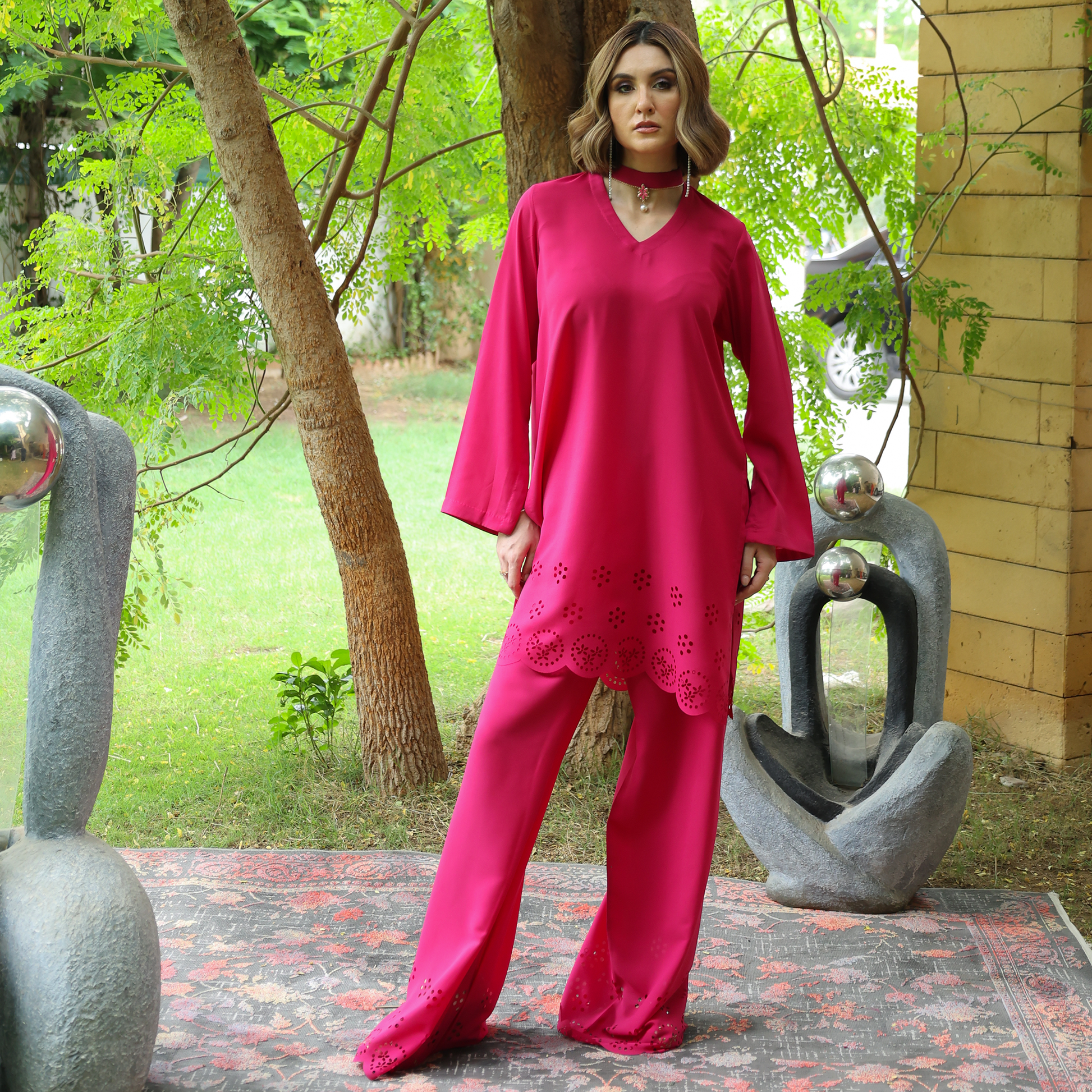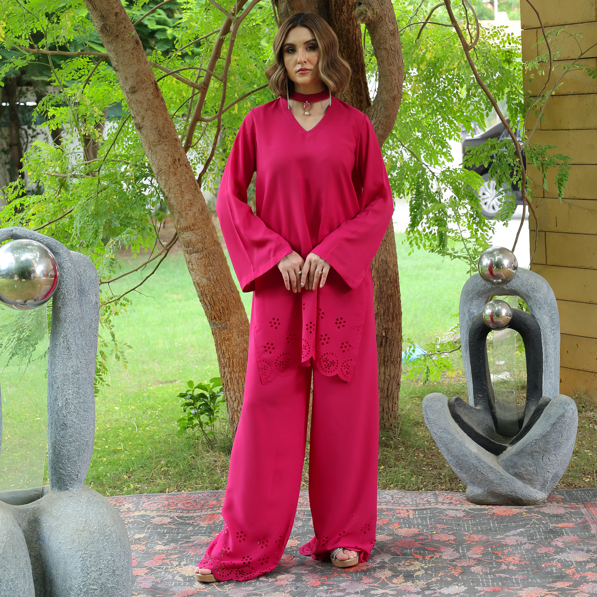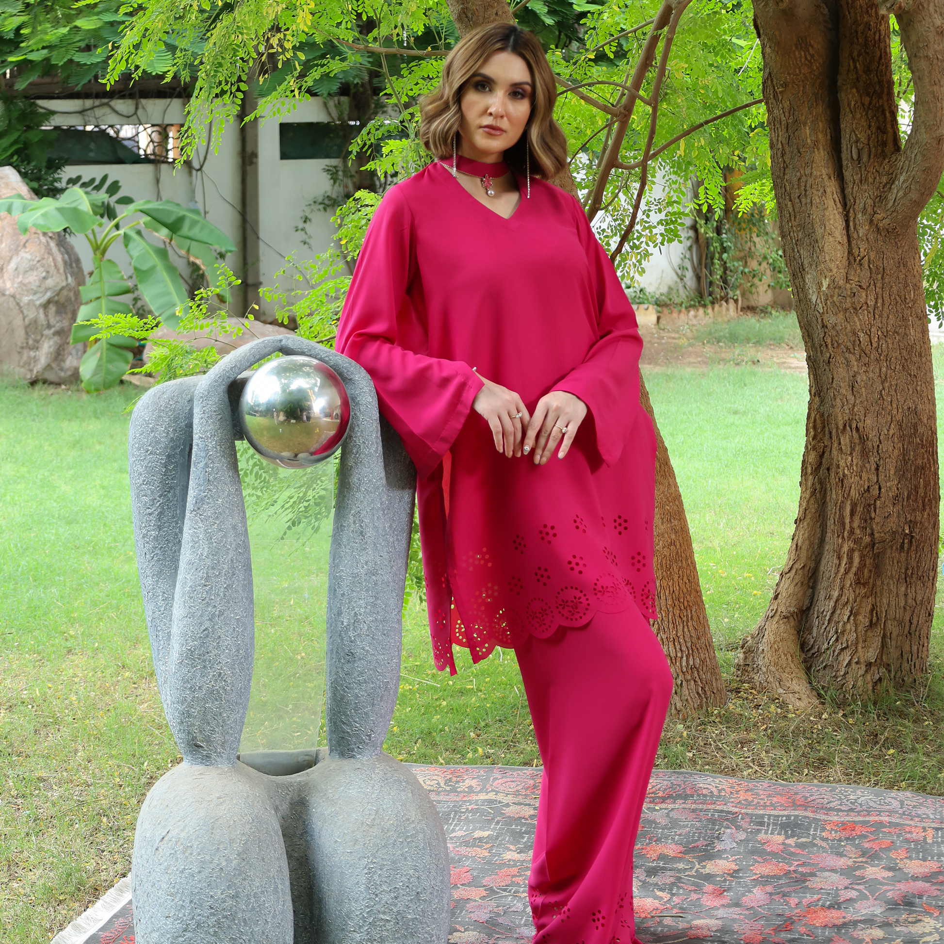 This fuchsia pink outfit features a short straight shirt with slit open sleeves and a V-neckline with band collar, styled with straight pants for a modern, minimal look. Perfect for casual gatherings, it brings effortless grace and comfort.