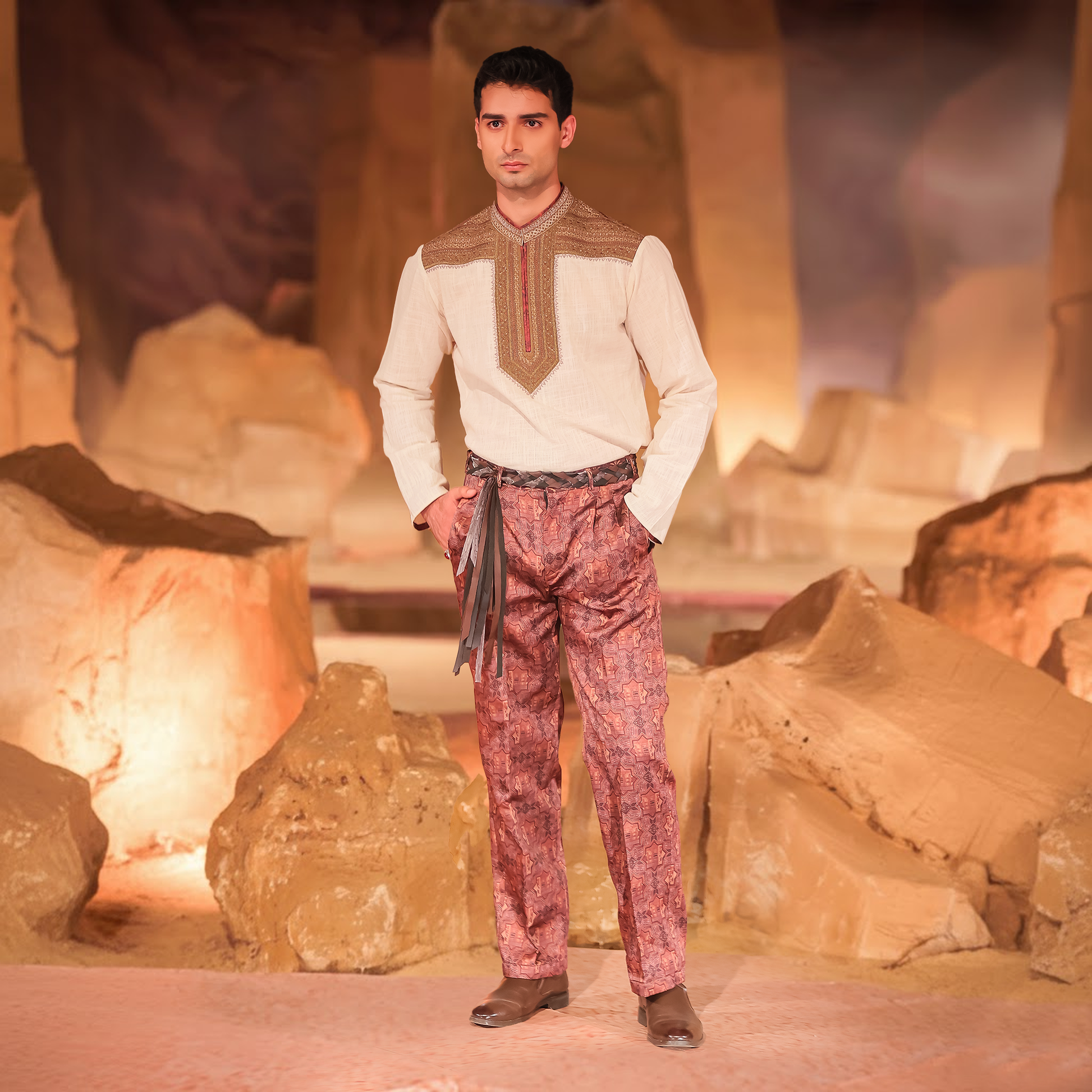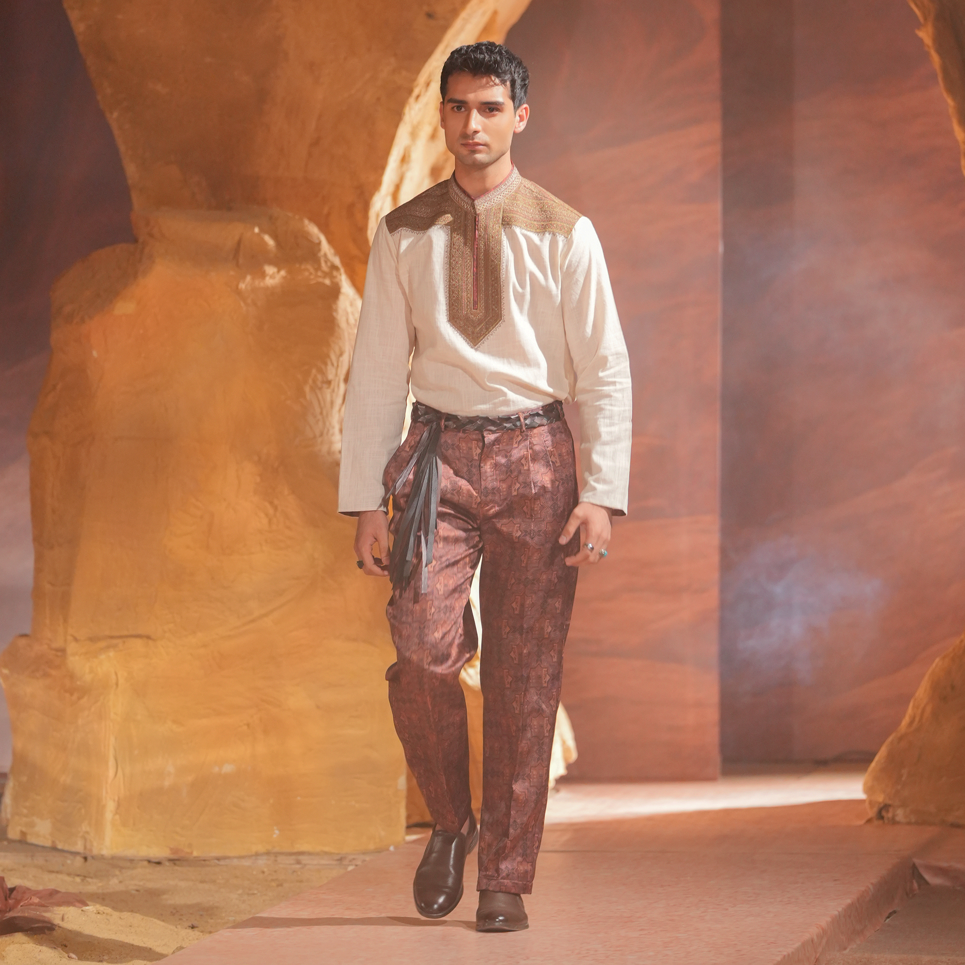 This Irish linen shirt features elegant embroidery on the collar, placket, and shoulders, enhanced with signature trims that reflect refined craftsmanship. Paired with satin Nakhlistan straight-cut pants and a brown leather twill belt, this look offers a perfect balance of luxury and understated sophistication. Ideal for formal gatherings, festive wear, or elegant everyday dressing.