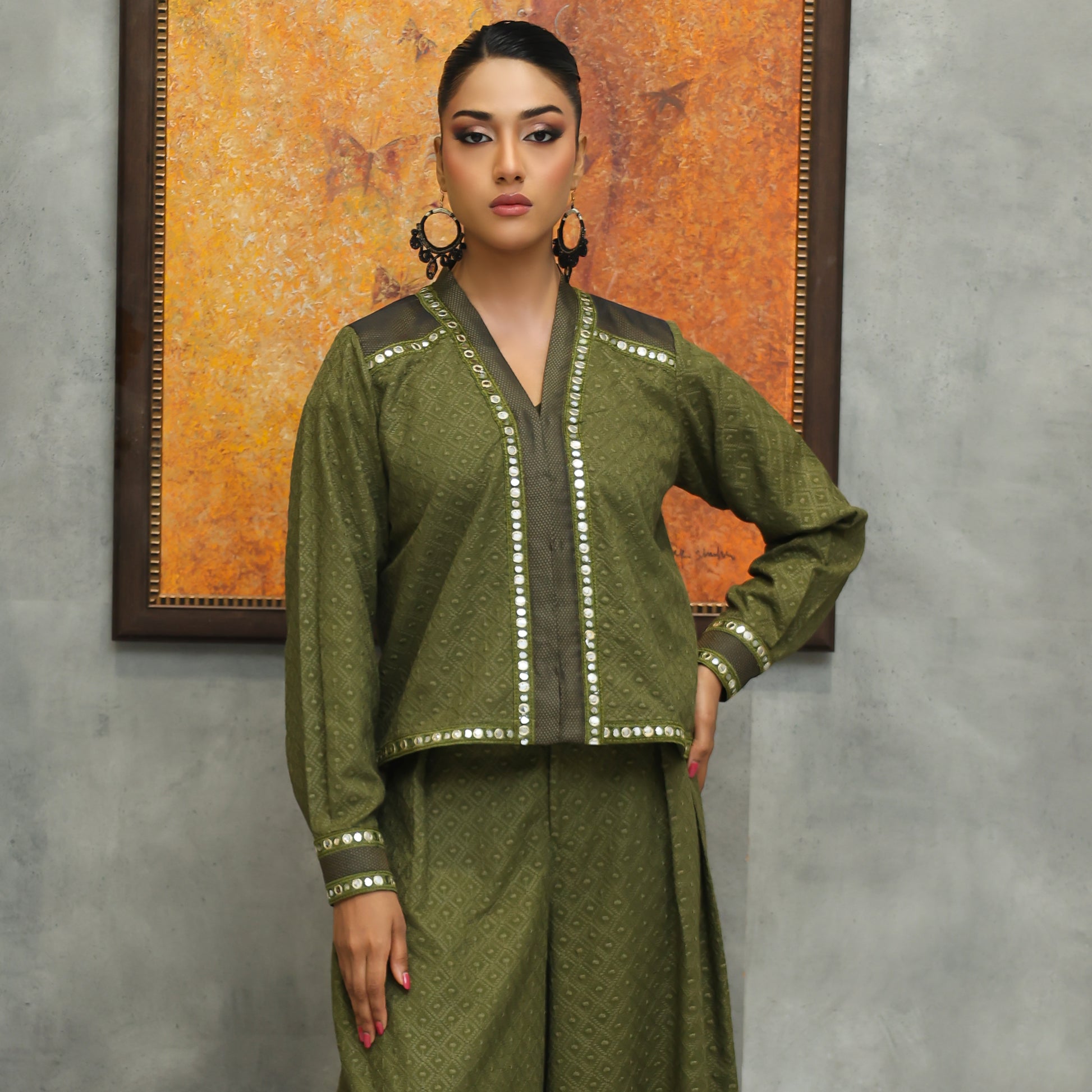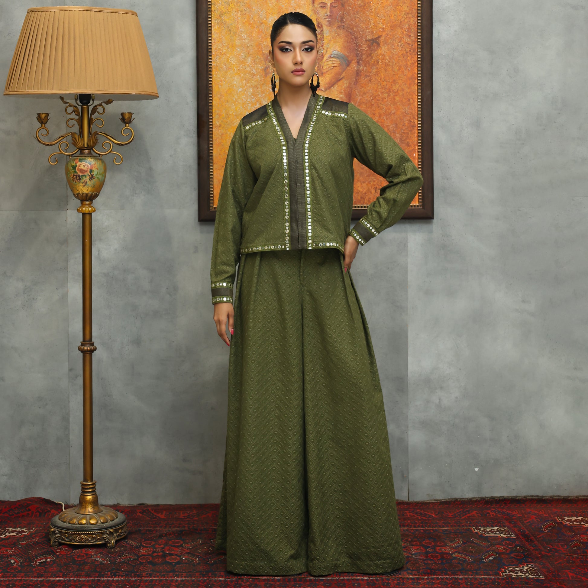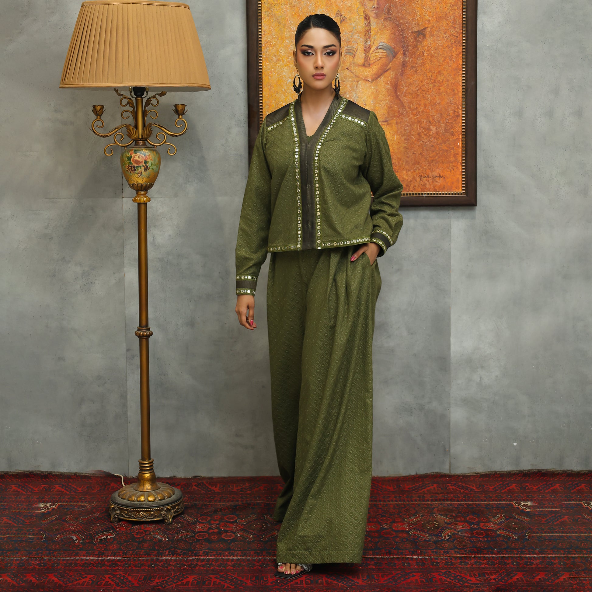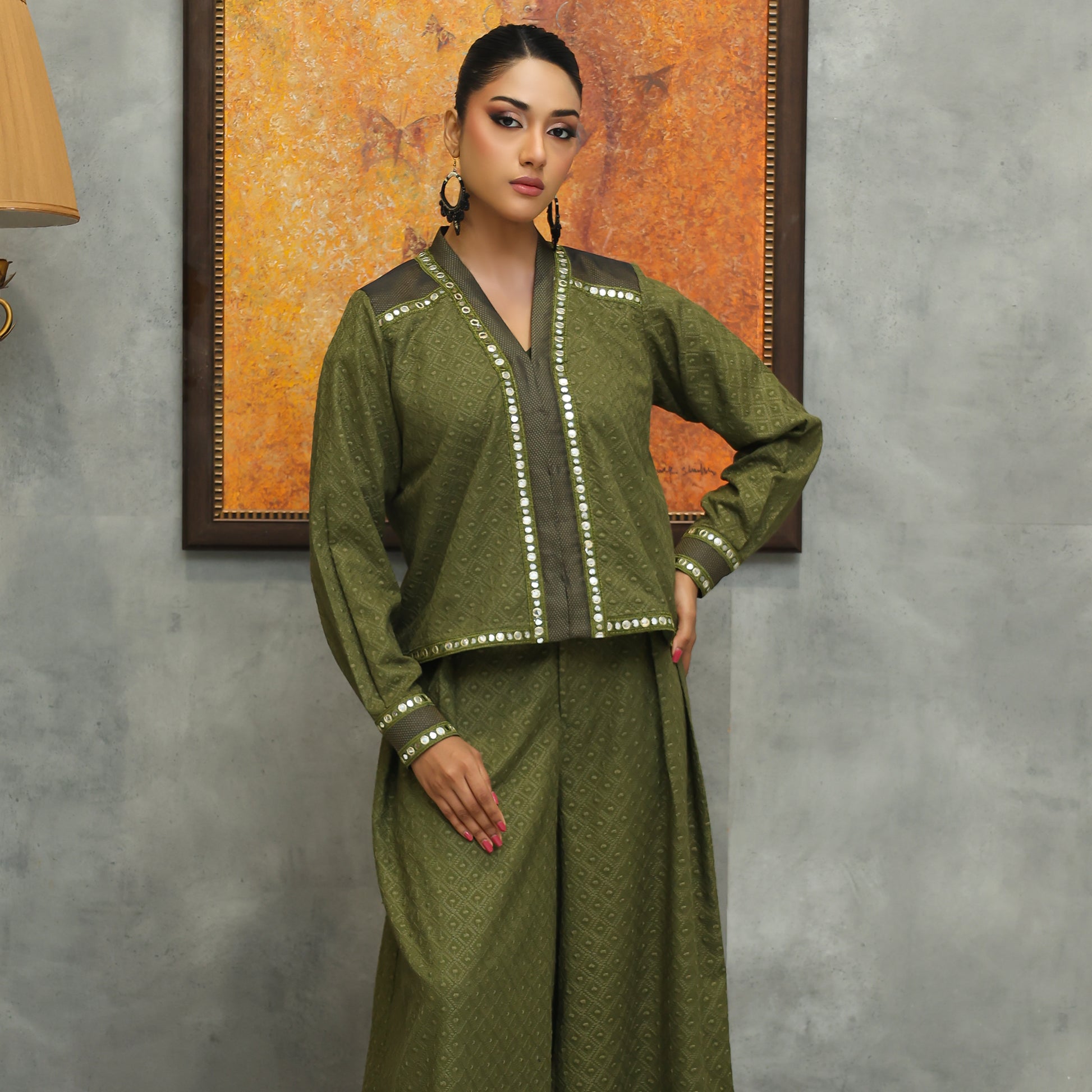 Open-Front Chiffle Co-ords with V-Neckline & Wide-Leg Pants A stylish open-front chiffle co-ords set featuring a V-neckline and lace detailing on the sleeves and jacket. Paired with wide-leg pants, this ensemble offers a chic, modern look perfect for festive gatherings, parties, and elegant day-to-evening wear.