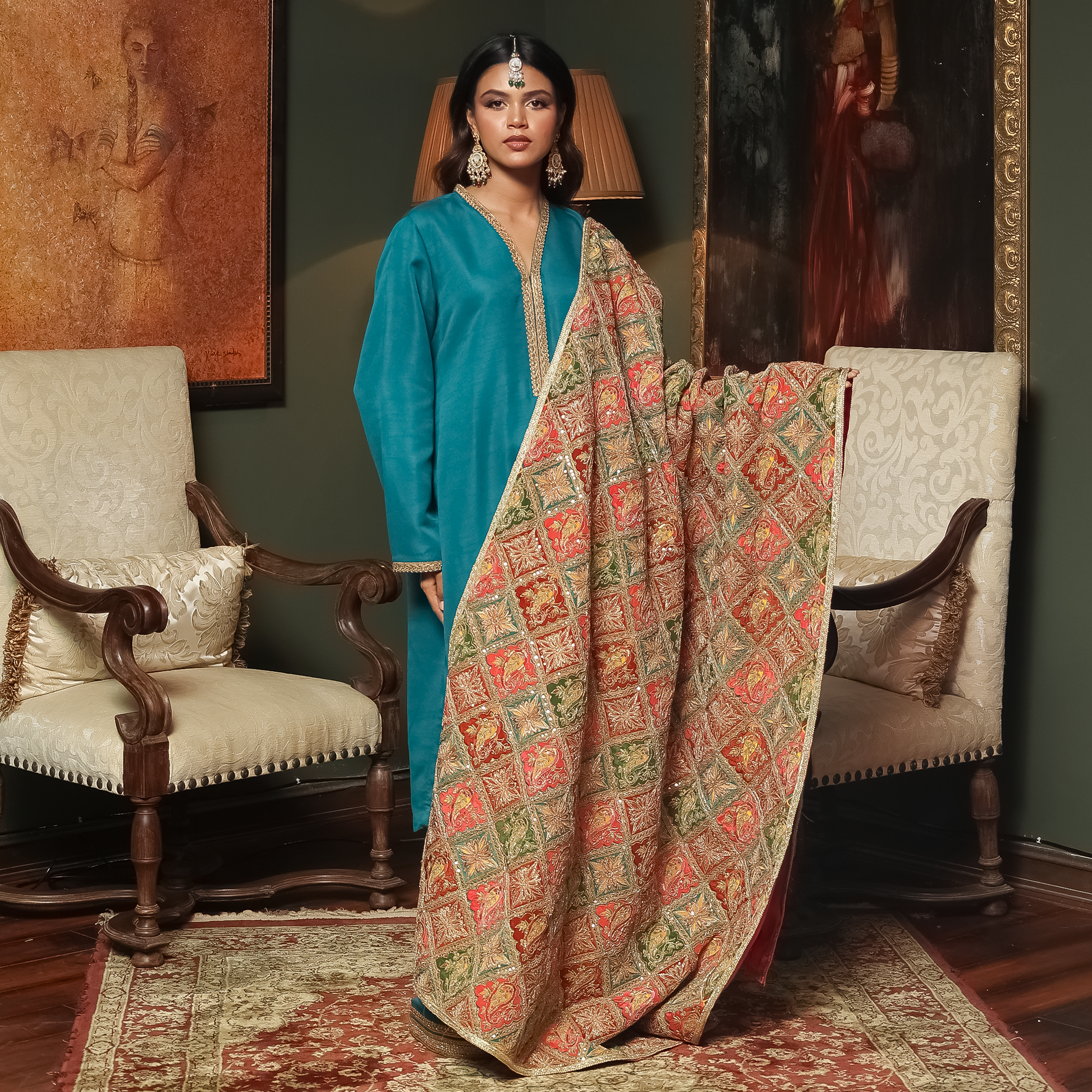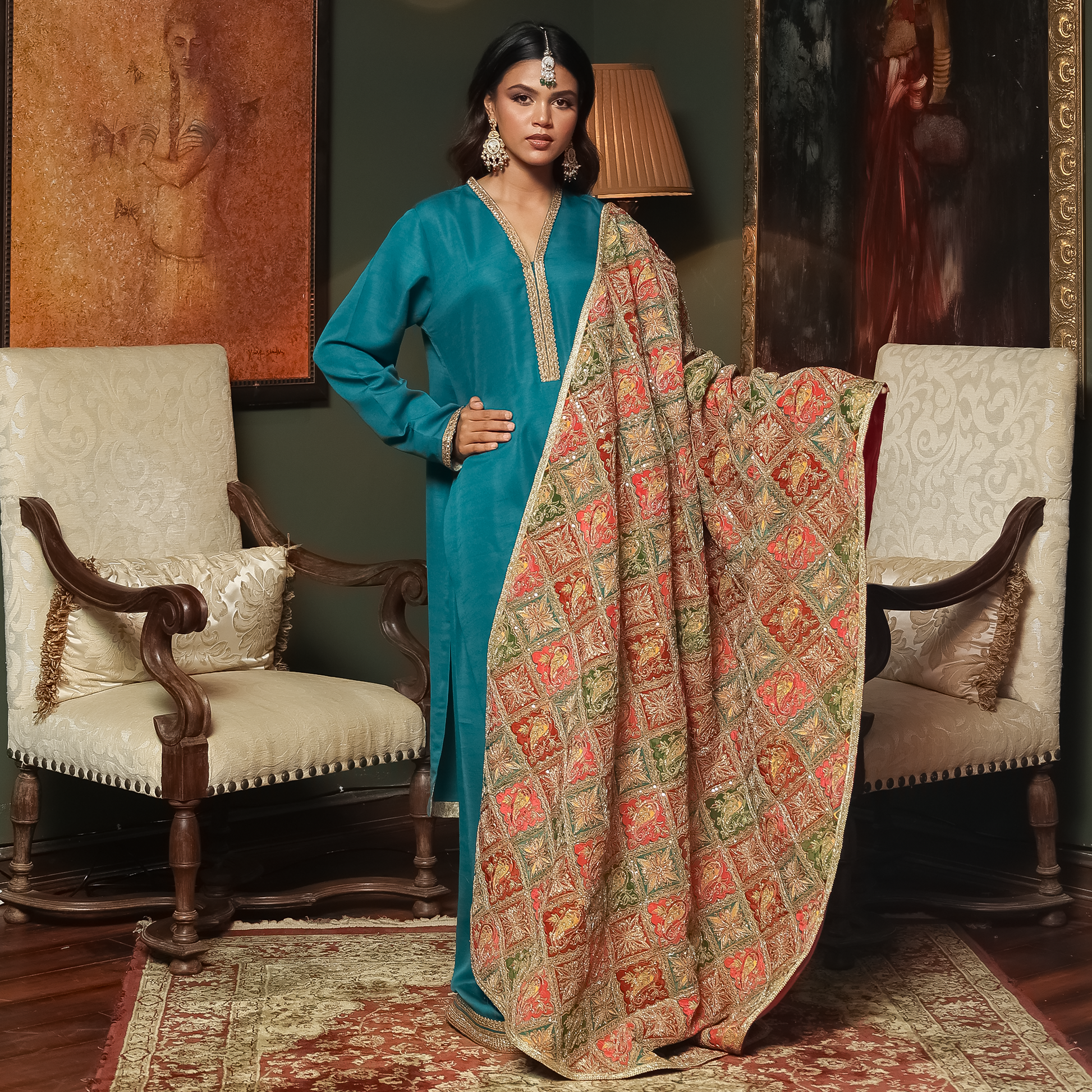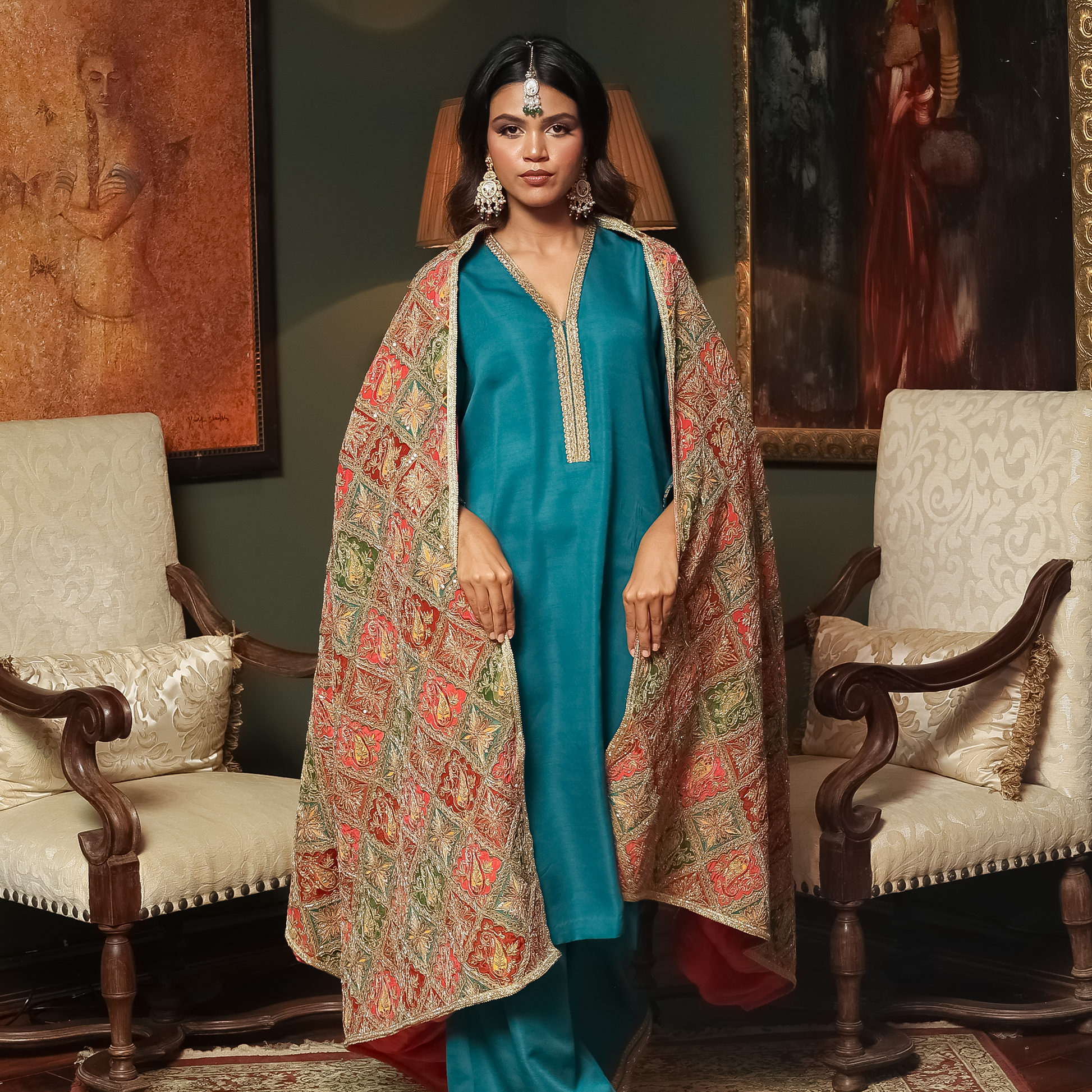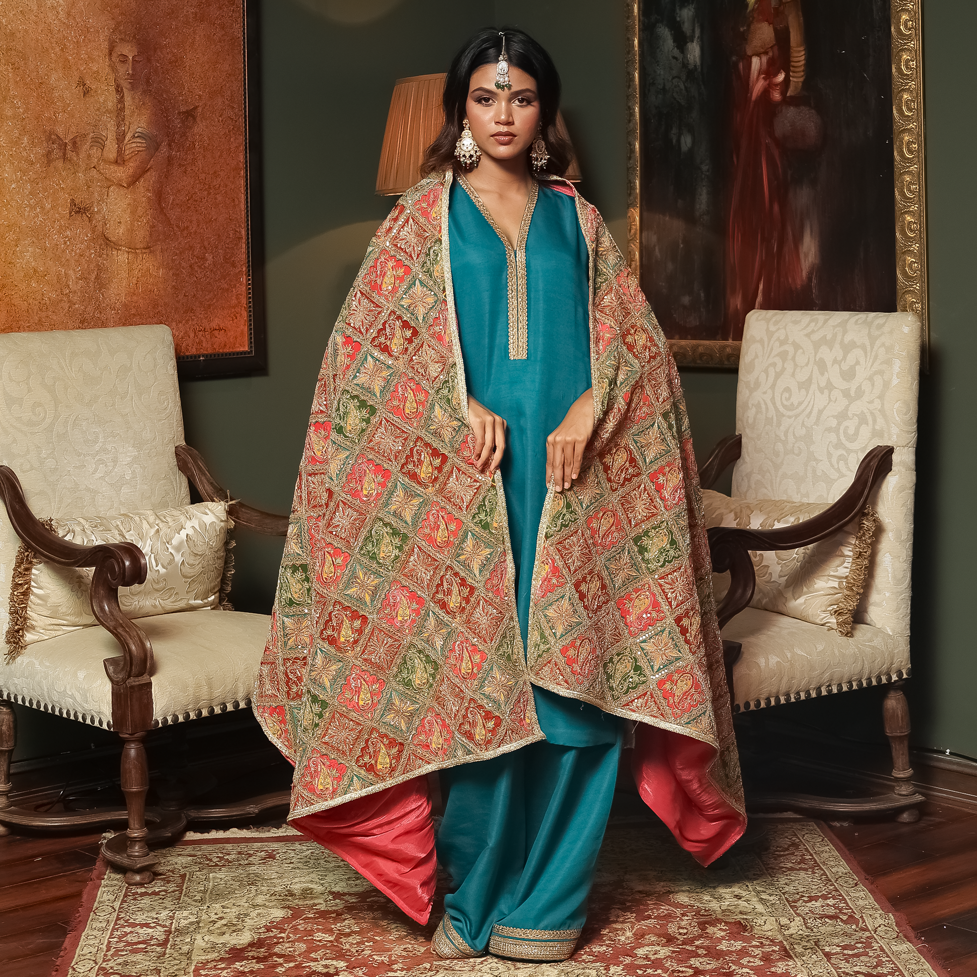 This green ensemble features a gota-detailed V-neck shirt, plazo pants, and a black and pink embroidered shawl. A graceful pick for daytime celebrations or evening wear. Plain silk suit is for 280 and the Kattan silk Kalamkari embroidered shawl is for 680.