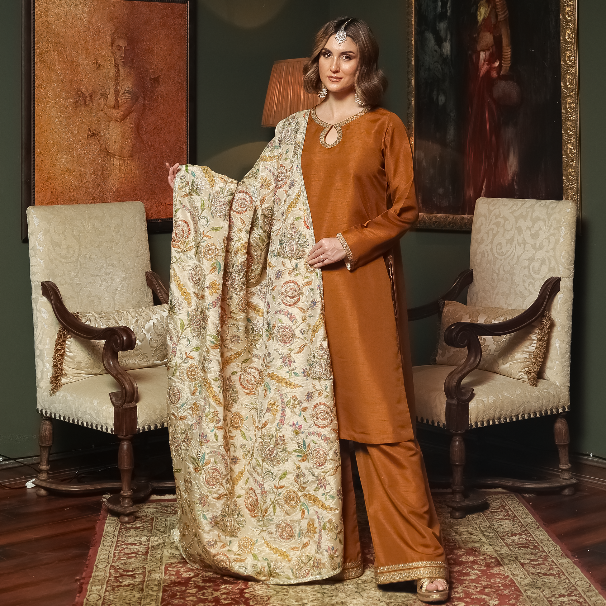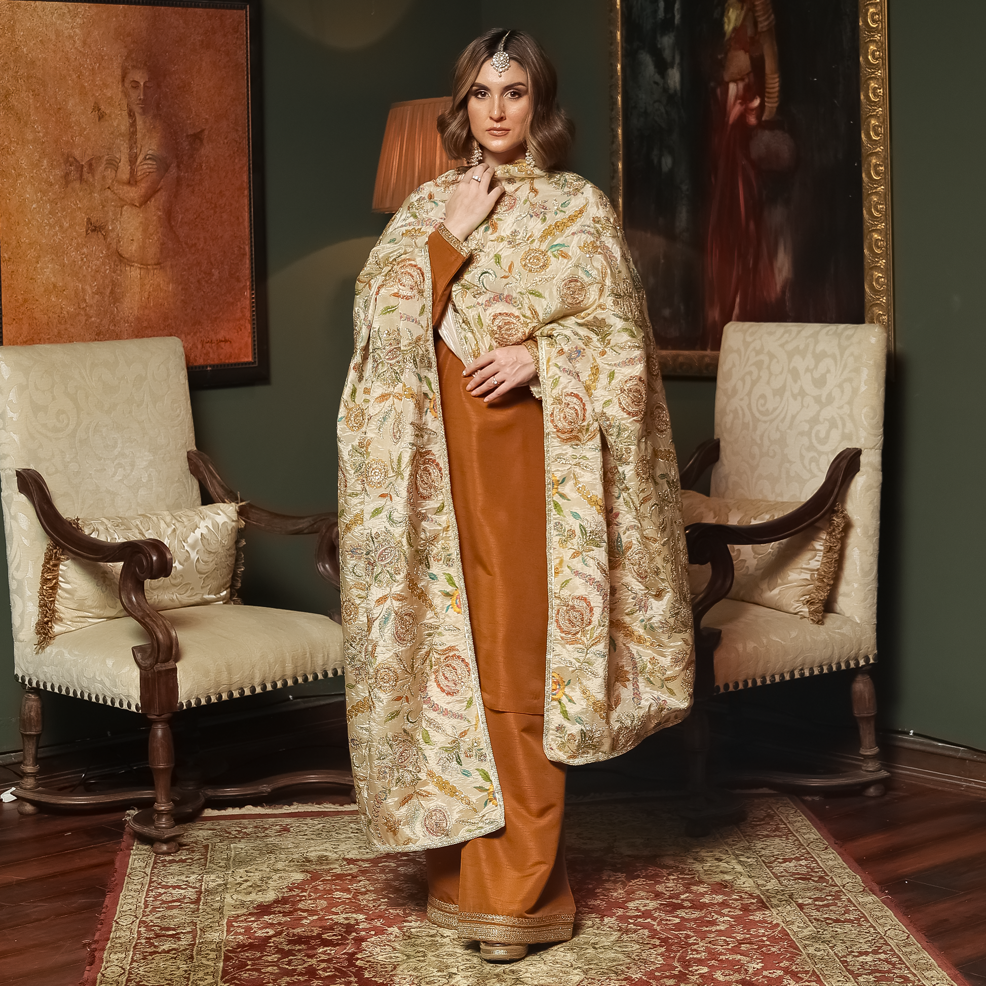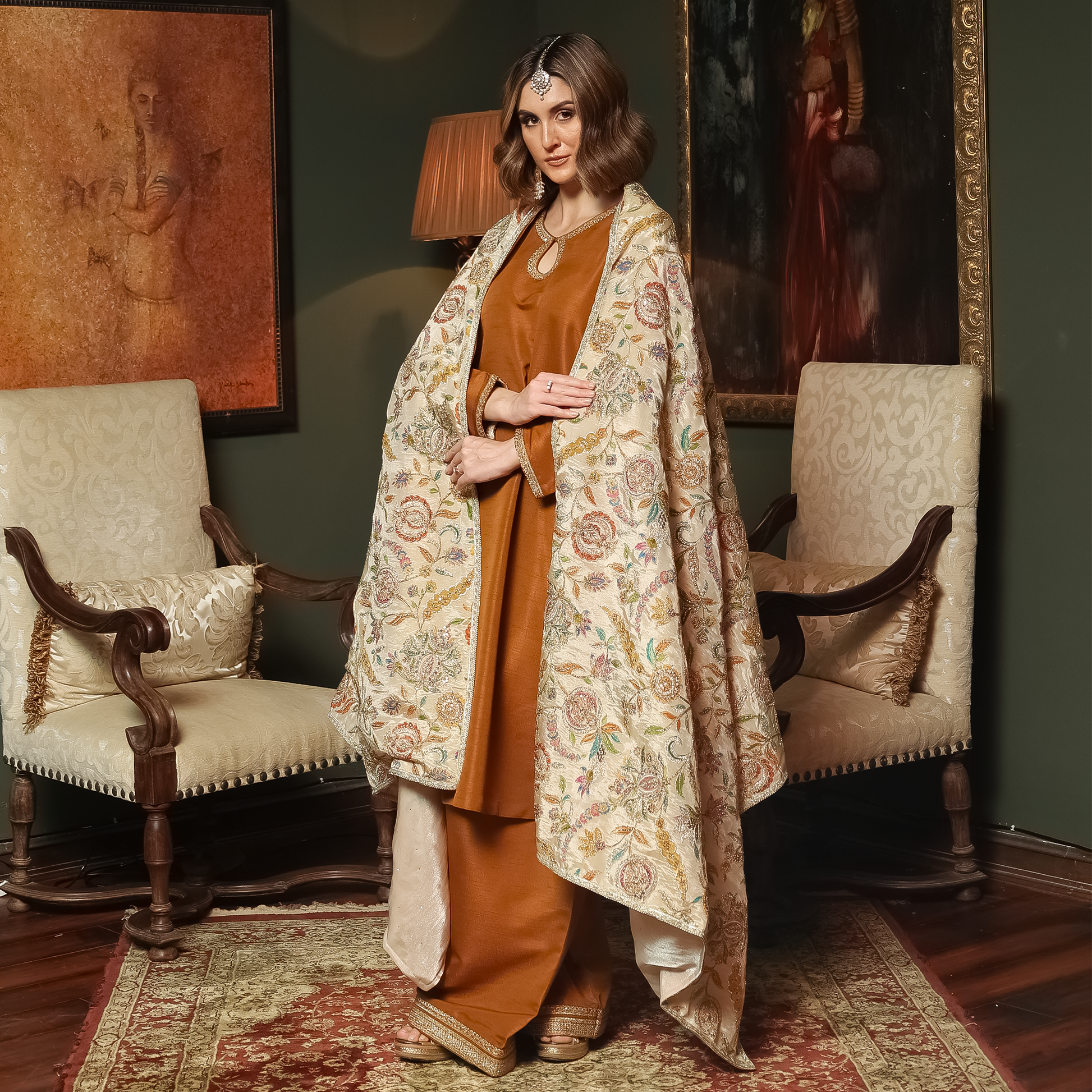 A rich brown gota-embellished V-neck shirt paired with plazo pants and a beige embroidered shawl. Elegant and timeless, it’s ideal for formal gatherings, festive occasions, and wedding events.