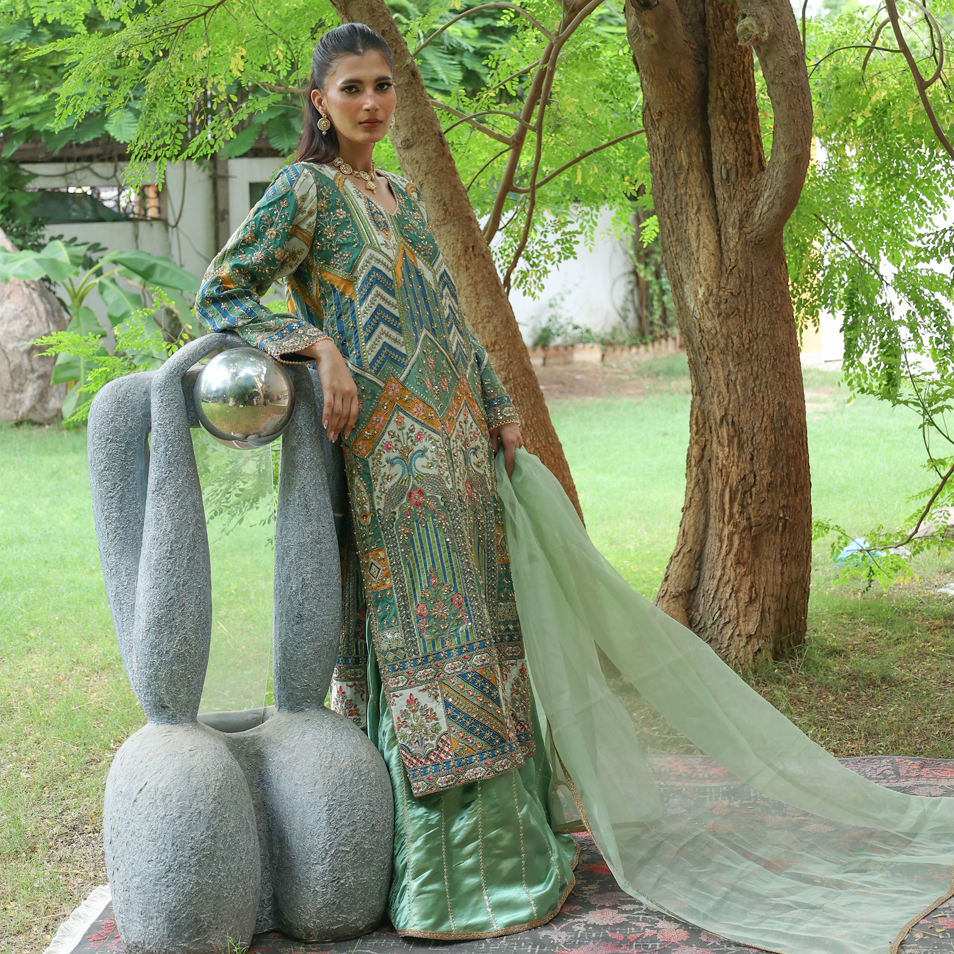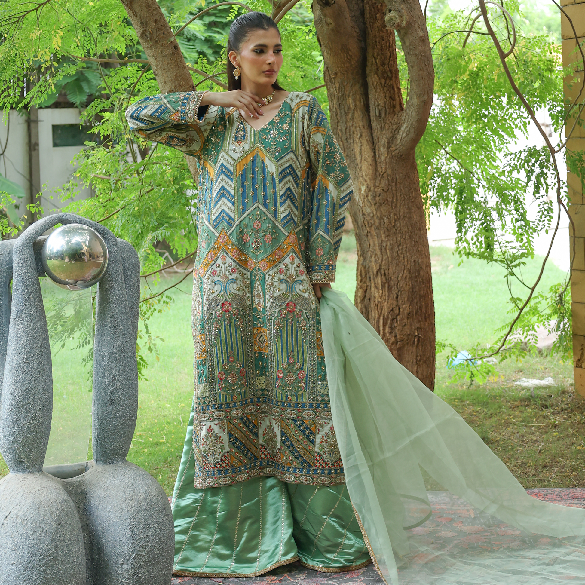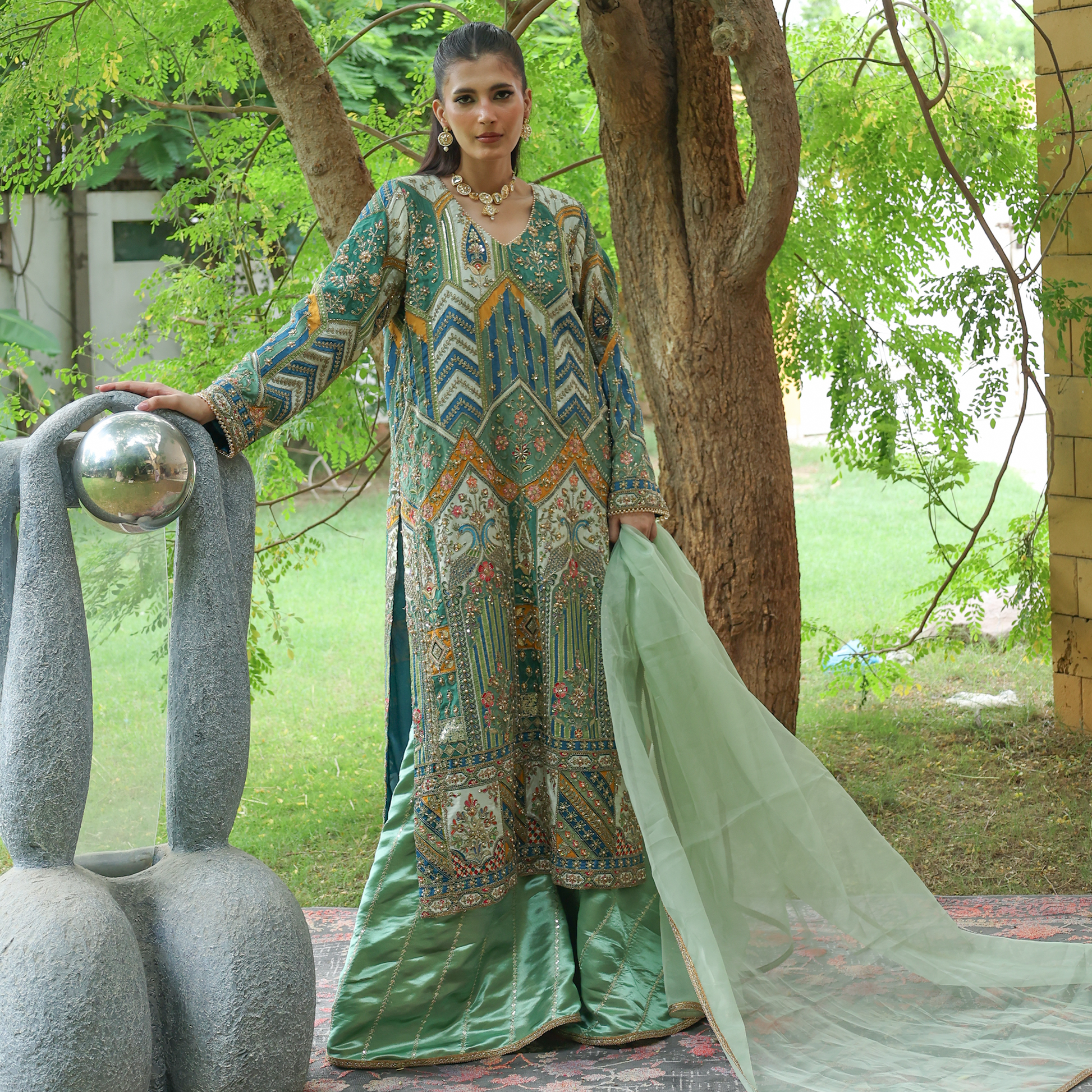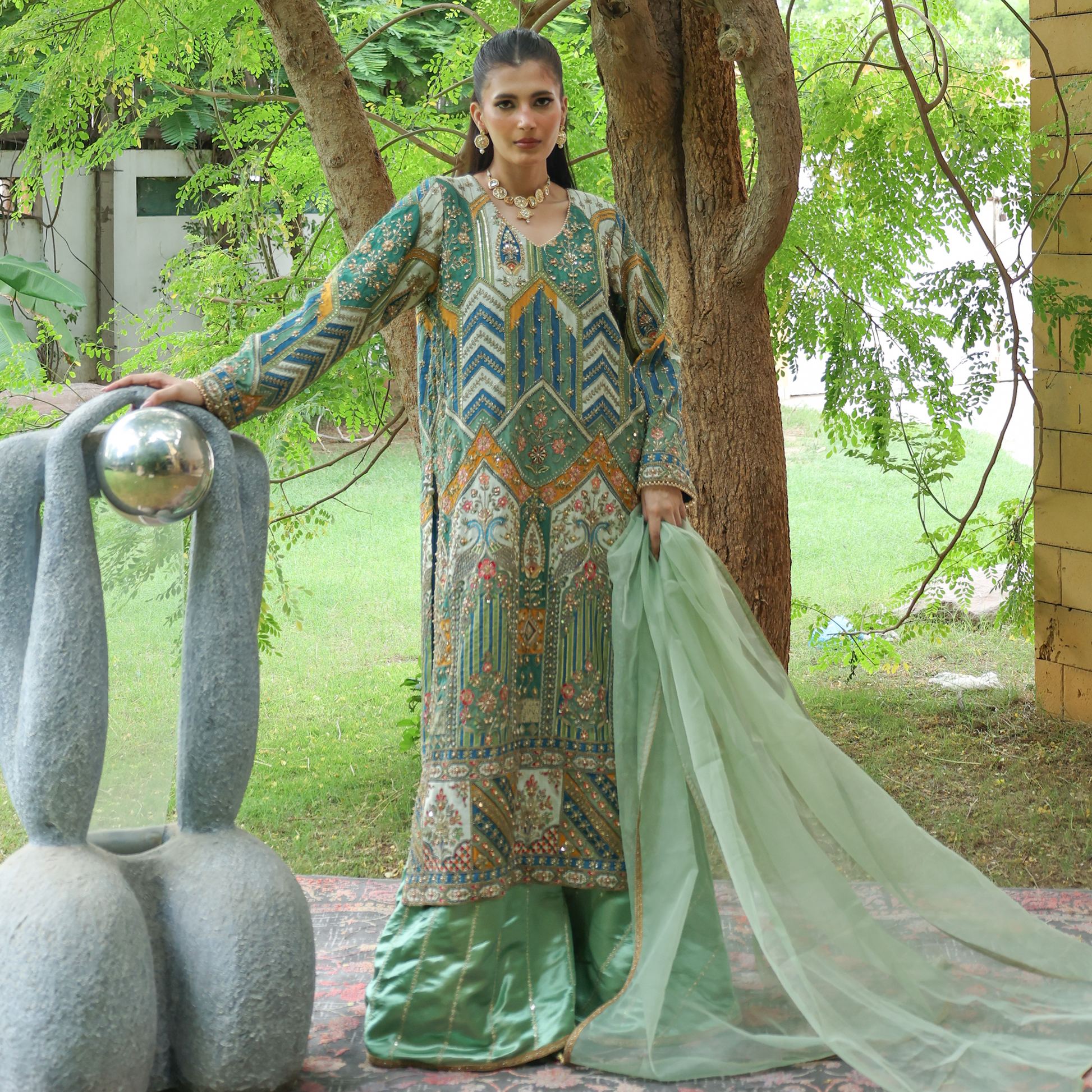 This elegant teal and mint green outfit showcases a long embroidered shirt crafted with a blend of machine and hand embroidery for a rich, detailed finish. It is paired with a silk embroidered gharara featuring gota detailing at the bottom, and an organza dupatta with matching gota finishing on all sides. Perfect for festive celebrations, weddings, or formal events, this ensemble embodies grace and sophistication