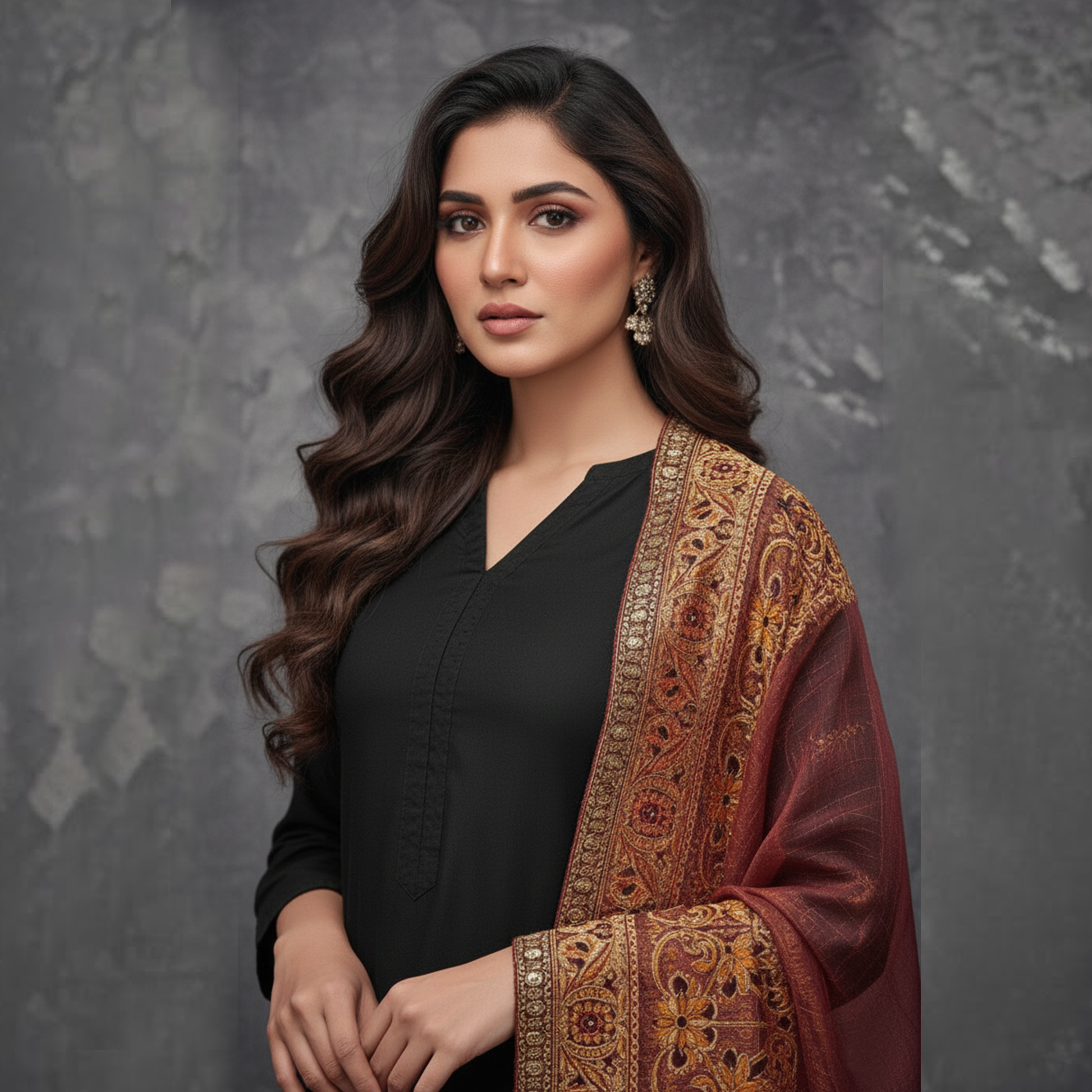 A Maroon Masori jamawar shawl featuring embroidered lace detailing on all four sides, crafted to add an elegant and luxurious finish to festive and formal looks.add an elegant and luxurious finish to festive and formal looks.