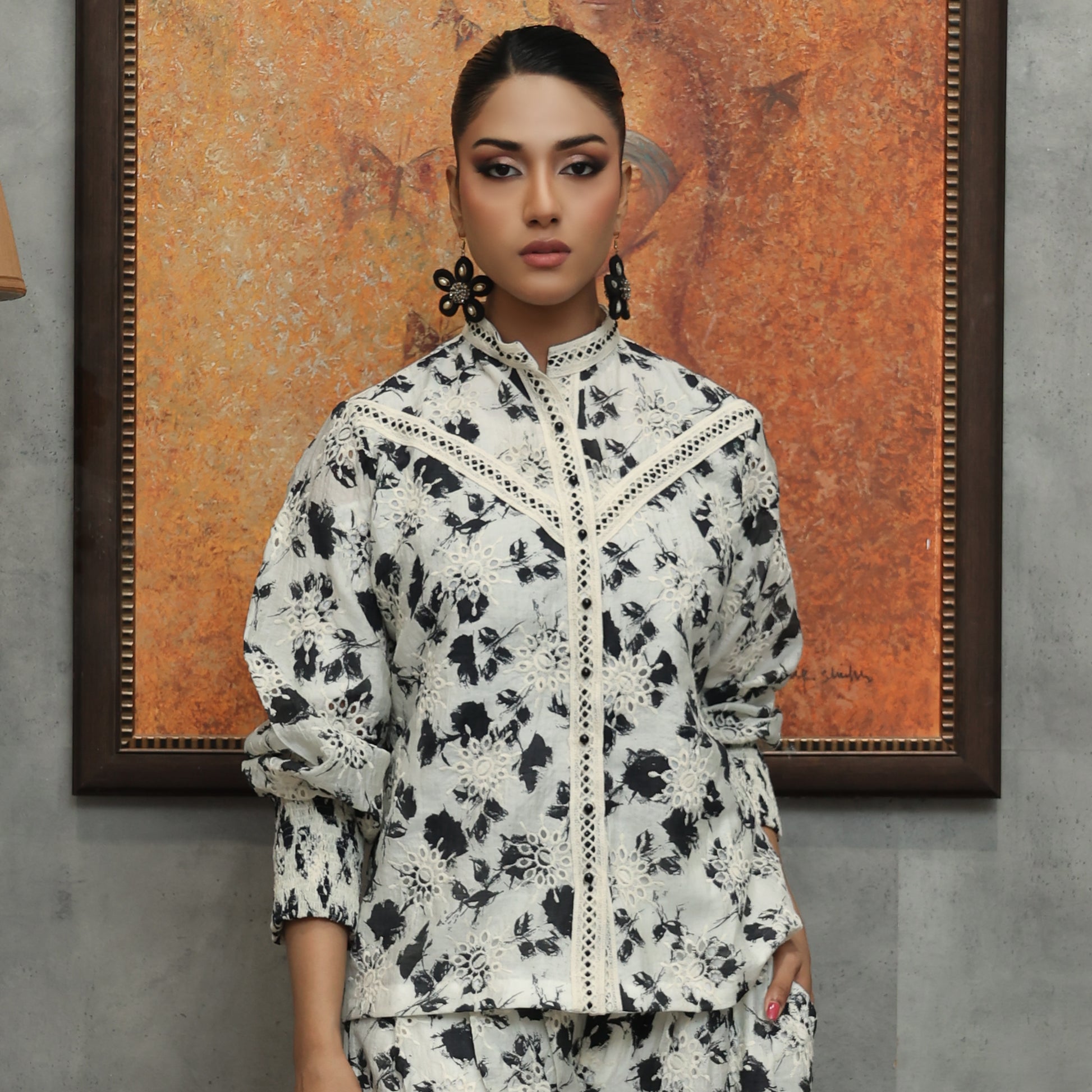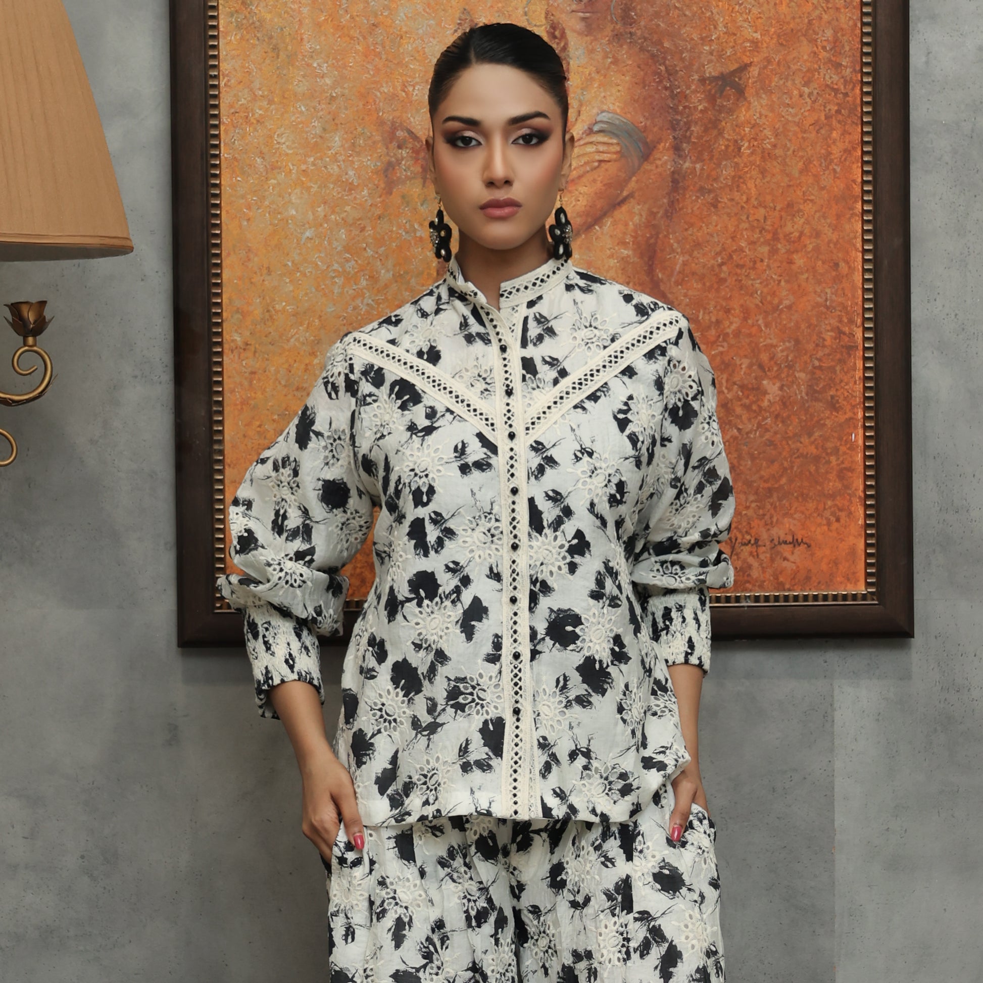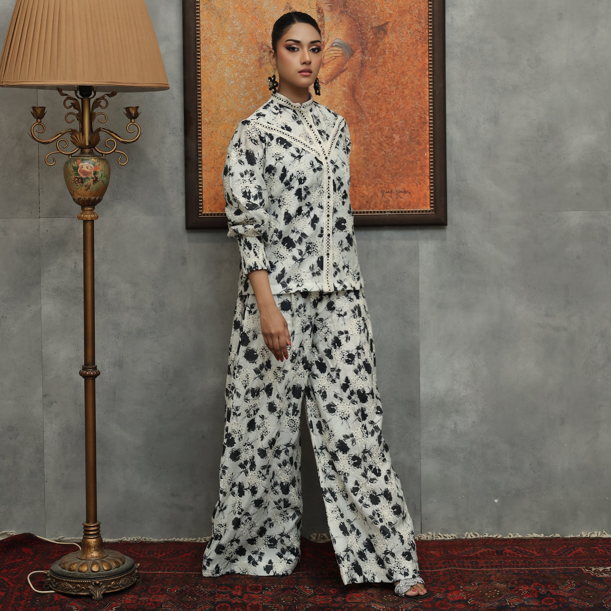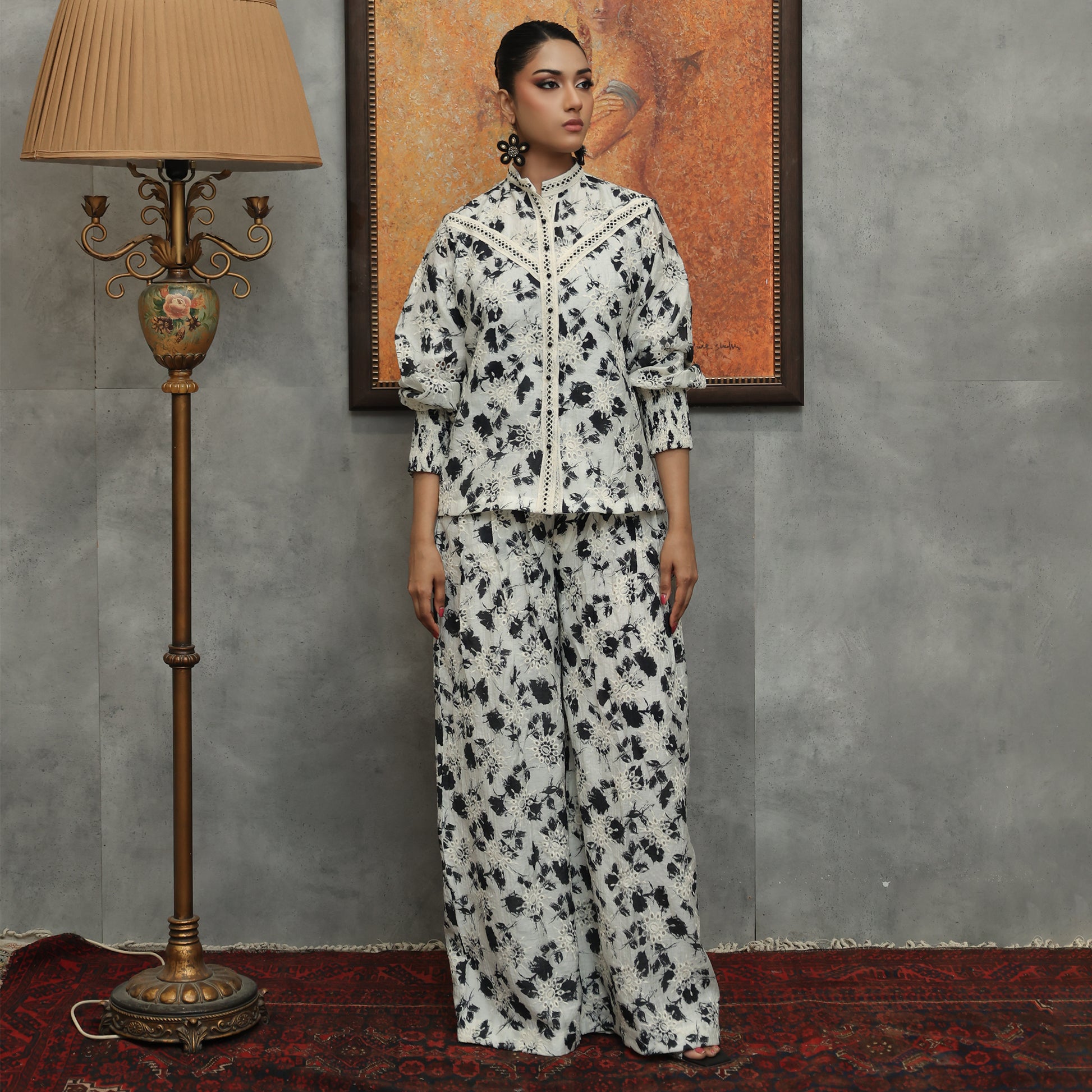 Open-Front Paper Silk Jacket with Mirror Lace & Wide-Leg Pants A chic open-front paper silk jacket with a band collar, detailed with mirror lace and cuff sleeves. Paired with wide-leg pants, this ensemble offers a graceful, contemporary look—ideal for festive gatherings, weddings, and elegant evening wear.