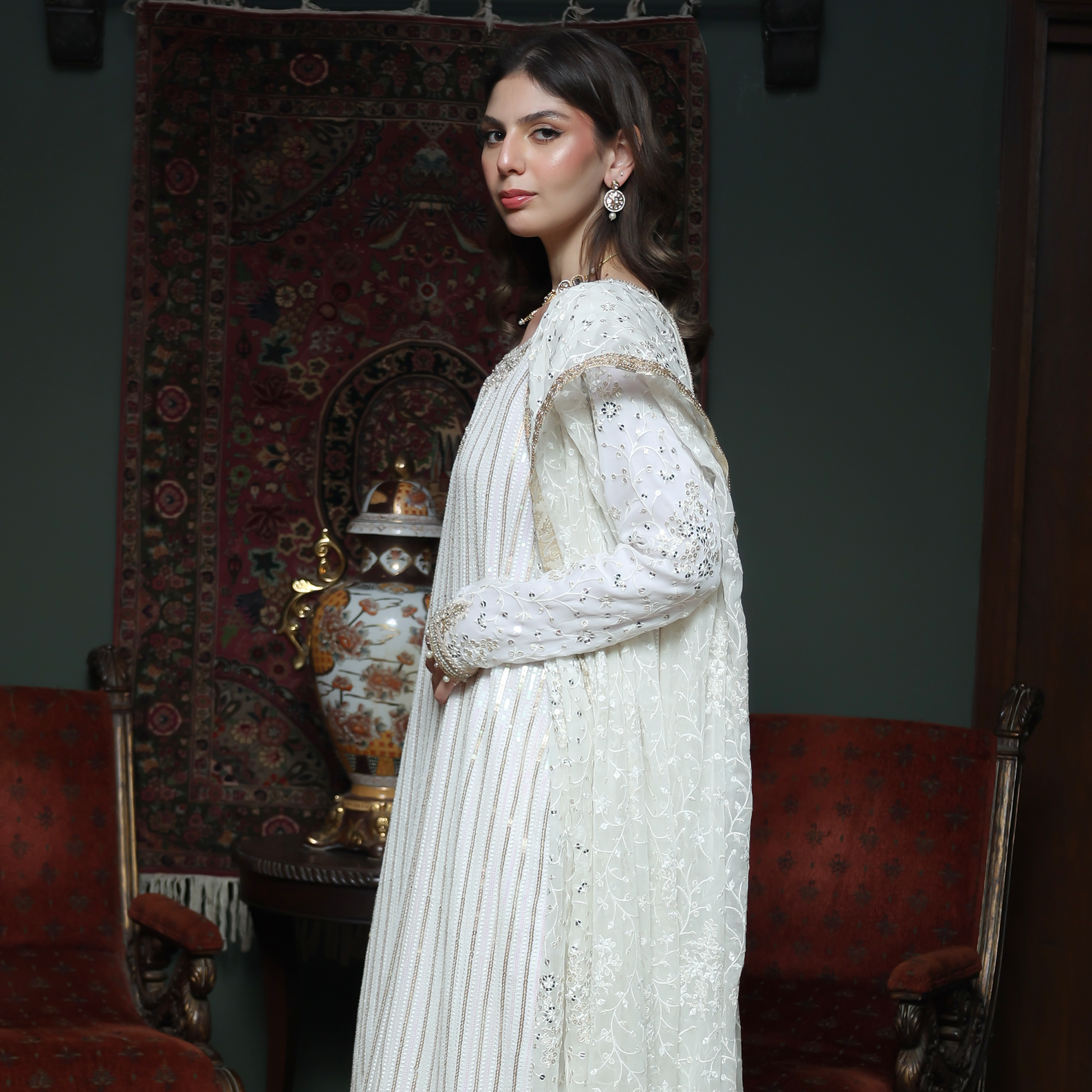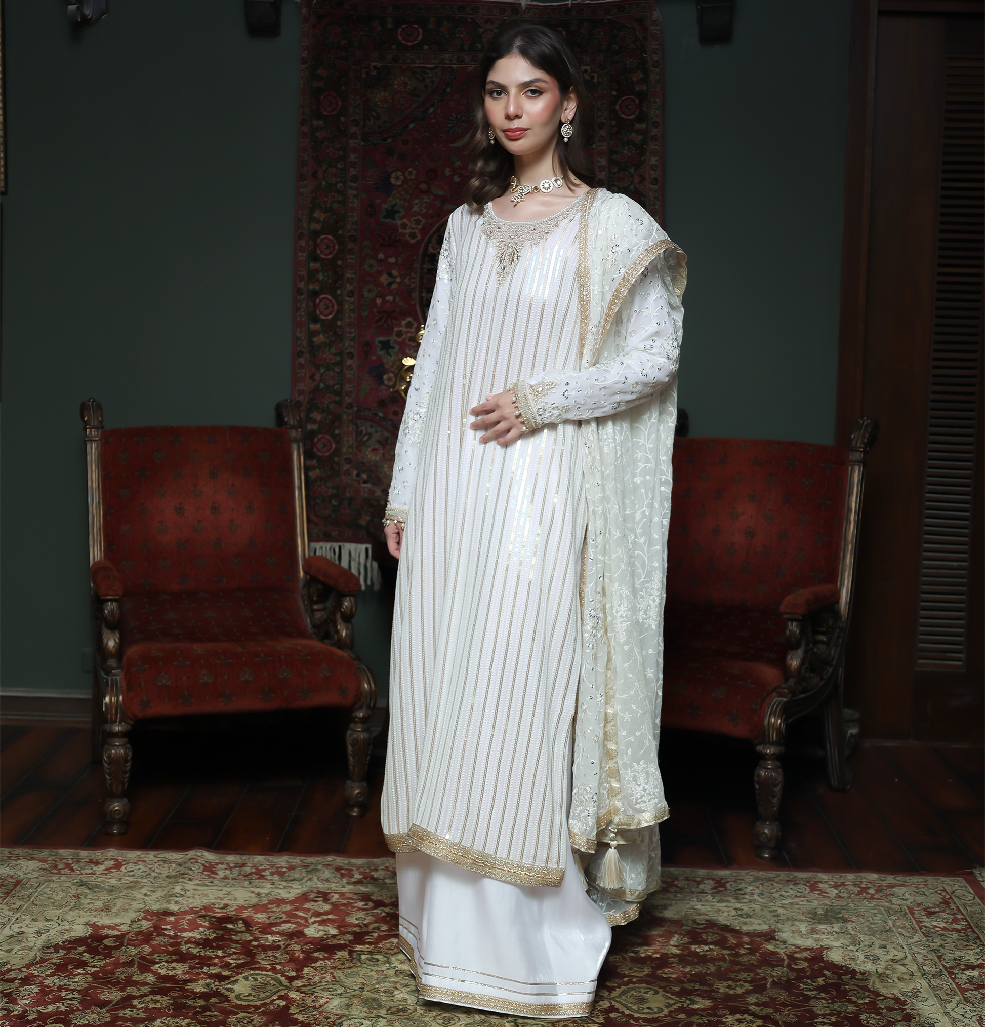 This elegant white chiffon embroidered outfit features a long shirt with a round neckline, beautifully hand and machine embroidered on the front, back, and sleeves. The shirt is enhanced with gota lace detailing for a touch of traditional charm. Paired with lava silk ajar pants adorned with gota lace finishing, the ensemble exudes refined sophistication. Completing the look is a chiffon embroidered dupatta featuring gota accents and delicate tassels, making it perfect for weddings, festive gatherings, and formal occasions.