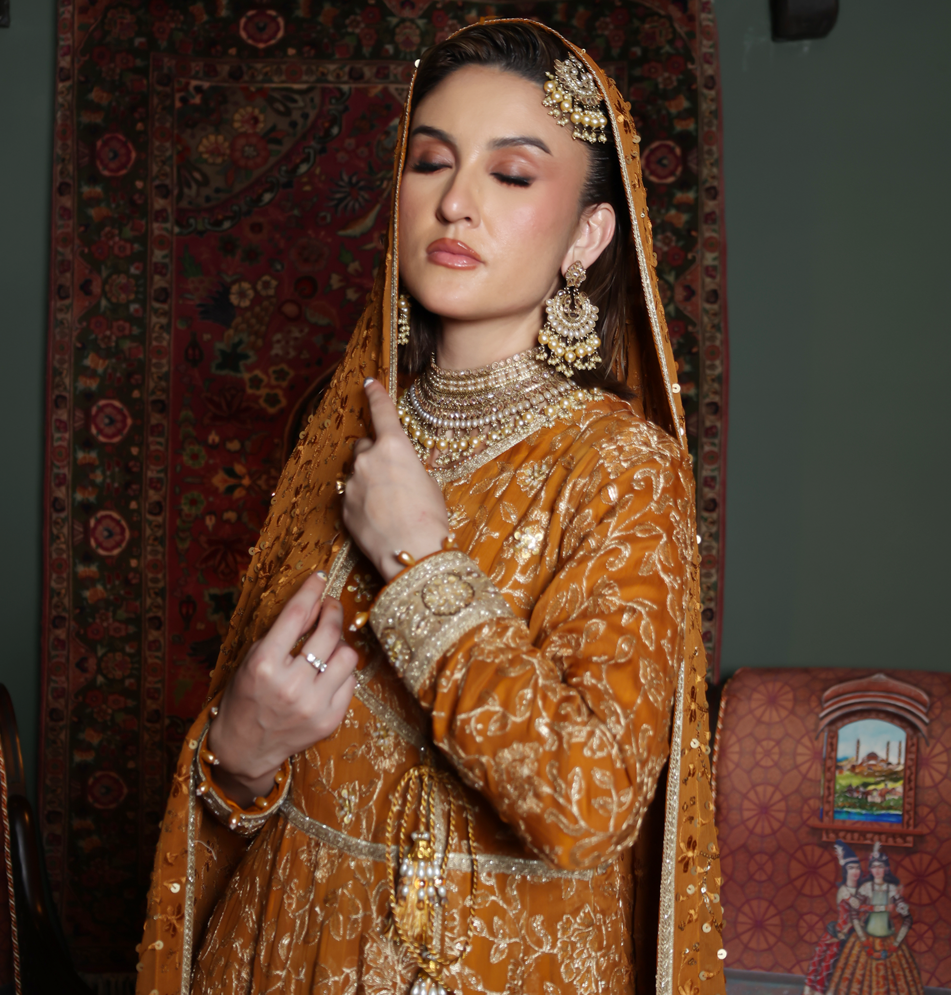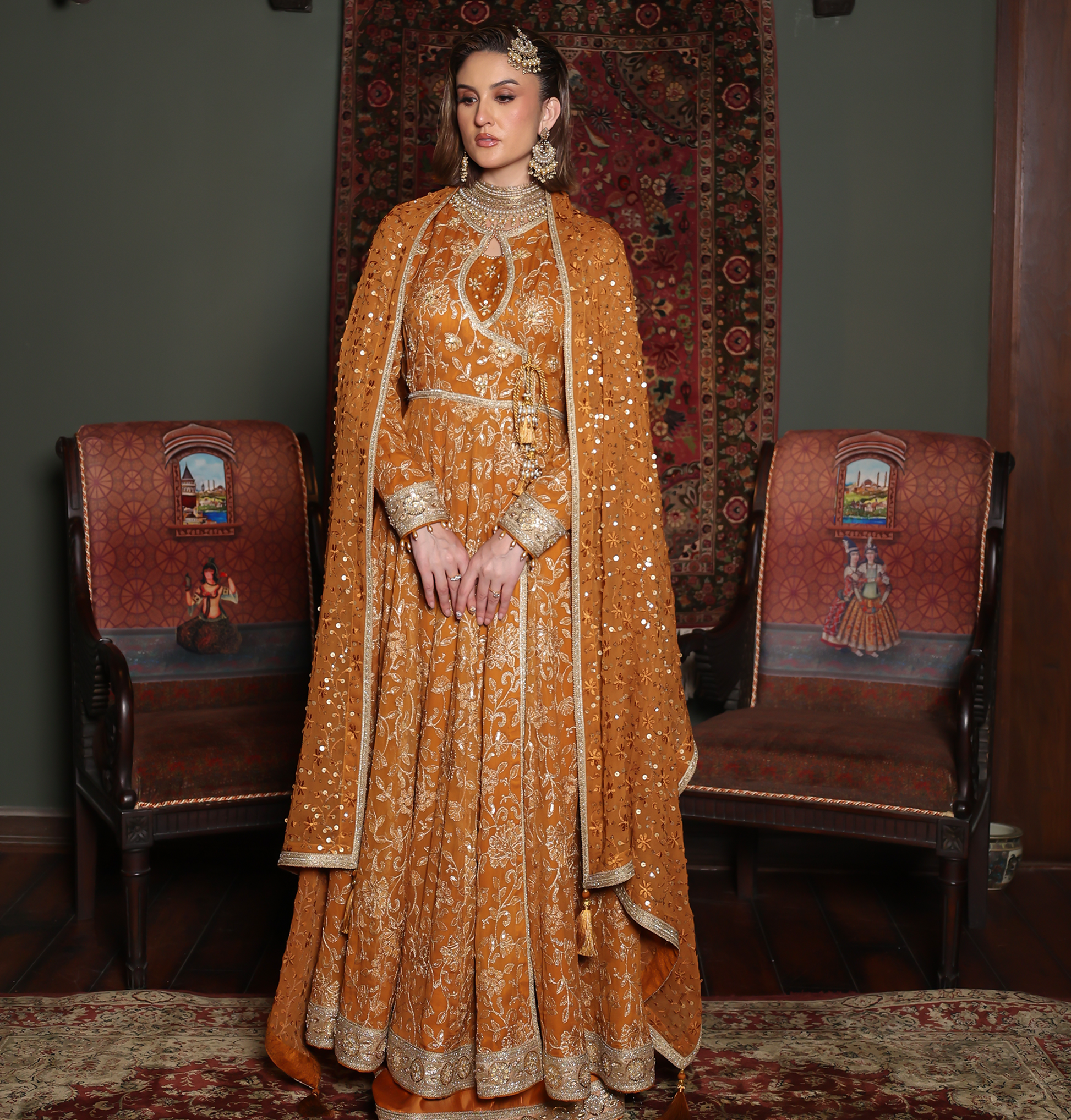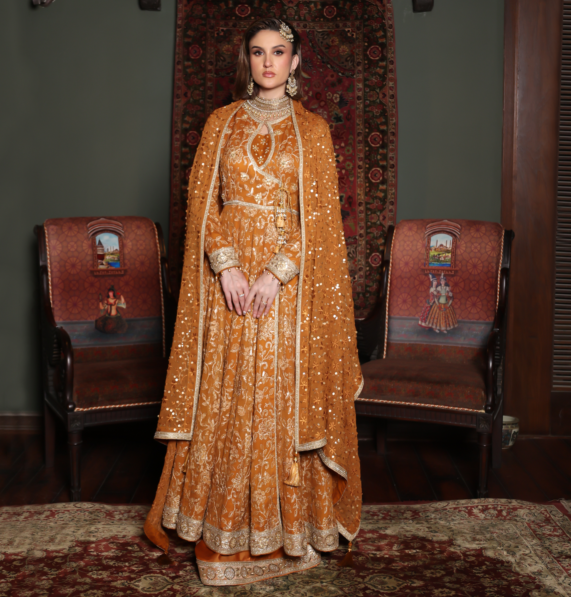 A mustard delicately embroidered chiffon angrakha-style slit pishwas, featuring a round neckline enhanced with gota lace and intricate handwork along the borders and sleeves. Paired with white lava silk pants finished with a subtle gota border, and a beautifully embroidered chiffon dupatta adorned with gota detailing and tassels on all four sides — a graceful ensemble that blends timeless tradition with refined elegance.