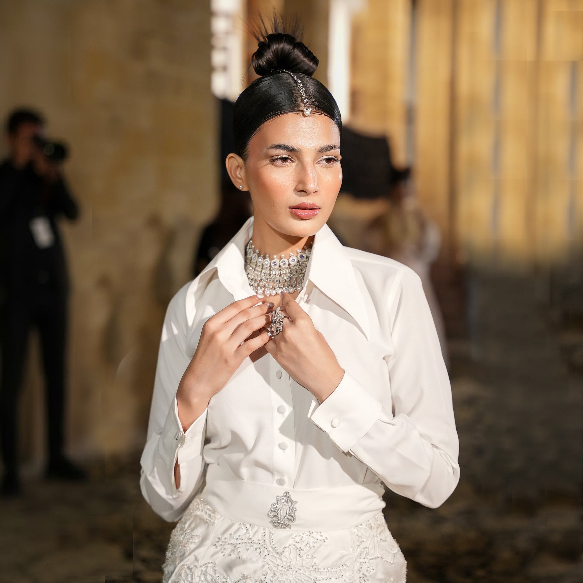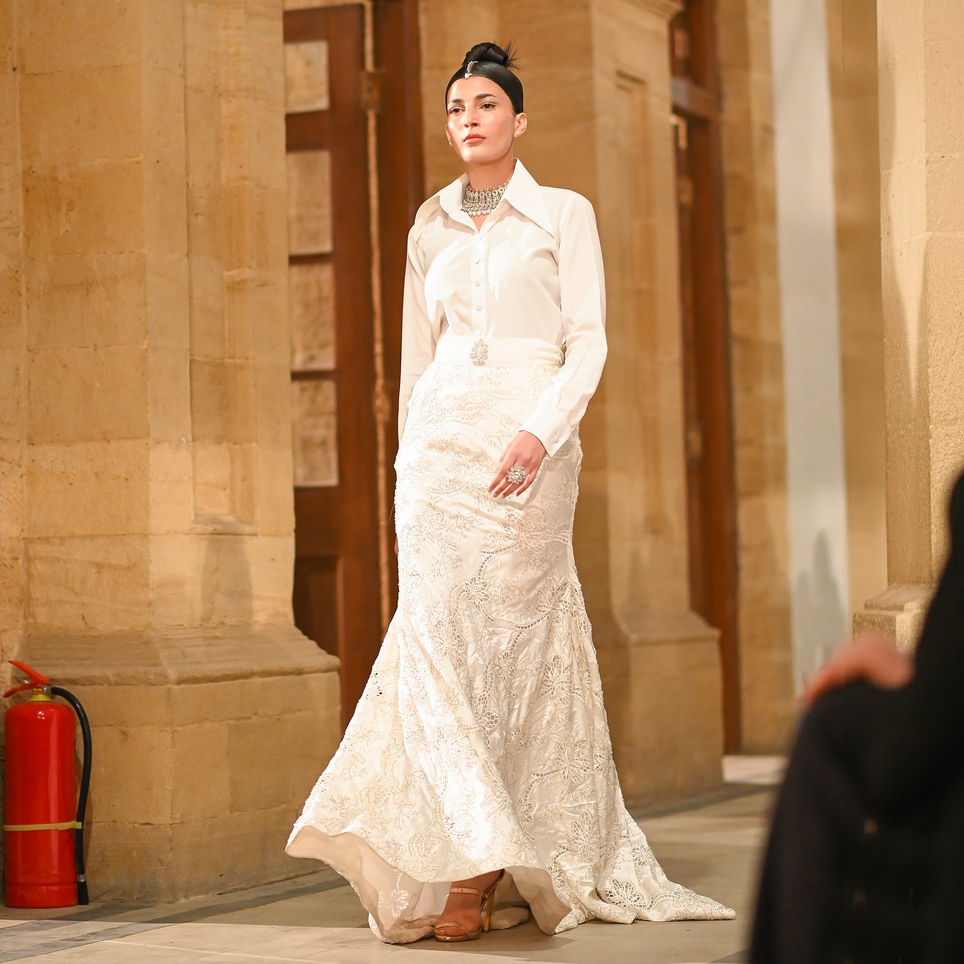A mermaid-cut couture lehenga crafted in ivory shisha silk and net with detailed hand embroidery, shaped to contour the lower silhouette. The lehenga is paired with a satin belt featuring a front brooch and styled with a structured white satin shirt featuring a large collar, full sleeves, French cuffs, and hand-embroidered buttons. Finished with a diamanté choker, this avant-garde Pakistani designer lehenga set merges classic bridal tones with fashion-forward tailoring for festive couture occasions.