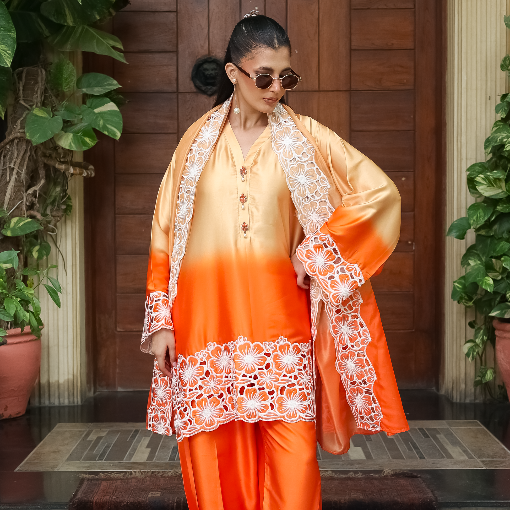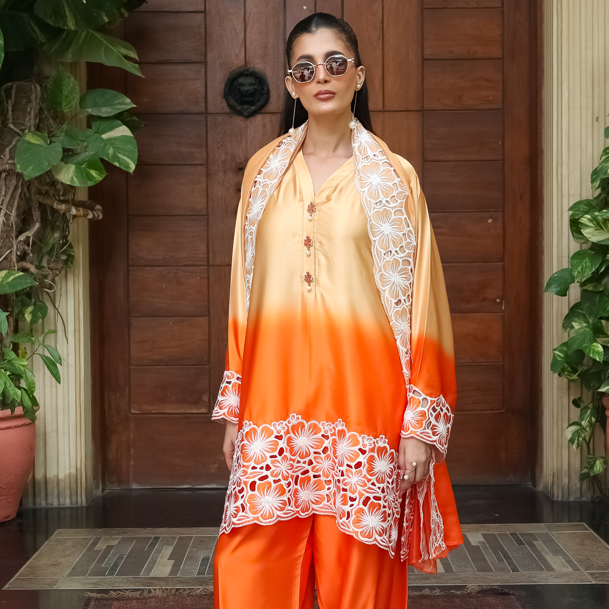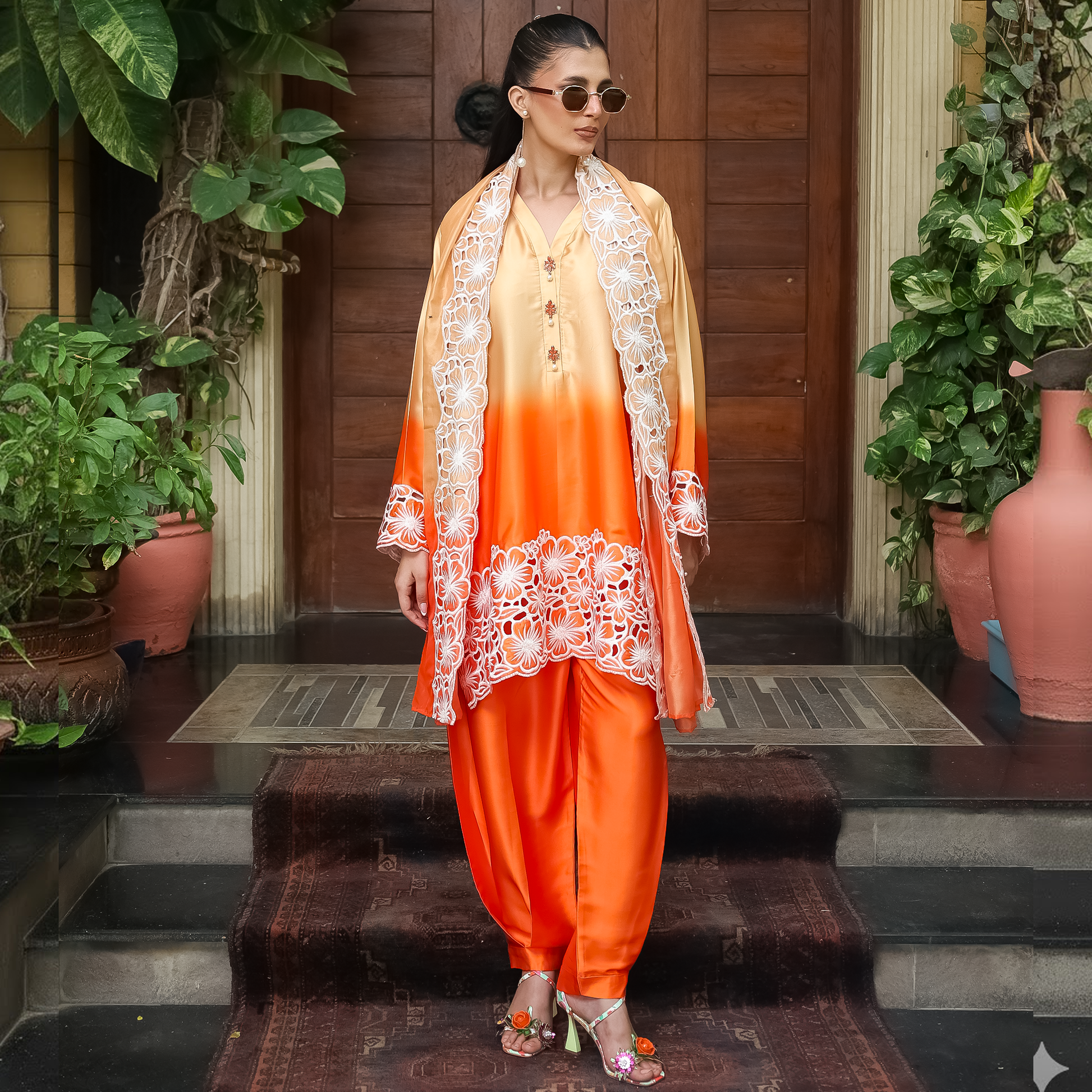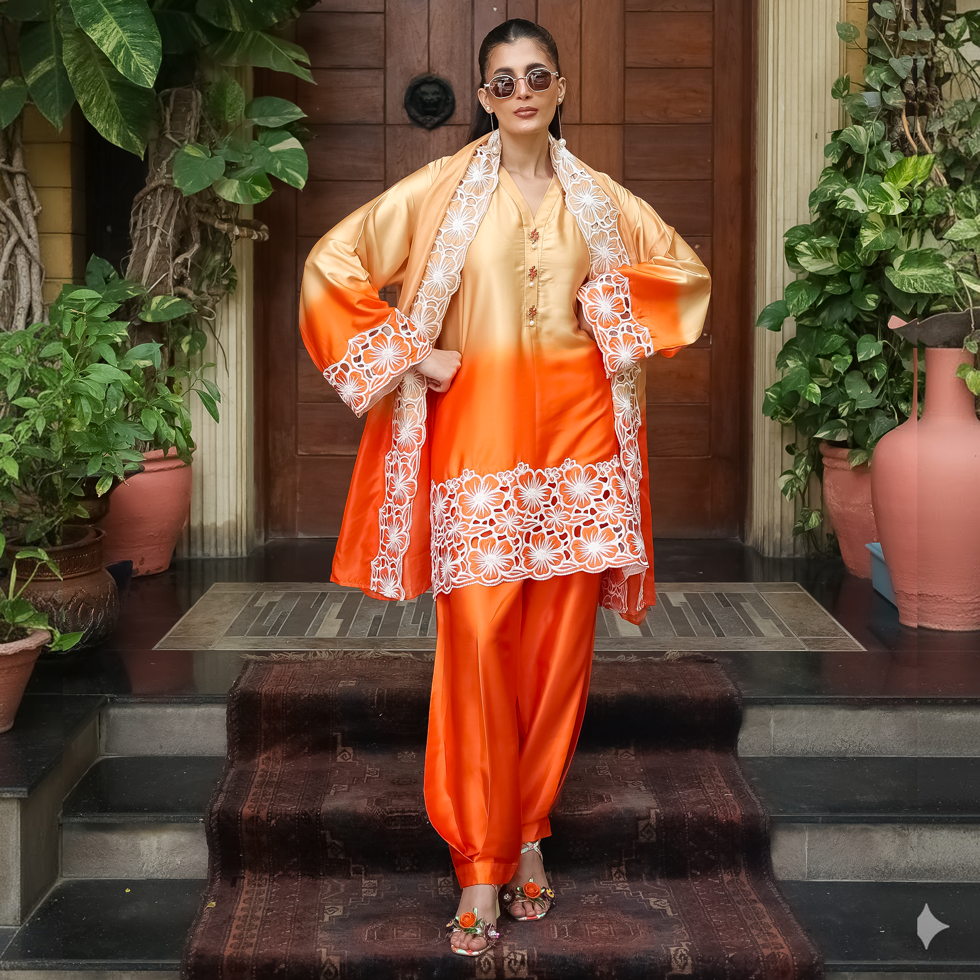 This two-tone orange Tie & Dye outfit features light and dark orange hues artistically blended to create a vibrant statement. Kimono collar, The shirt and dupatta are adorned with white cutwork embroidery, adding depth and delicacy. The embroidered hem and sleeves enhance its festive allure, while the silk dupatta and plated shalwar complete the look with refined sophistication. A perfect pick for Eid, brunches, or intimate gatherings.