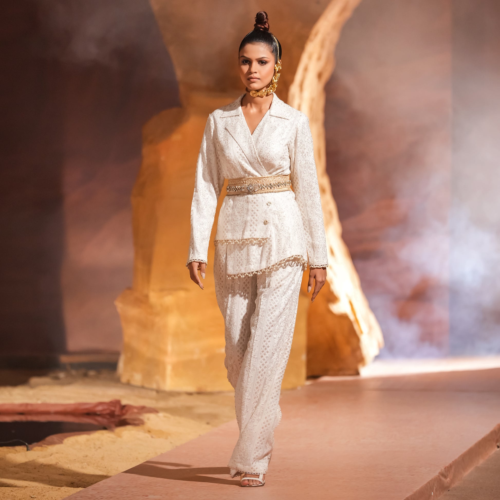 An elegant chiffon embroidered fabric jacket with a coat collar and full sleeves, highlighted by pearl and bead detailing on the hem. The waist-tie belt, handcrafted by Afghan refugees, adds an artisanal touch. Paired with matching straight pants, this ensemble offers a sophisticated, contemporary look for festive and formal occasions.