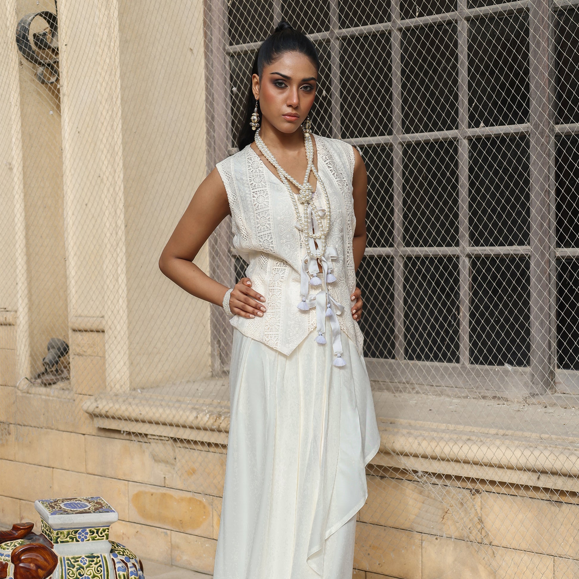 Chikankari Sleeveless Front-Open Vest with Draped Linen Lacha