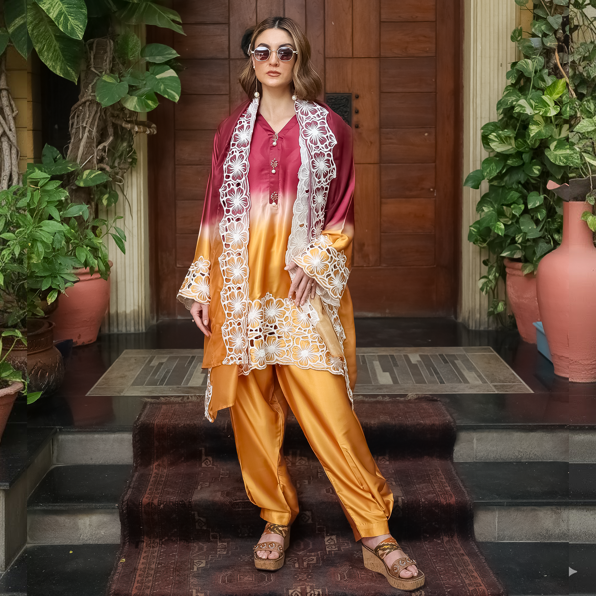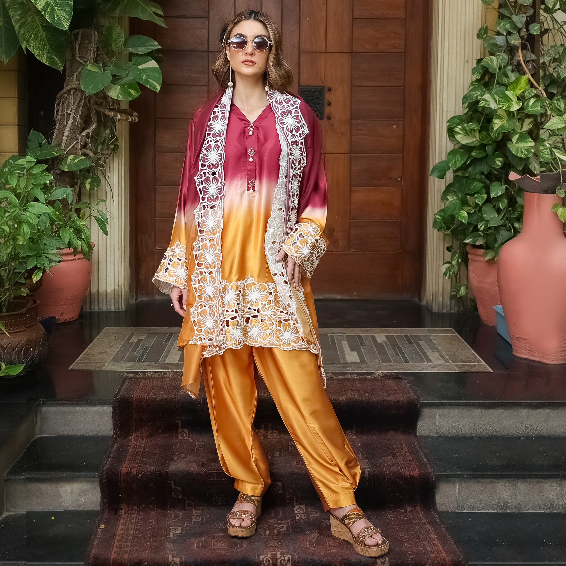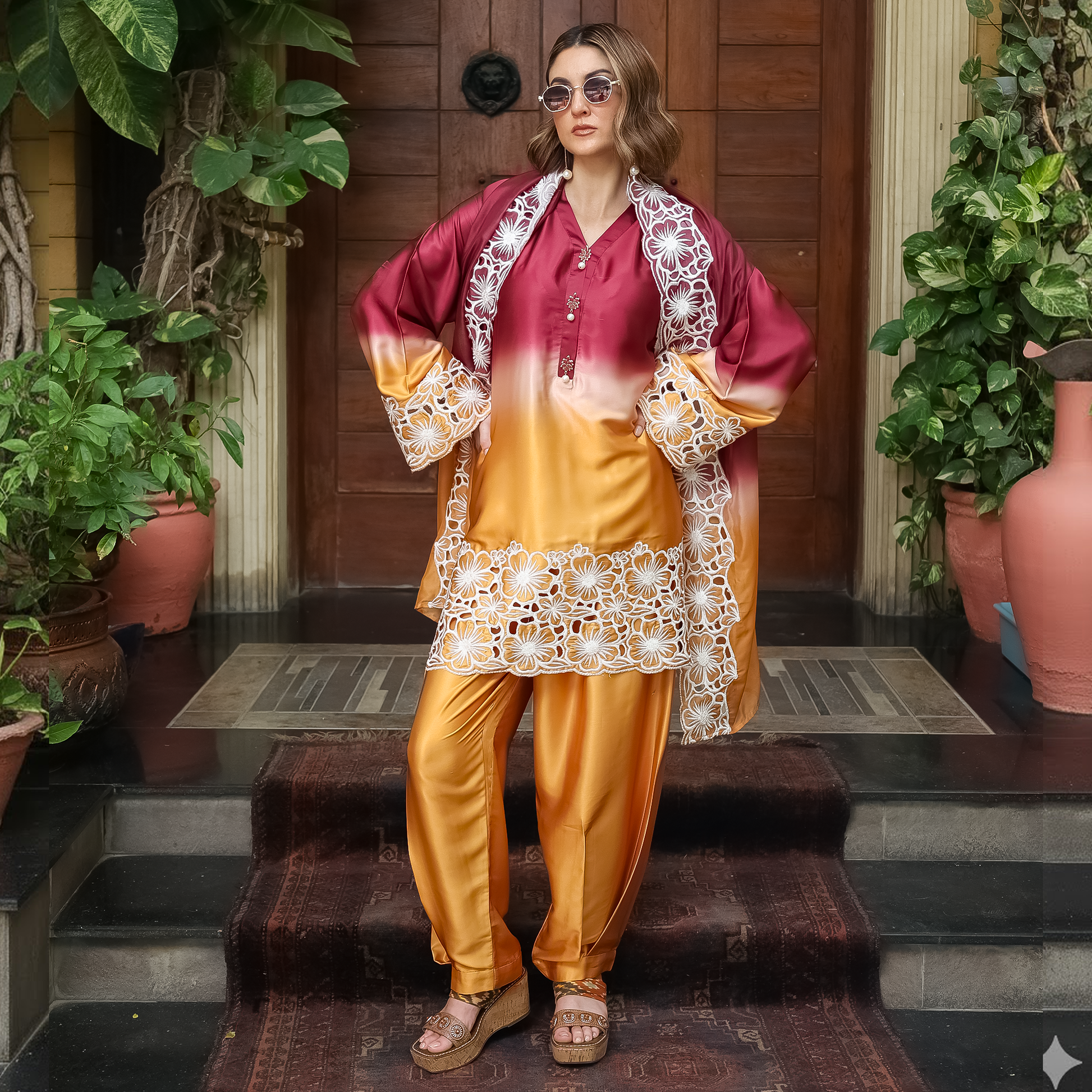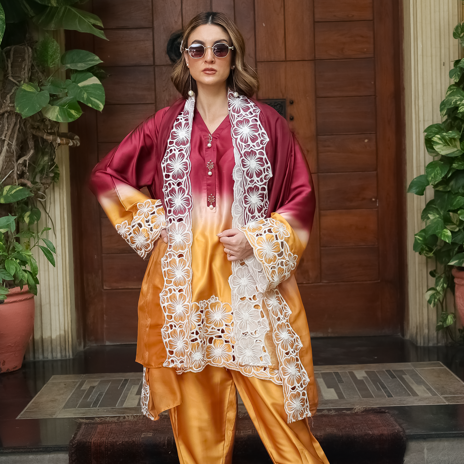 Draped in rich maroon and golden hues, this ensemble showcases exquisite white cutwork embroidery across the shirt and silk dupatta. Kimono collar The embroidered sleeves and hemline bring opulence to the forefront, while the plated shalwar adds a touch of contemporary flair. The silk dupatta with embroidered cutwork edges ties the look together, making it perfect for wedding festivities, dinners, and festive soirées.