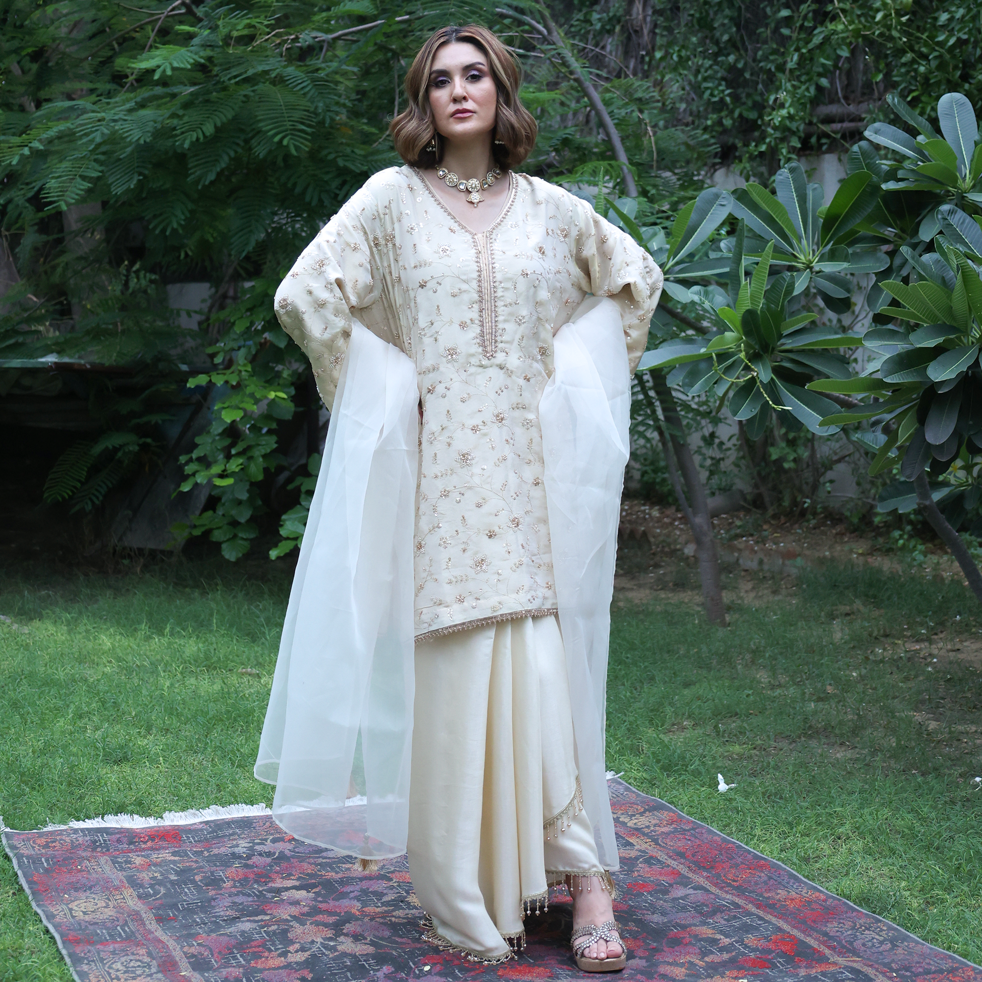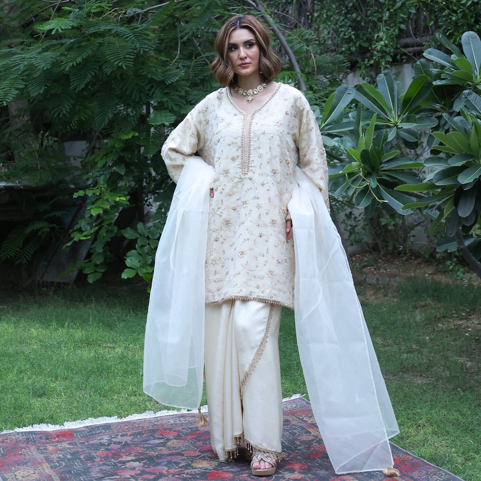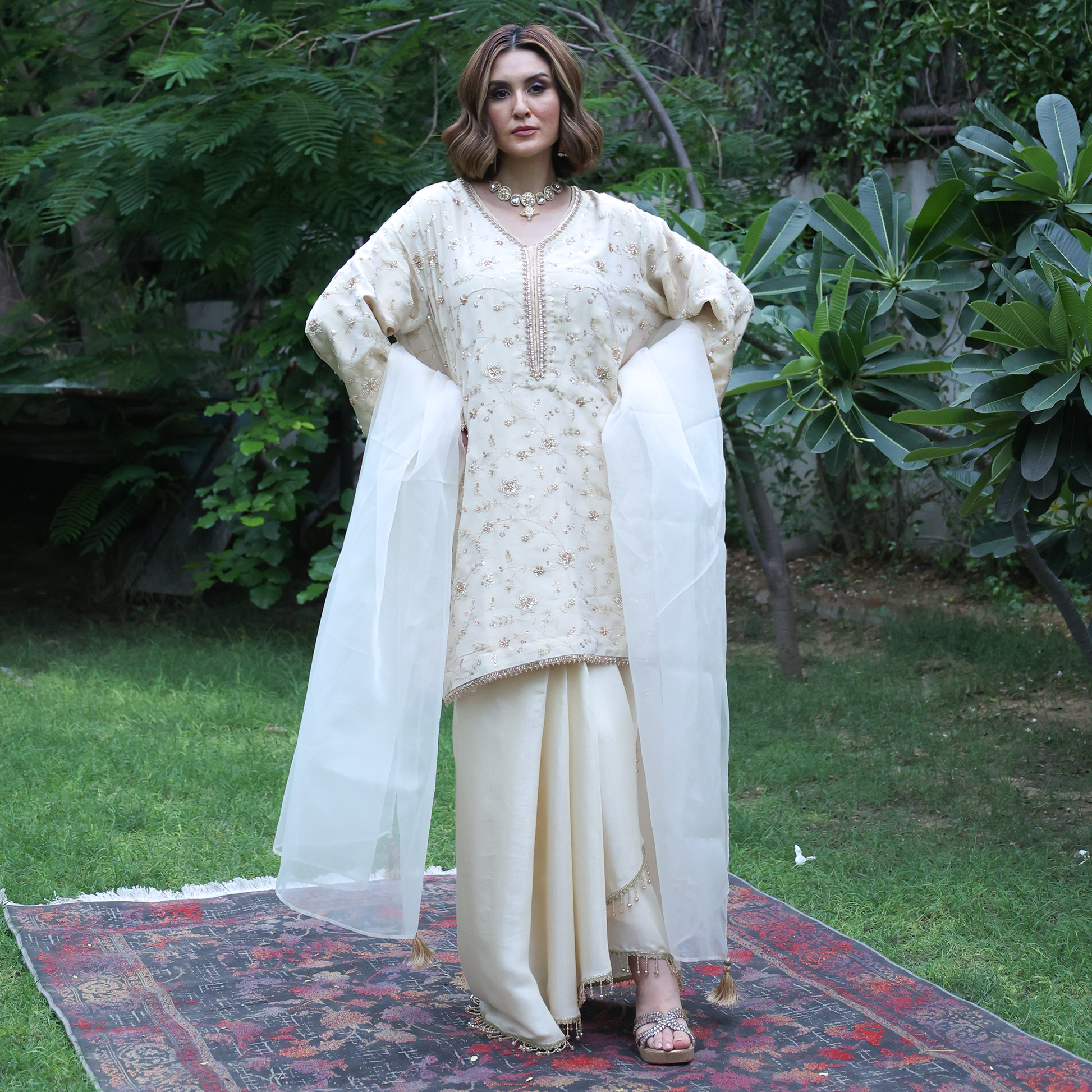 Elevate your festive style with this elegant ivory and gold Masuri outfit. The short shirt features a V-neckline with slit, adorned with bead lace and cut dana embroidery for a refined touch. Paired with a sarong-style skirt embellished with bead detailing and a gold organza dupatta, this ensemble blends traditional charm with modern elegance. Perfect for weddings, festive events, and evening wear, this outfit is a timeless addition to your wardrobe.