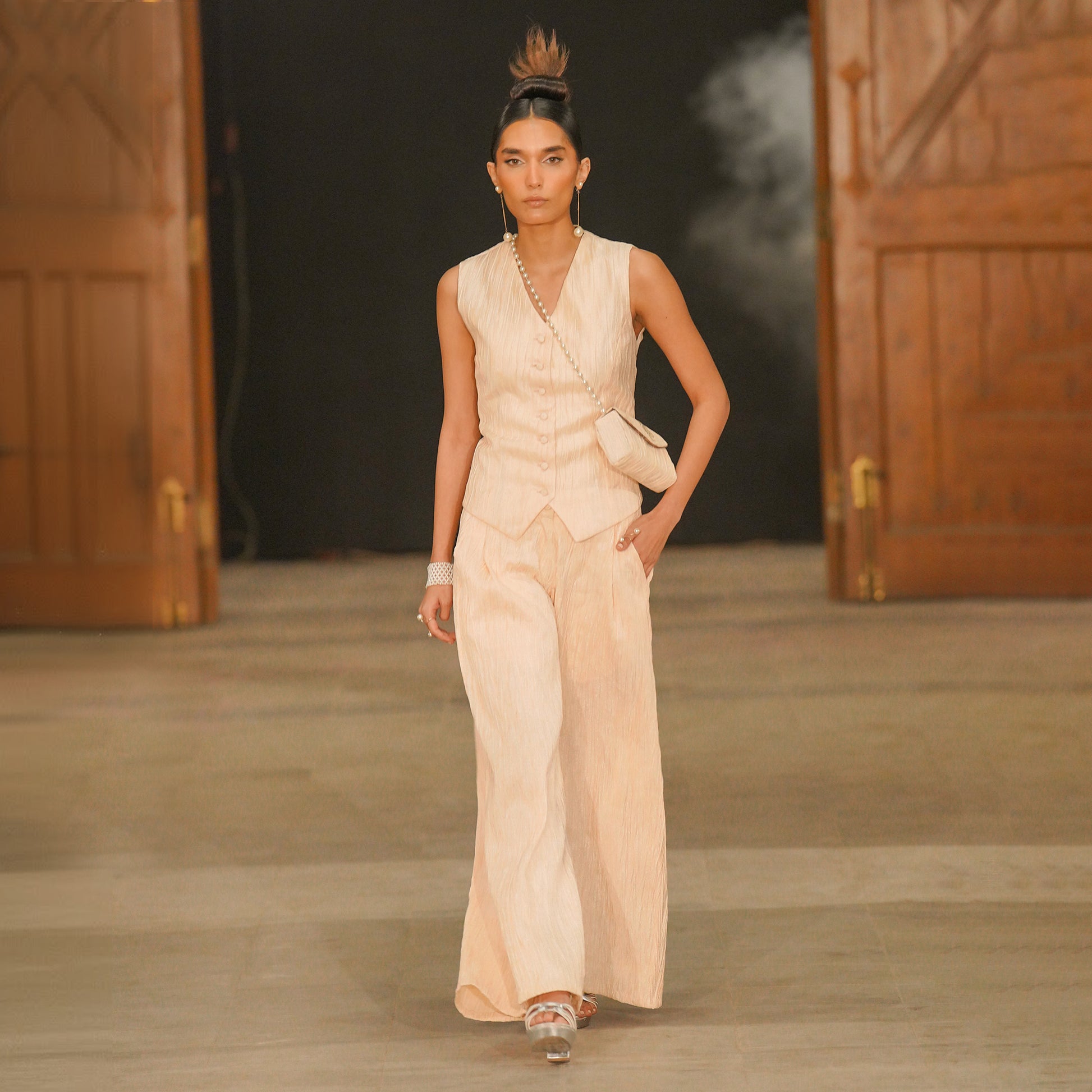 A pastel pink couture suit crafted in crushed jamawar fabric, designed for refined formal and semi-formal occasions. This Pakistani designer ensemble features a structured vest with a distinctive W-shaped hemline layered over a matching crushed jamawar base, paired with wide-leg crushed jamawar pants featuring bridge pockets for modern tailoring appeal. Styled with a pearl chain accessory and matching jamawar clutch, this luxury suit blends traditional textile richness with contemporary silhouette design