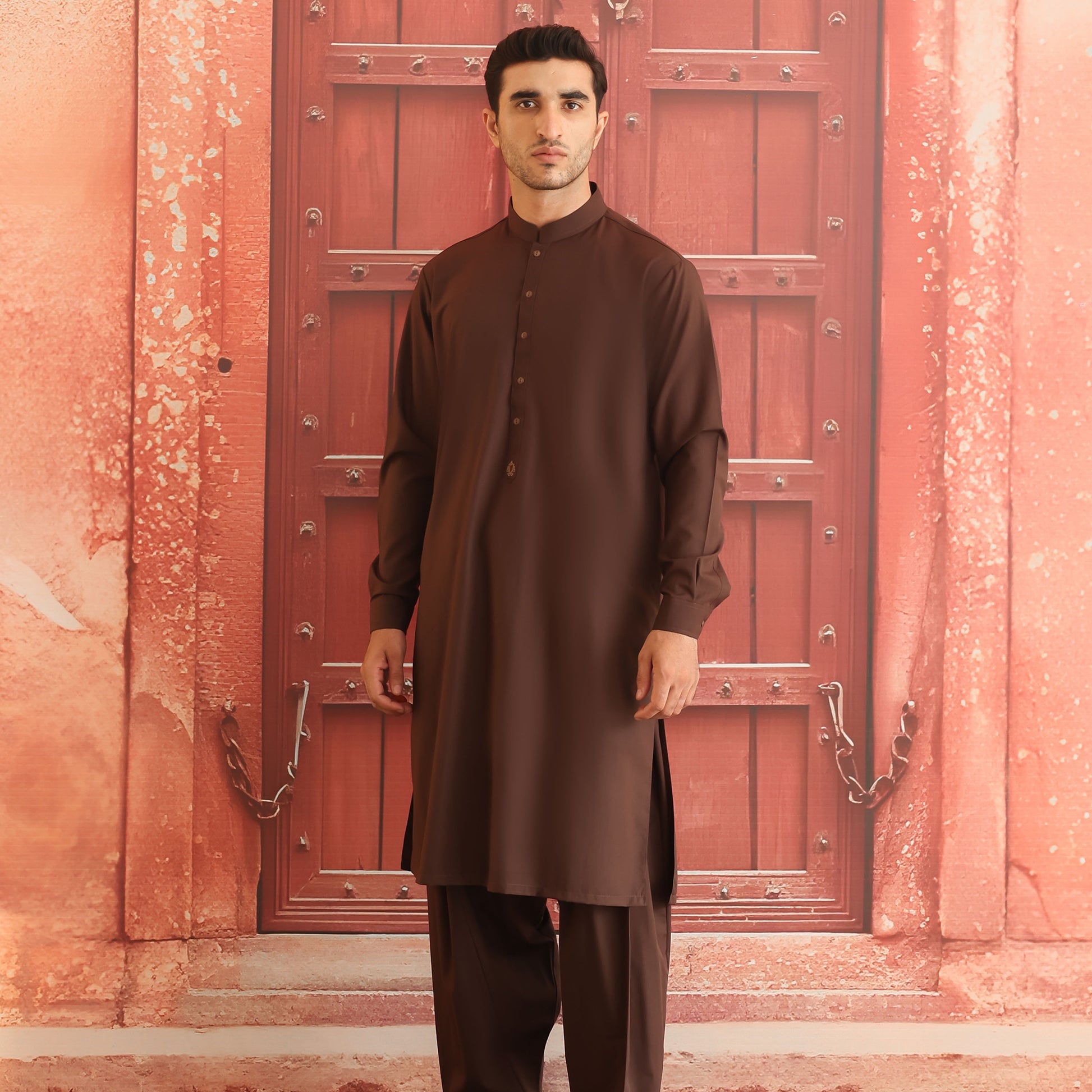 Crafted in Pakistan for the Summer ’25 collection, this dark brown suit is made from a premium poly viscose blend that is crease resistant, easy to iron, and elegantly versatile. Designed with a shirt collar, normal placket, and plain finish, it’s perfect for evening wear and formal occasions. Cut in a classic fit easy through the chest and sleeves with a tailored waist and hip this two-piece suit includes a matching dark brown classic-fit shalwar in the same refined fabric for a polished, timeless look.