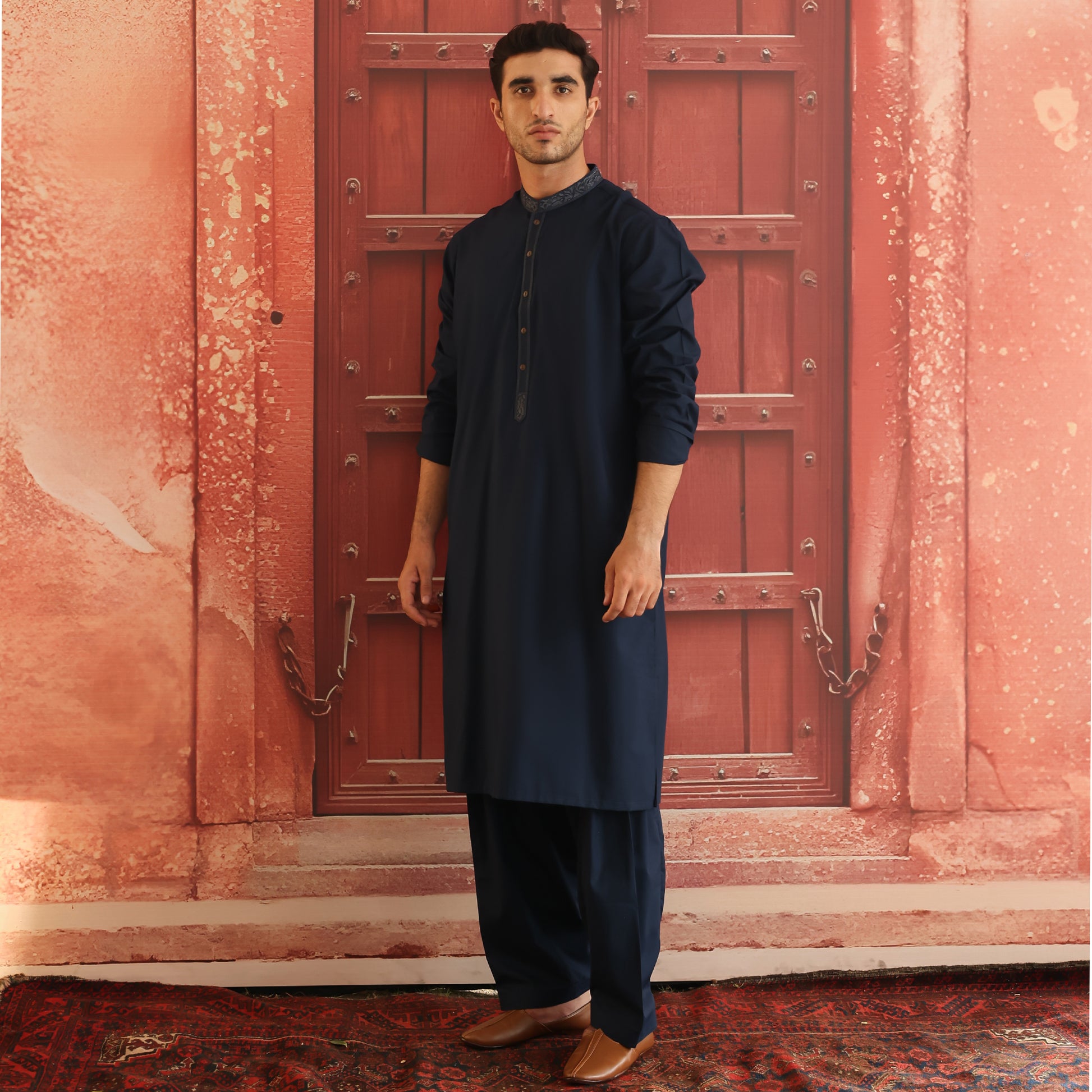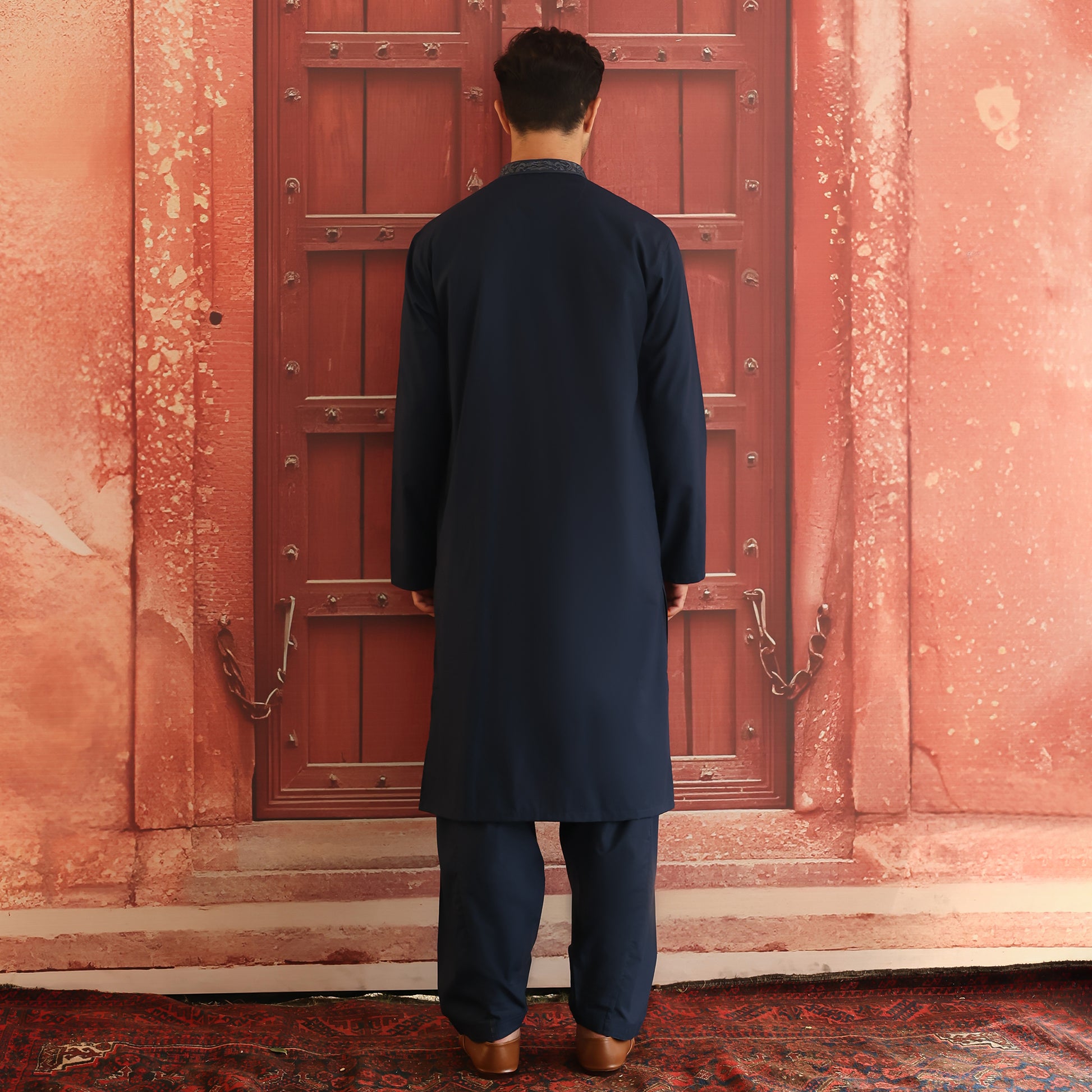 Crafted in Pakistan as part of the Summer 25 Collection, this Moonlit Ocean suit is tailored from a poly-viscose blend that offers crease resistance, easy maintenance, and refined elegance. Designed for versatile wear, it features an embroidered collar and a plain placket, combining subtle detail with timeless sophistication. Perfect for evening wear and formal occasions, the suit is cut in a classic fit, offering a tapered silhouette through the chest, sleeves, waist, and hip. This two-piece ensemble is completed with a matching Moonlit Ocean shalwar in the same premium fabric, creating a polished and graceful look.