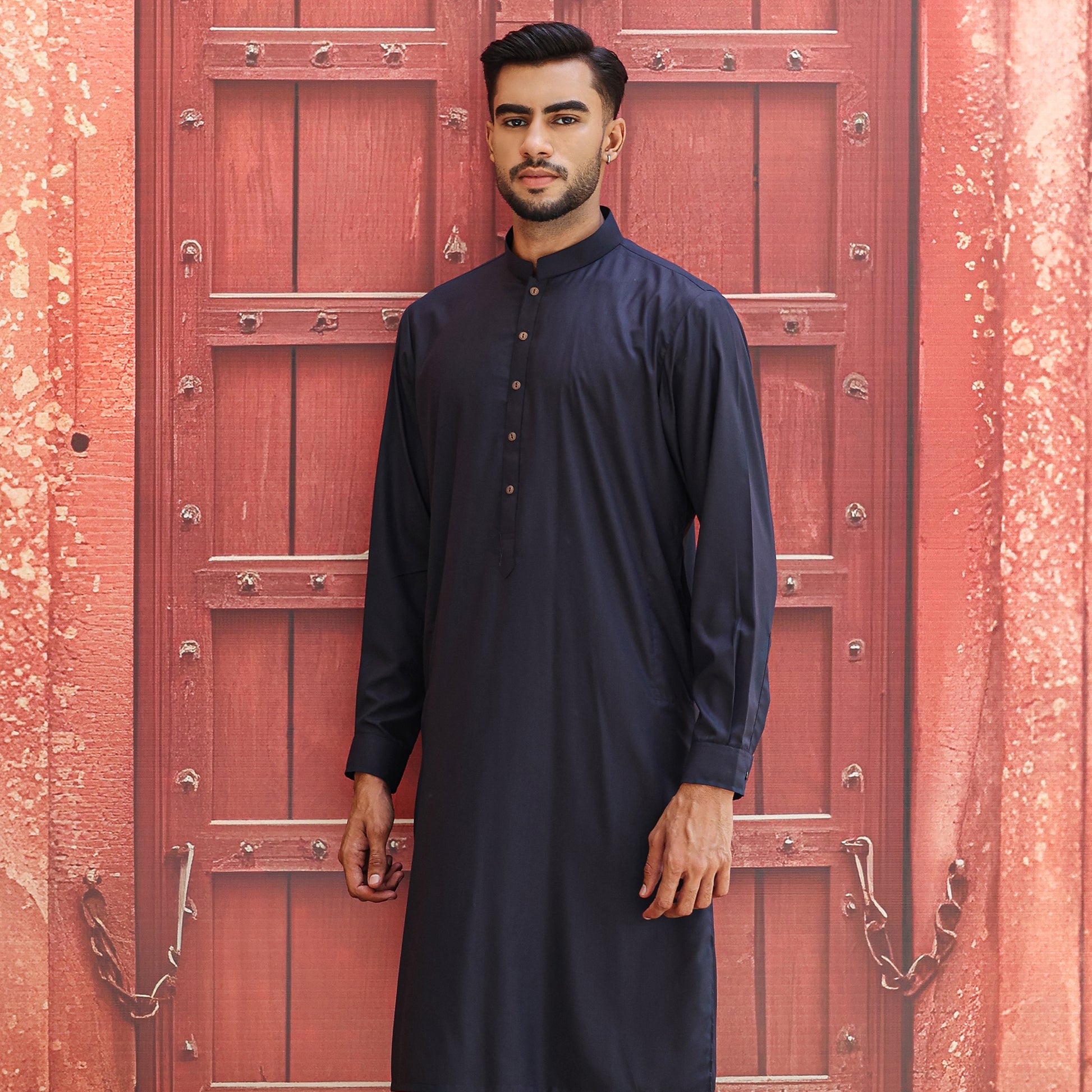 Crafted in Pakistan for the Summer ’25 collection, this Navy Blazer suit is tailored from a premium poly viscose blend that is crease resistant, easy to iron, and elegantly versatile. Designed with a band collar and normal placket with plain detailing, it’s ideal for evening wear and formal occasions. Cut in a slim fit—tapered through the chest, sleeves, waist, and hip this two-piece suit comes complete with a matching Navy Blazer slim-fit shalwar in the same refined fabric for a sharp, contemporary look.