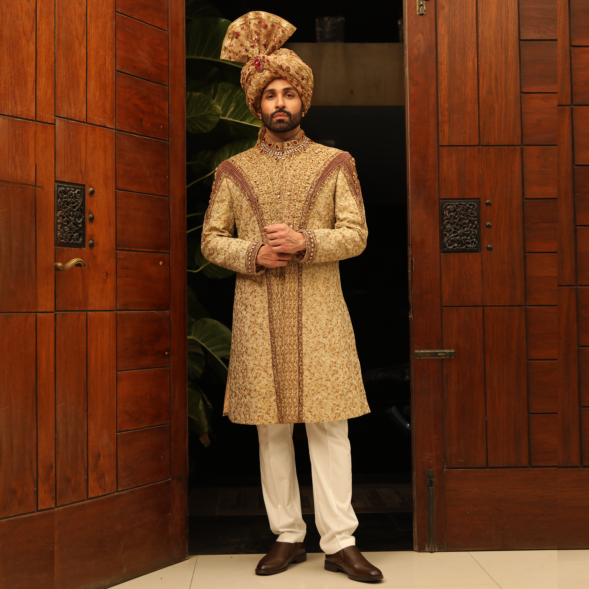 Premium Jamawar Gold Sherwani with Hand Embroidery on Collar, Neckline & Cuffs An opulent gold jamawar sherwani featuring fully hand-embroidered detailing on the collar, neckline, and cuffs. This regal design blends heritage craftsmanship with luxurious elegance, making it the perfect choice for weddings, receptions, and grand festive occasions.