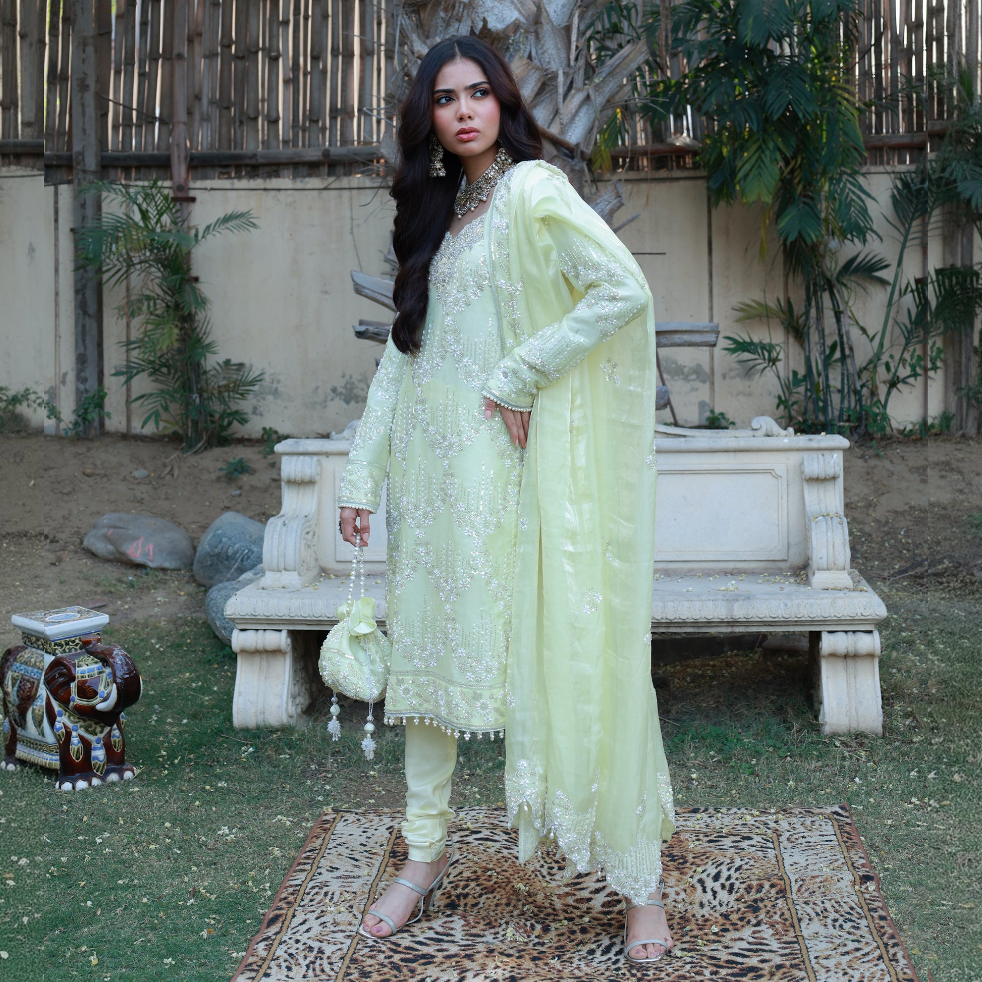 Graceful lemon yellow lava silk knee-length shirt featuring a round neckline with hand and machine embroidery, enhanced with delicate cutdana work. Paired with a classic churidar pant for a refined silhouette. The look is completed with a lava silk dupatta adorned with cutdana detailing and pearl finishing, along with a matching potli  perfect for festive and formal occasions.