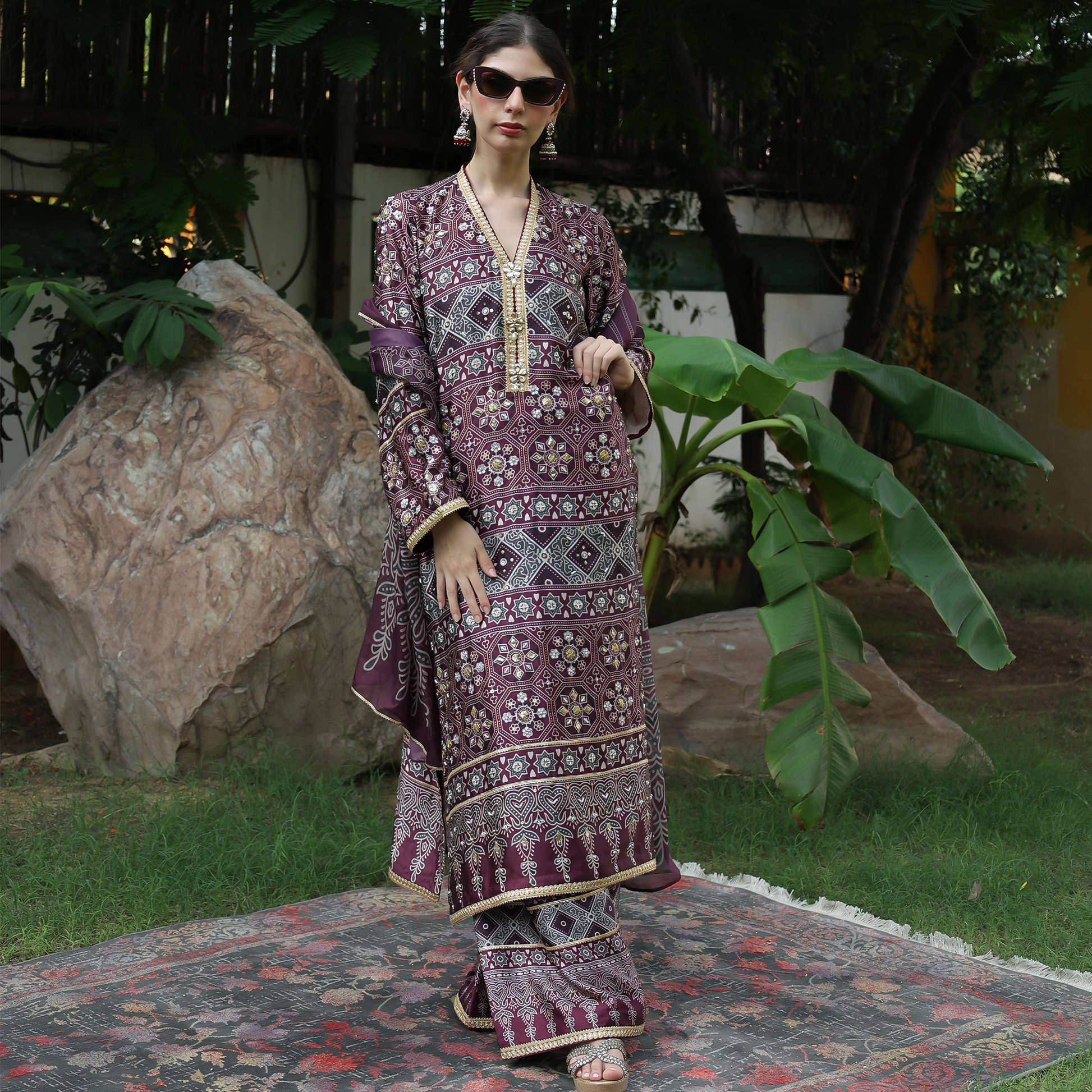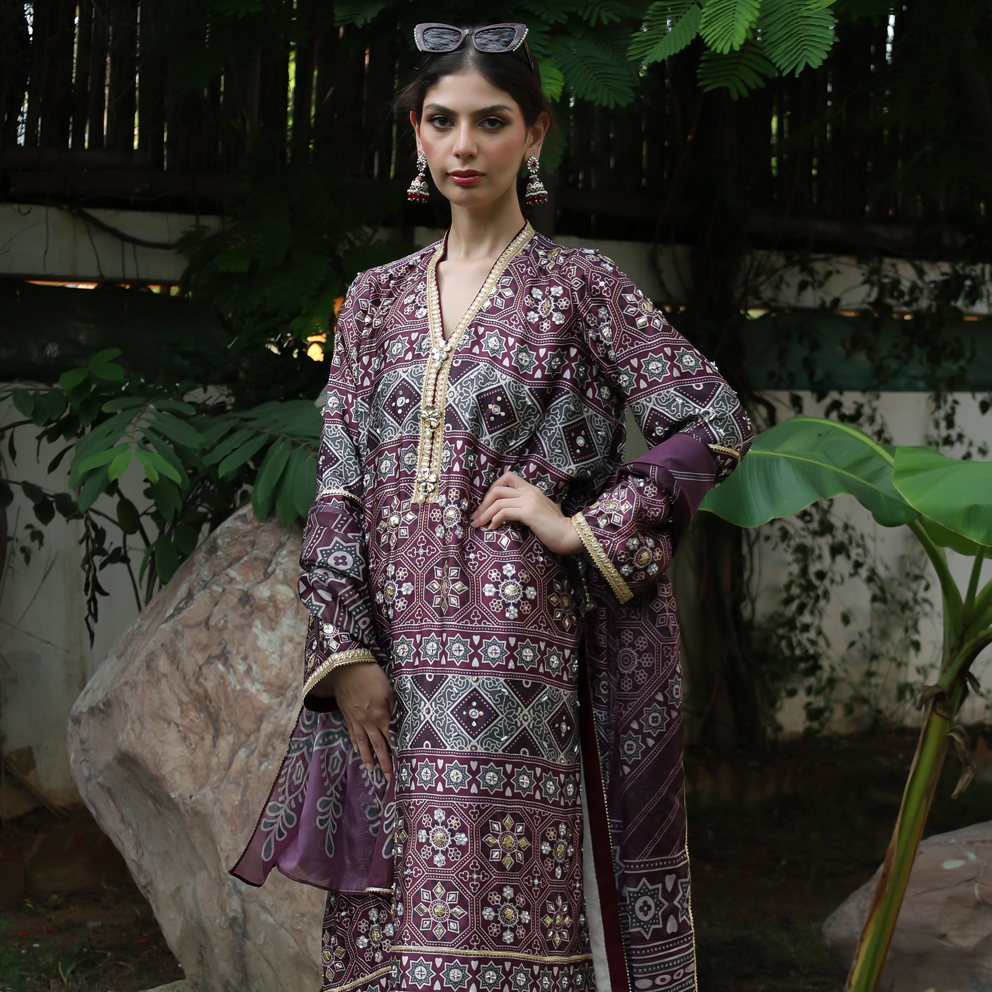 Embrace elegance with this Ajrak print silk shirt featuring a V-neckline, hand-embroidered sleeves, and intricate gota work throughout. The printed silk fabric highlights refined craftsmanship with a straight band and gota-detailed hem, offering a look that’s both traditional and timeless. Paired with a matching dupatta adorned with four-side gota finishing, this Ajrak-inspired designer ensemble is perfect for festive occasions, weddings, and formal gatherings  a true celebration of Pakistani heritage and luxury fashion.