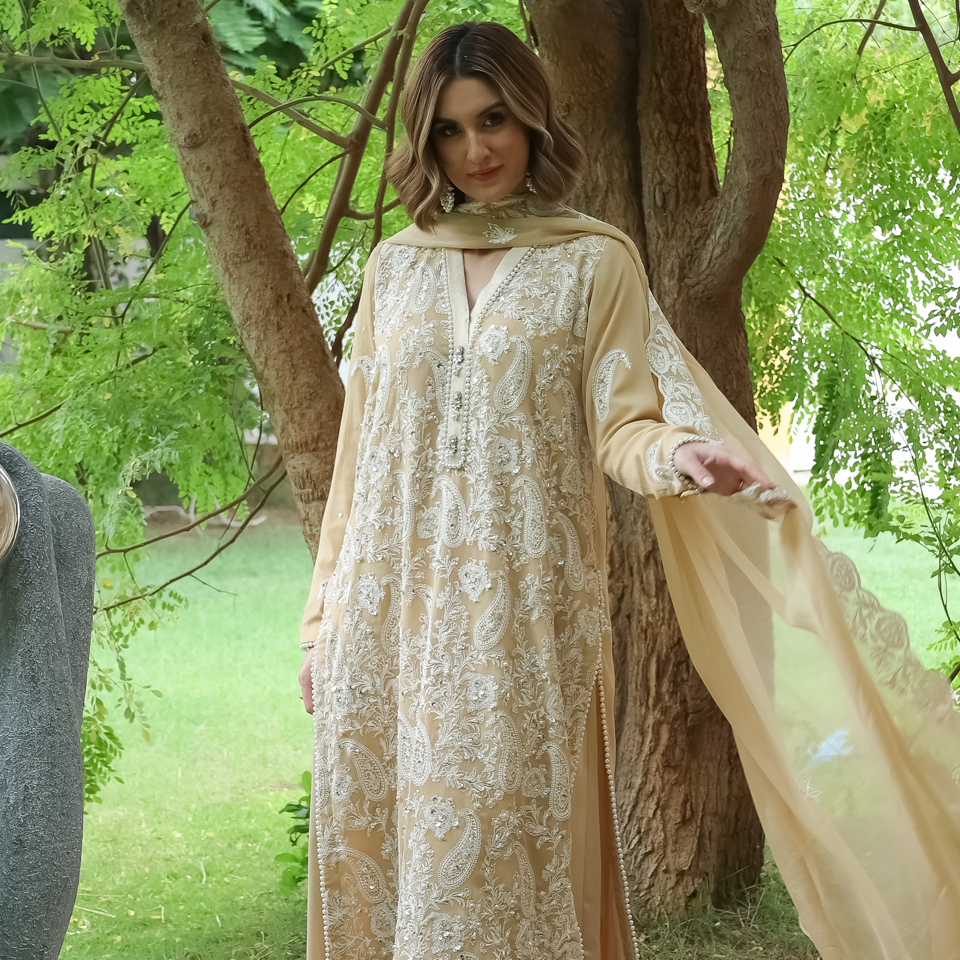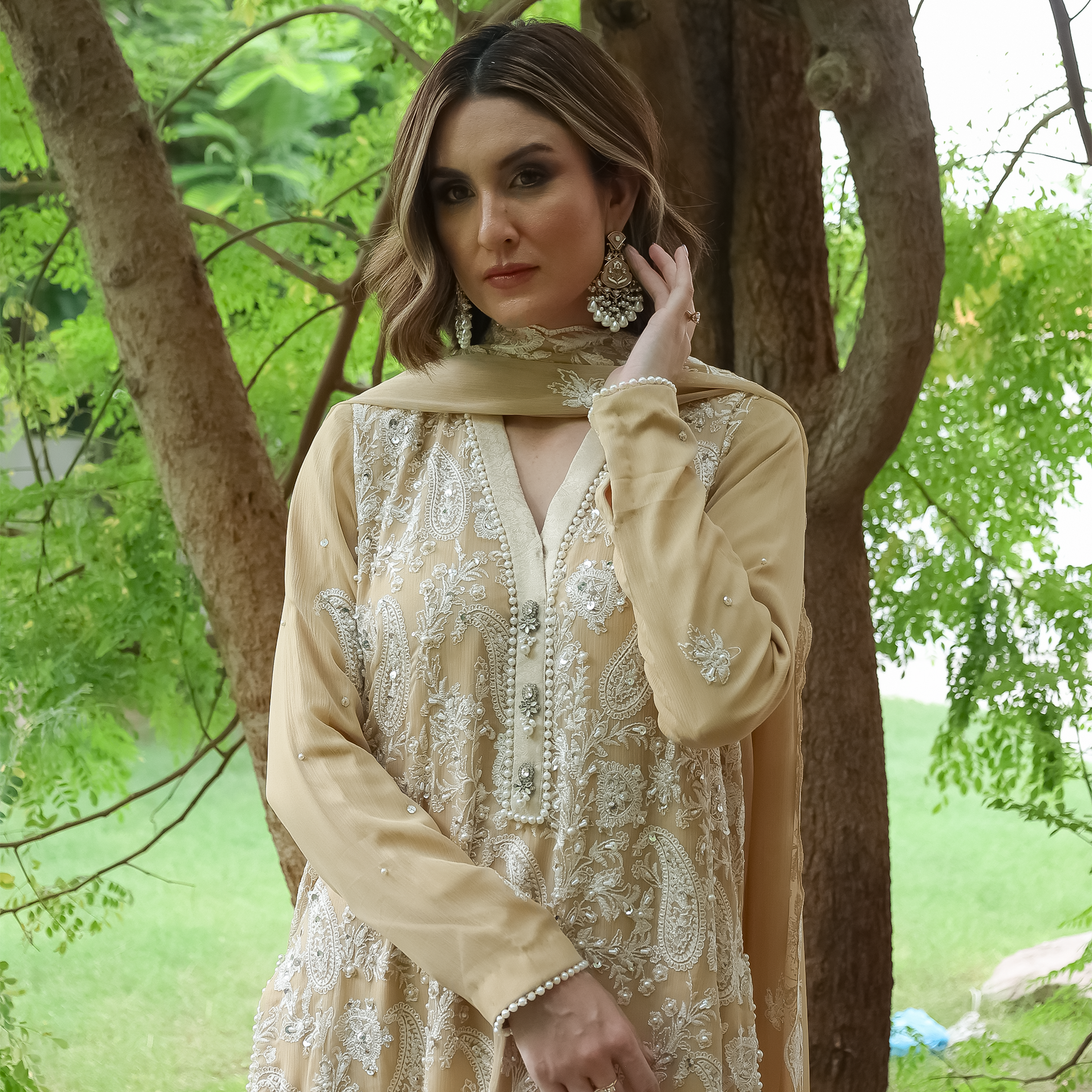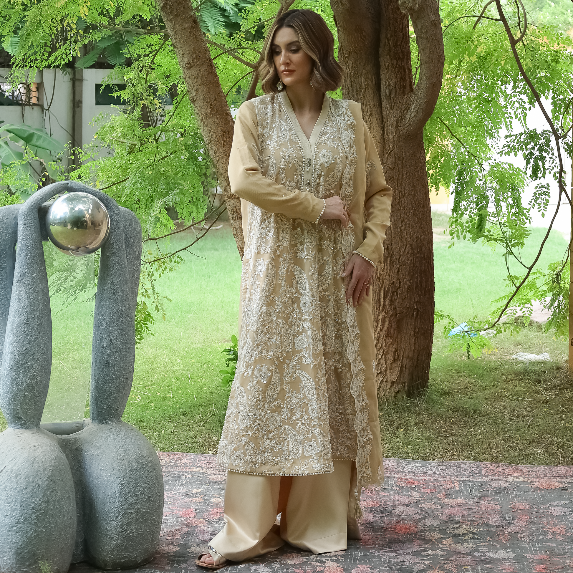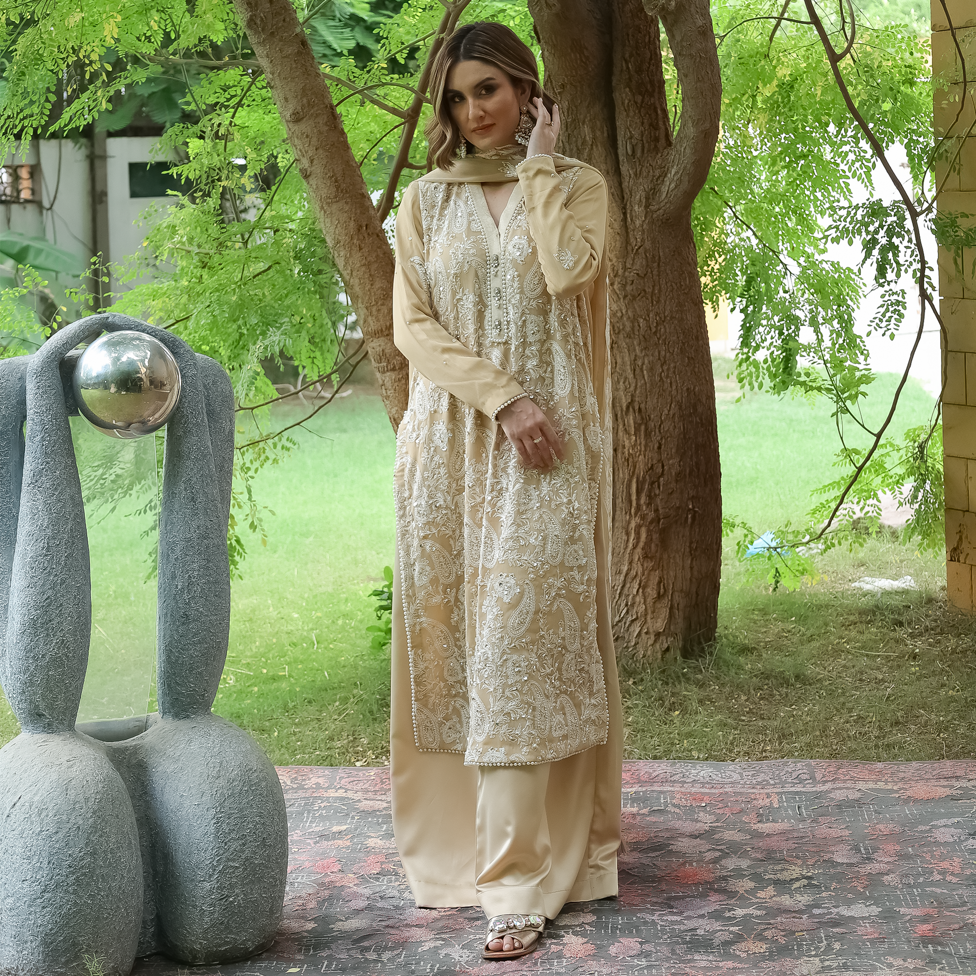 This elegant beige outfit features a kimono neckline long shirt adorned with paisley embroidery and hand-to-machine embellishment throughout with button detail. The design is completed with pearl-detailed lace finishing, satin silk wide-leg pants, and a chiffon embroidered dupatta that adds a soft, graceful touch. Perfect for formal occasions, festive wear, and wedding events, this ensemble combines traditional craftsmanship with modern sophistication.