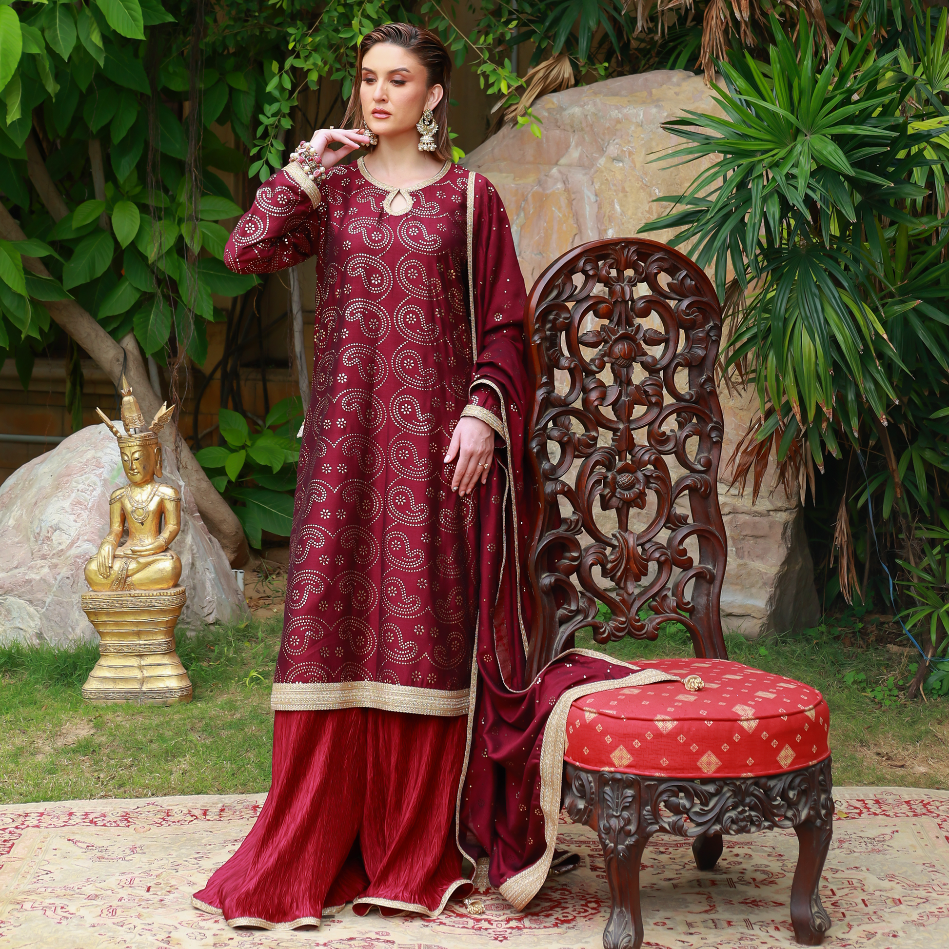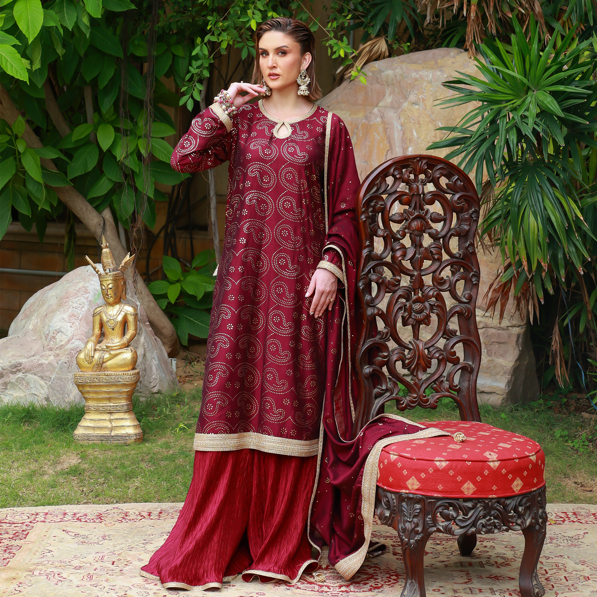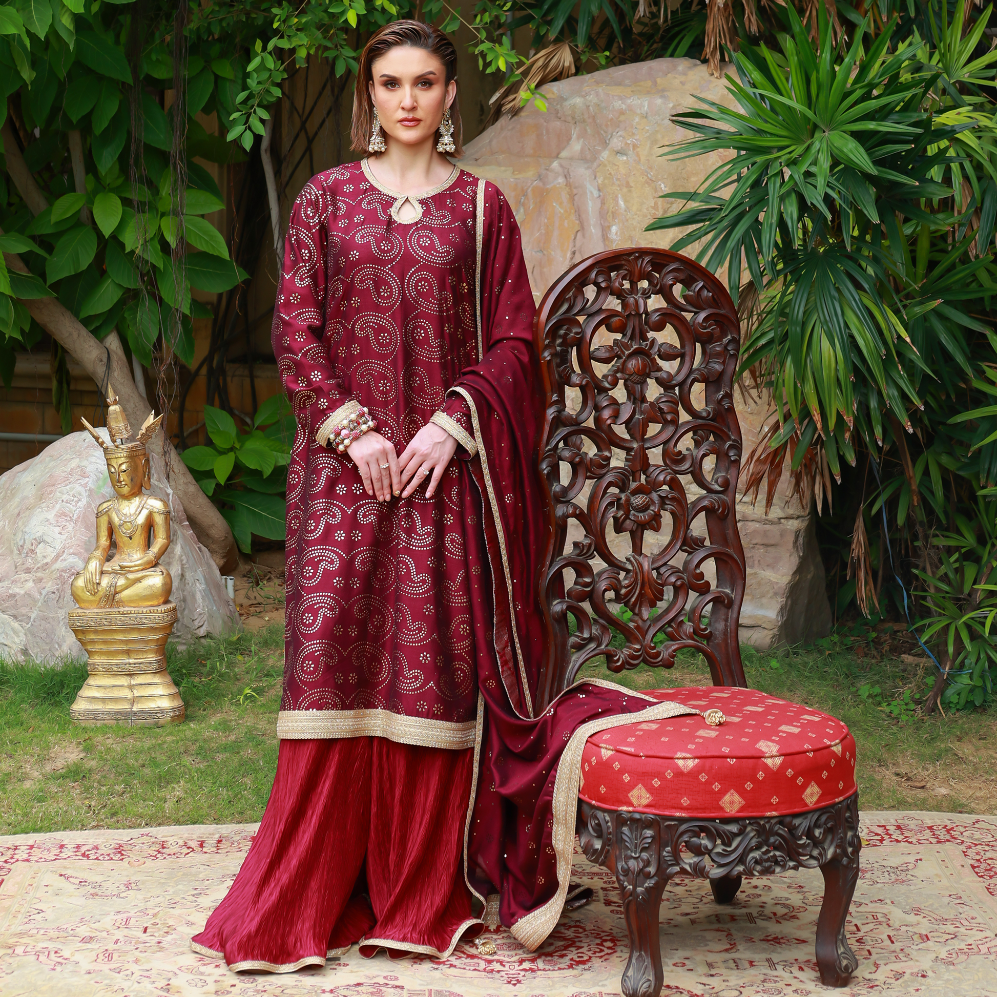 Maroon kamdani long shirt with a keyhole neckline adorned with gota lace, featuring additional gota detailing on the borders and sleeves, accented with a tassel on the side. Paired with a silk crushed gharara finished with a gota border, and a kamdani dupatta edged with gota on all four sides and tassels along the corners.