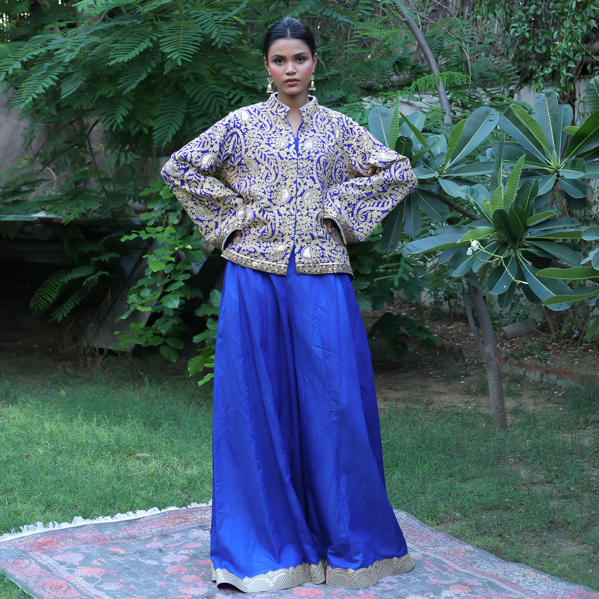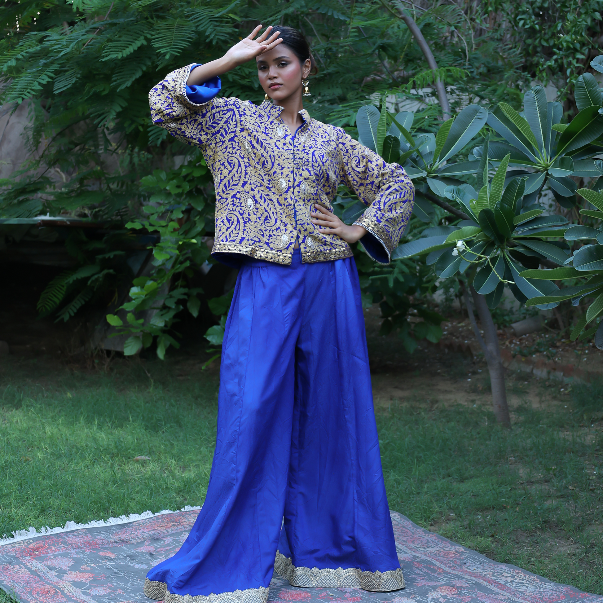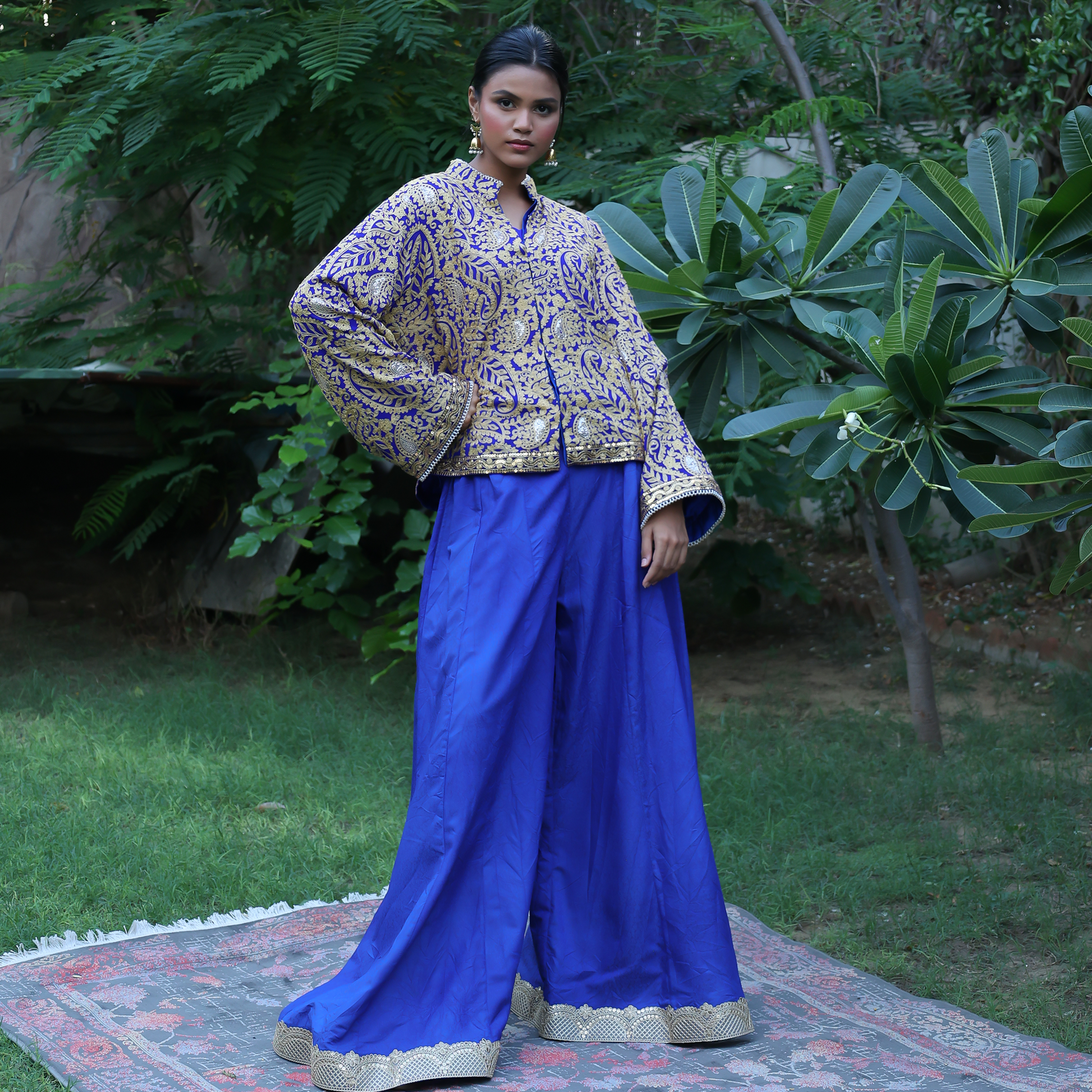 The royal blue jacket features intricate gold machine embroidery across its surface, with lace and pearl finishing on the sleeves and hem for a touch of luxury. Styled with plazo pants showcasing delicate gota work, this outfit is perfect for formal dinners, festive evenings, or wedding celebrations. The contrast of blue and gold captures an effortlessly regal look that defines modern tradition.