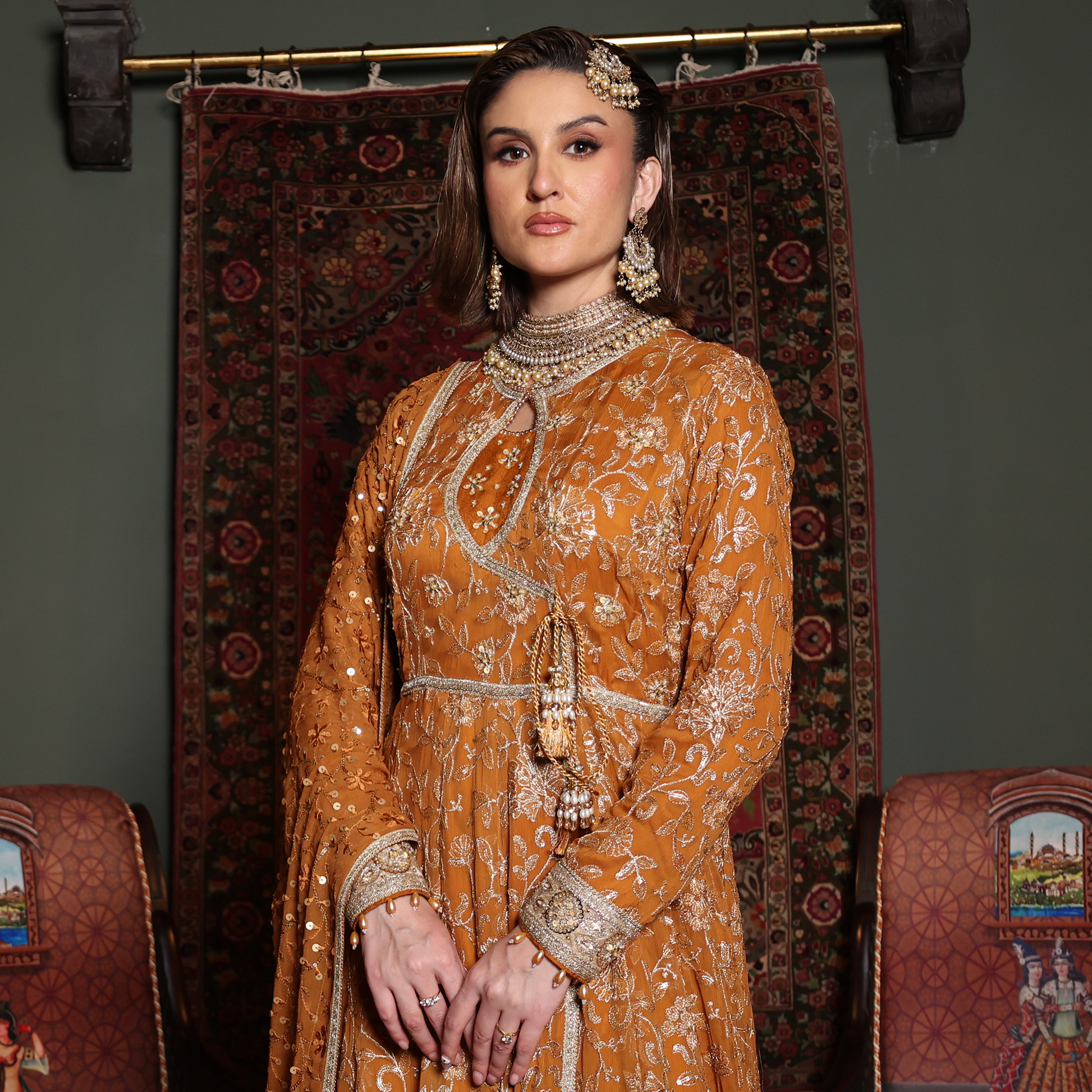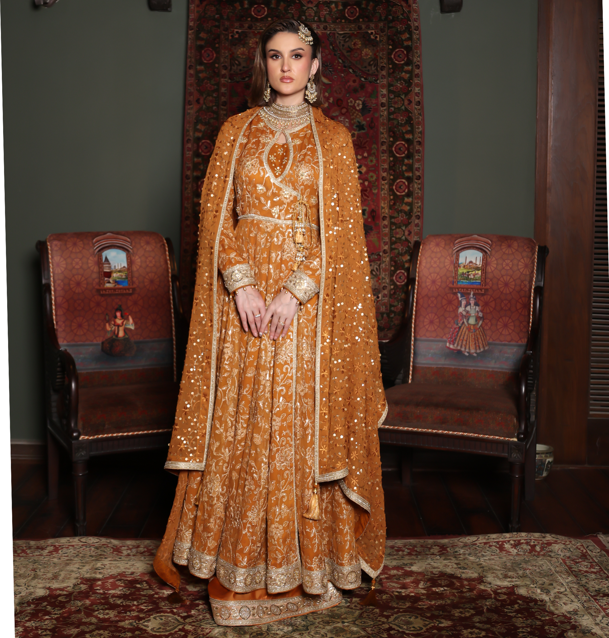 A delicately embroidered Mustard chiffon angrakha-style slit pishwas, featuring a round neckline enhanced with gota lace and intricate handwork along the borders and sleeves. Paired with lava silk pants finished with a subtle gota border, and a beautifully embroidered chiffon dupatta adorned with gota detailing and tassels on all four sides a graceful ensemble that blends timeless tradition with refined elegance.