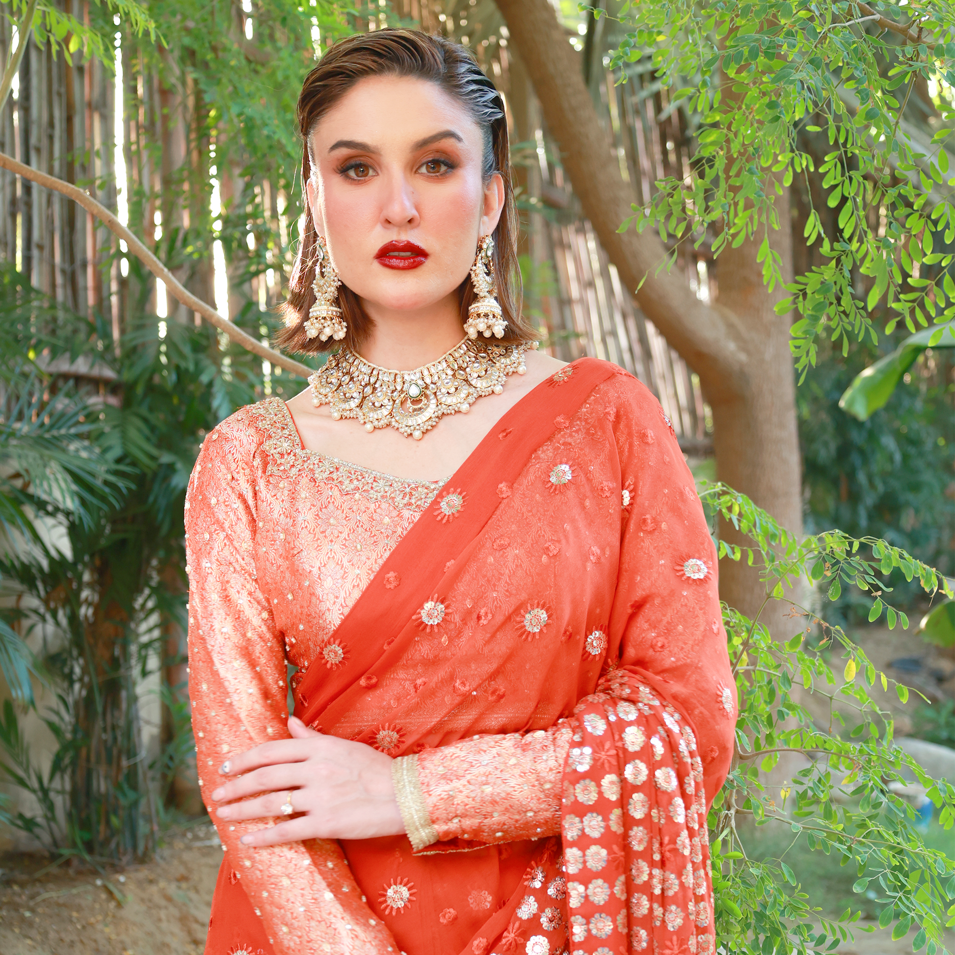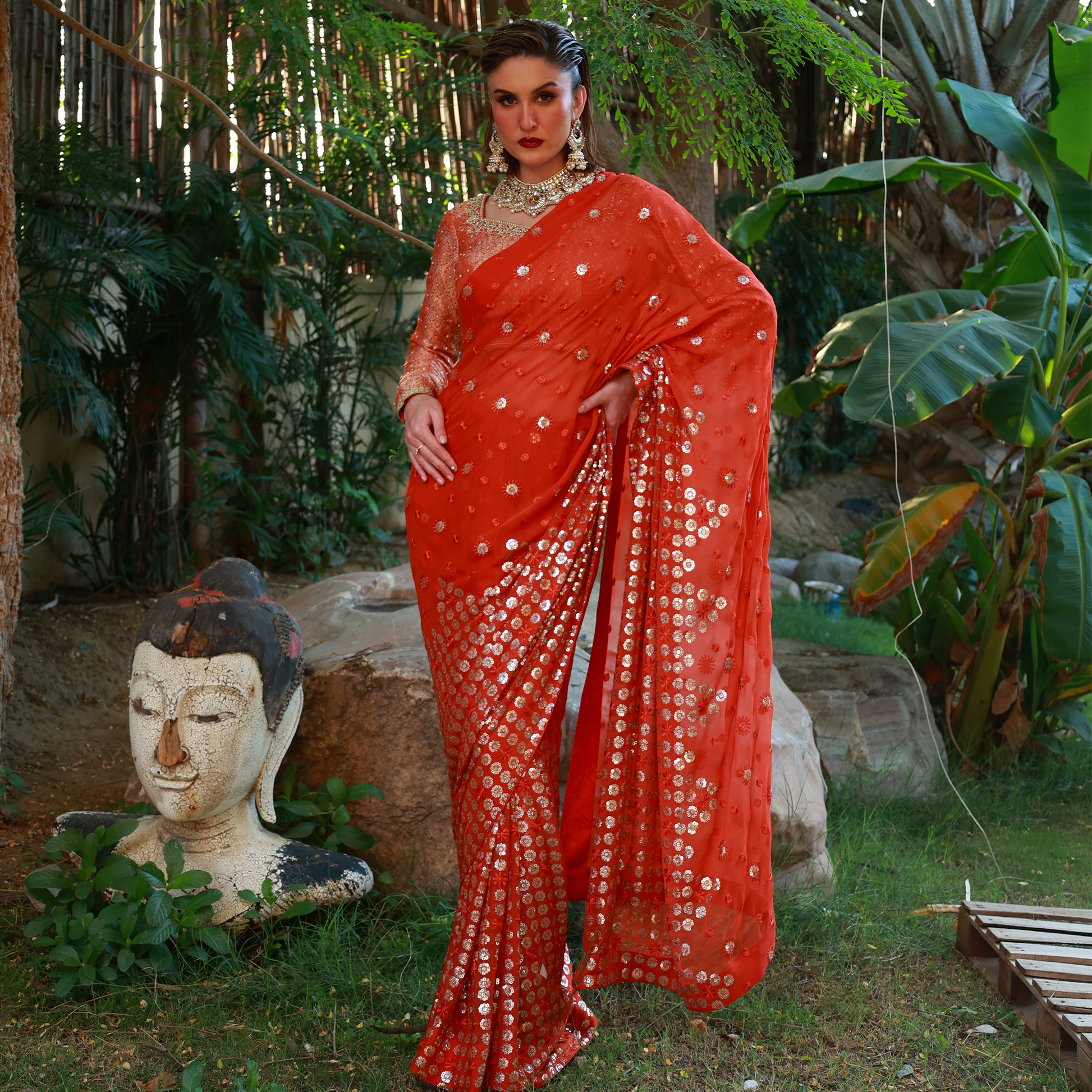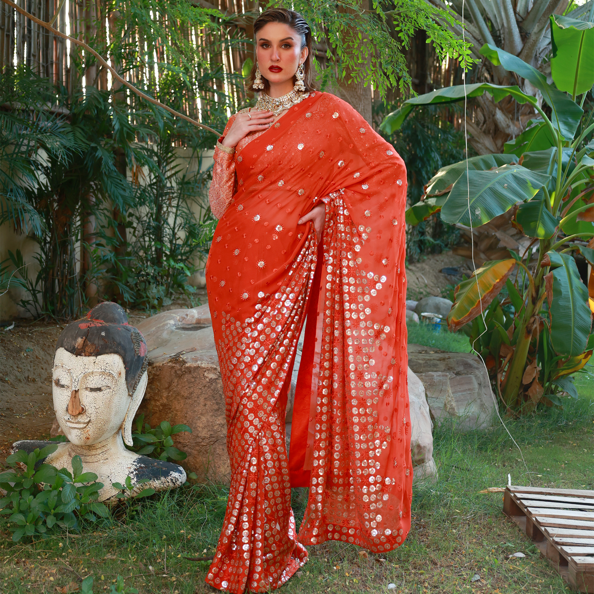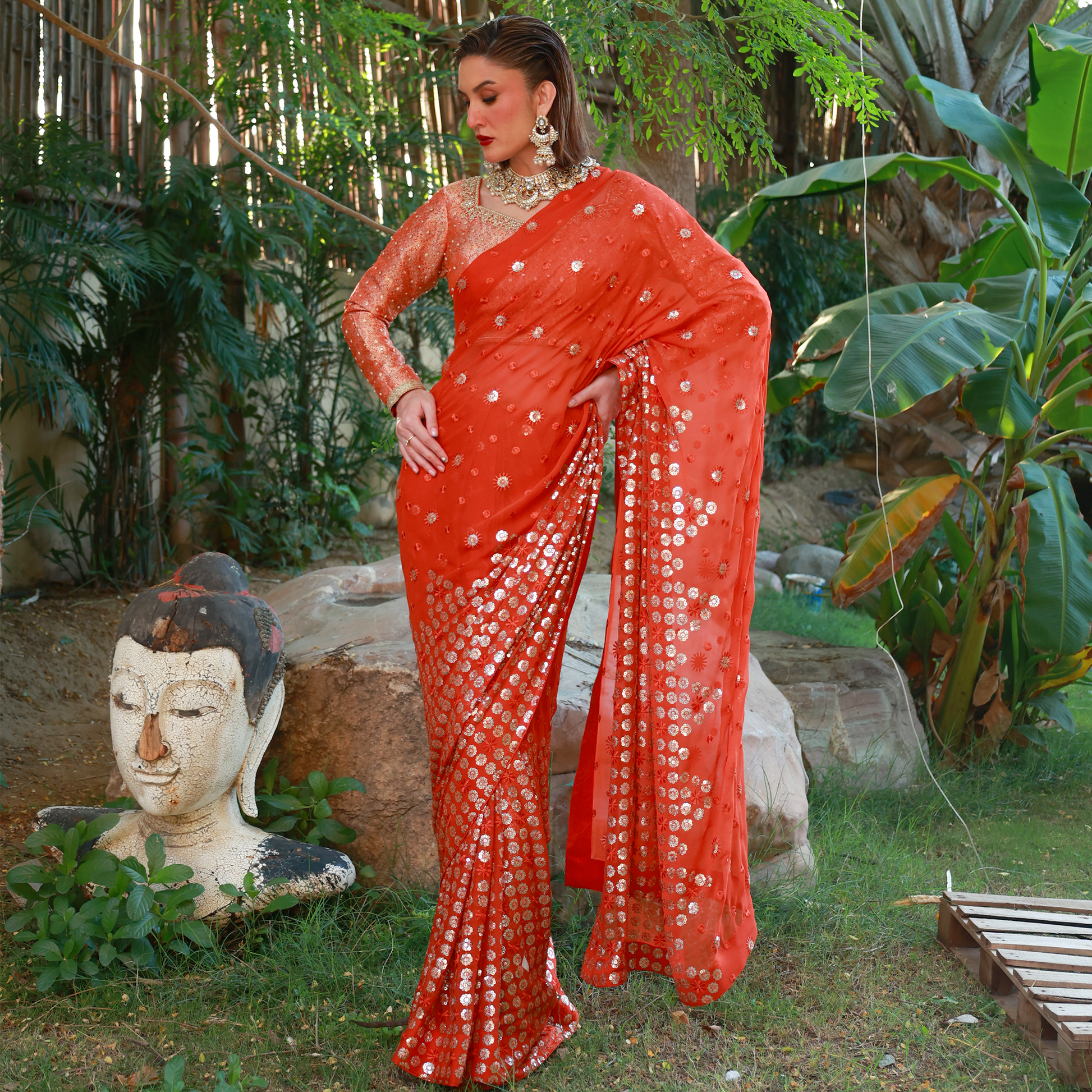 Chiffon orange sequin-embroidered saree paired with a jamawar blouse featuring a hexagon neckline, enhanced with intricate hand and machine embroidery. The blouse is designed with full fitted sleeves adorned with gota work on the sleeve and blouse hems, complemented by an orange short silk patti coat for a refined festive look.