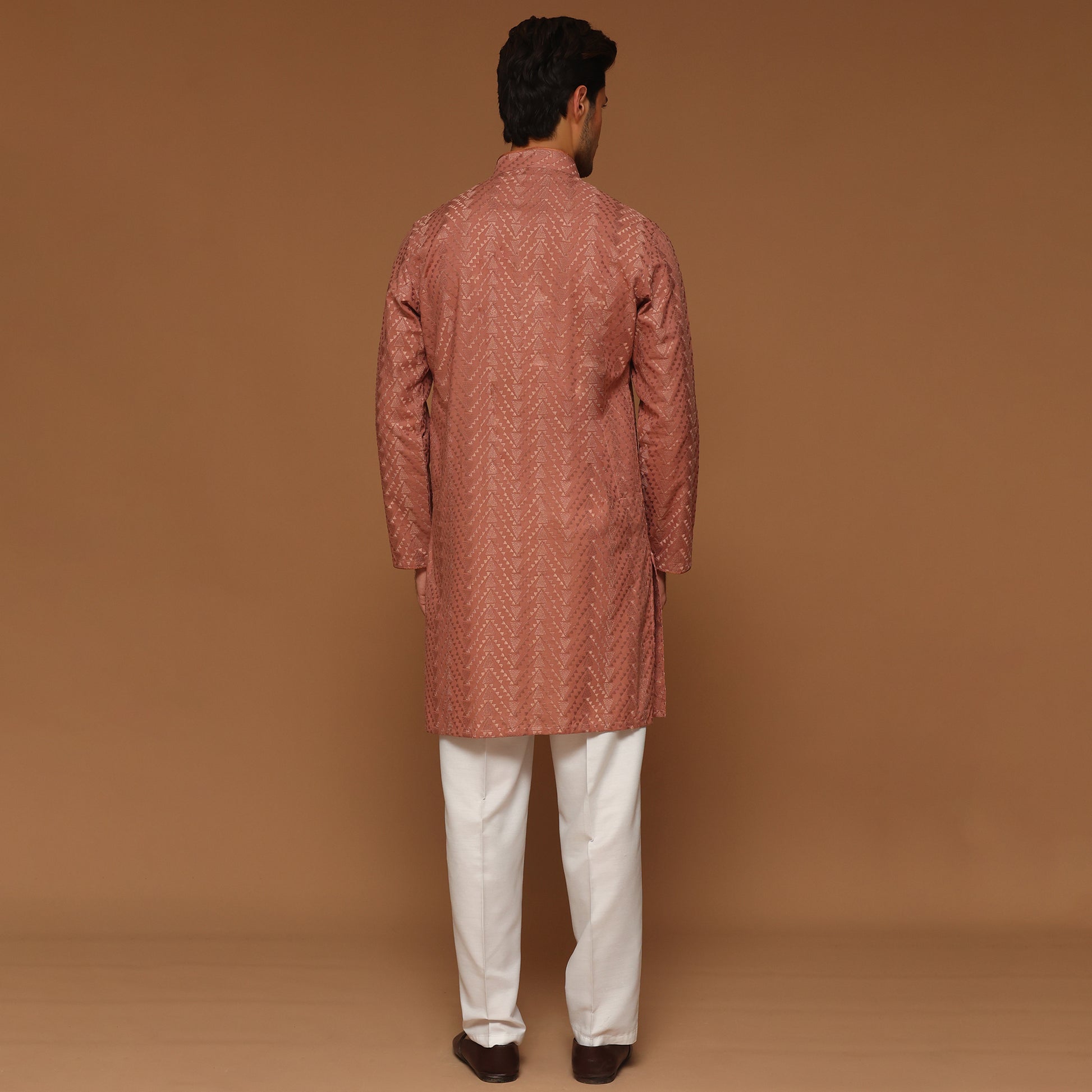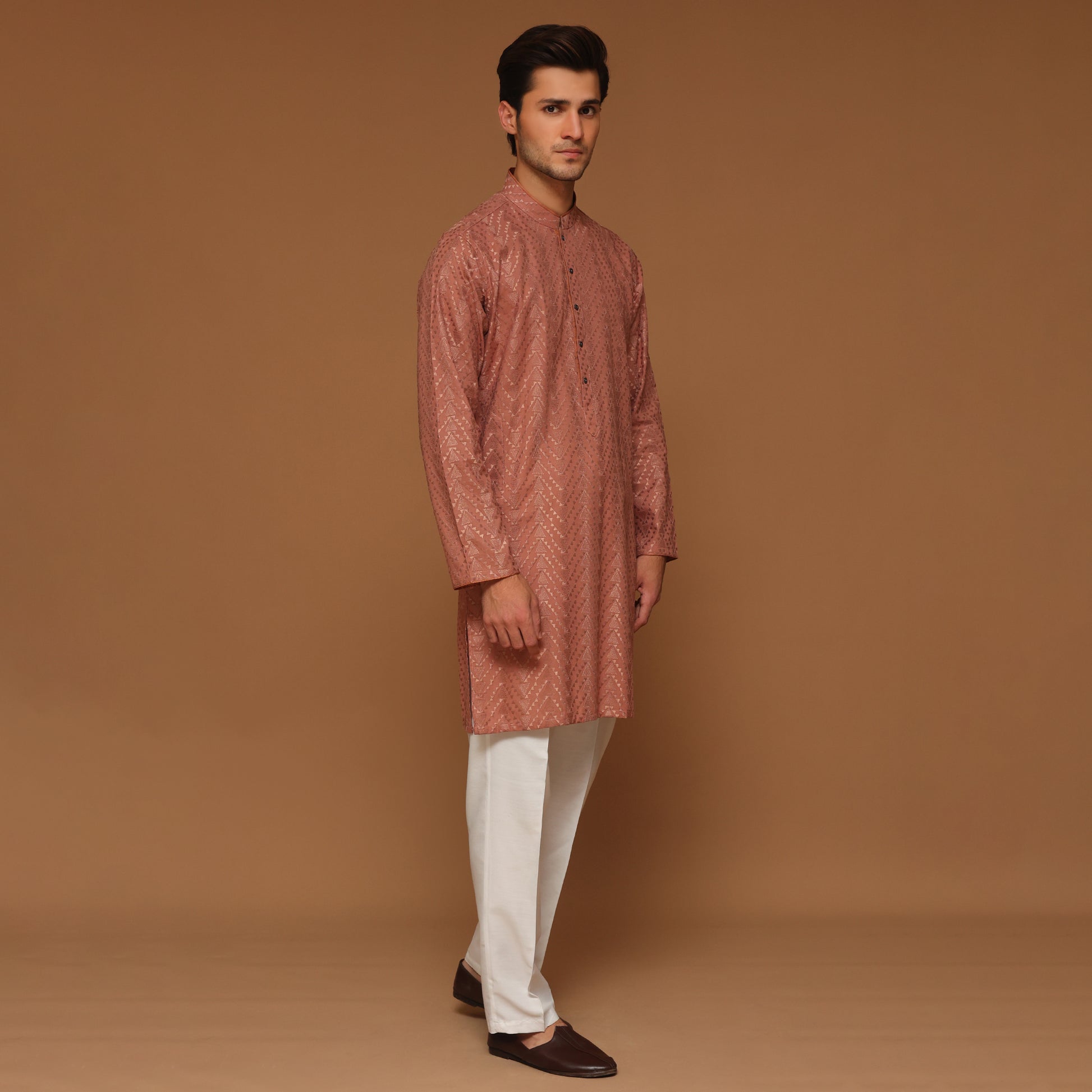 Crafted in Pakistan for the 2025 collection, this Salmon kurta is made from a premium cotton blend that is crease resistant, easy to iron, and elegantly versatile. Designed with a normal band collar and normal placket with clean plain features, it’s ideal for evening wear and special occasions. Cut in a slim fit providing ease through the chest and sleeves with a tailored waist and hip, it offers a refined, modern silhouette for any formal or festive setting.