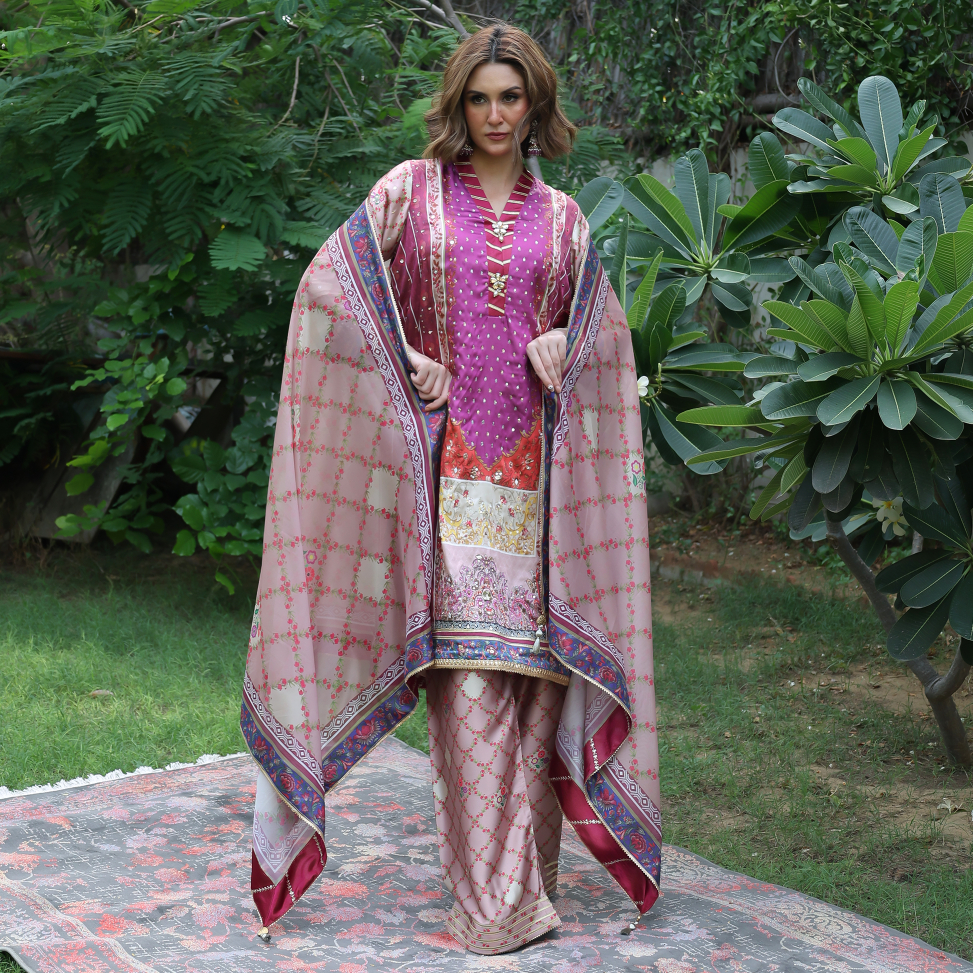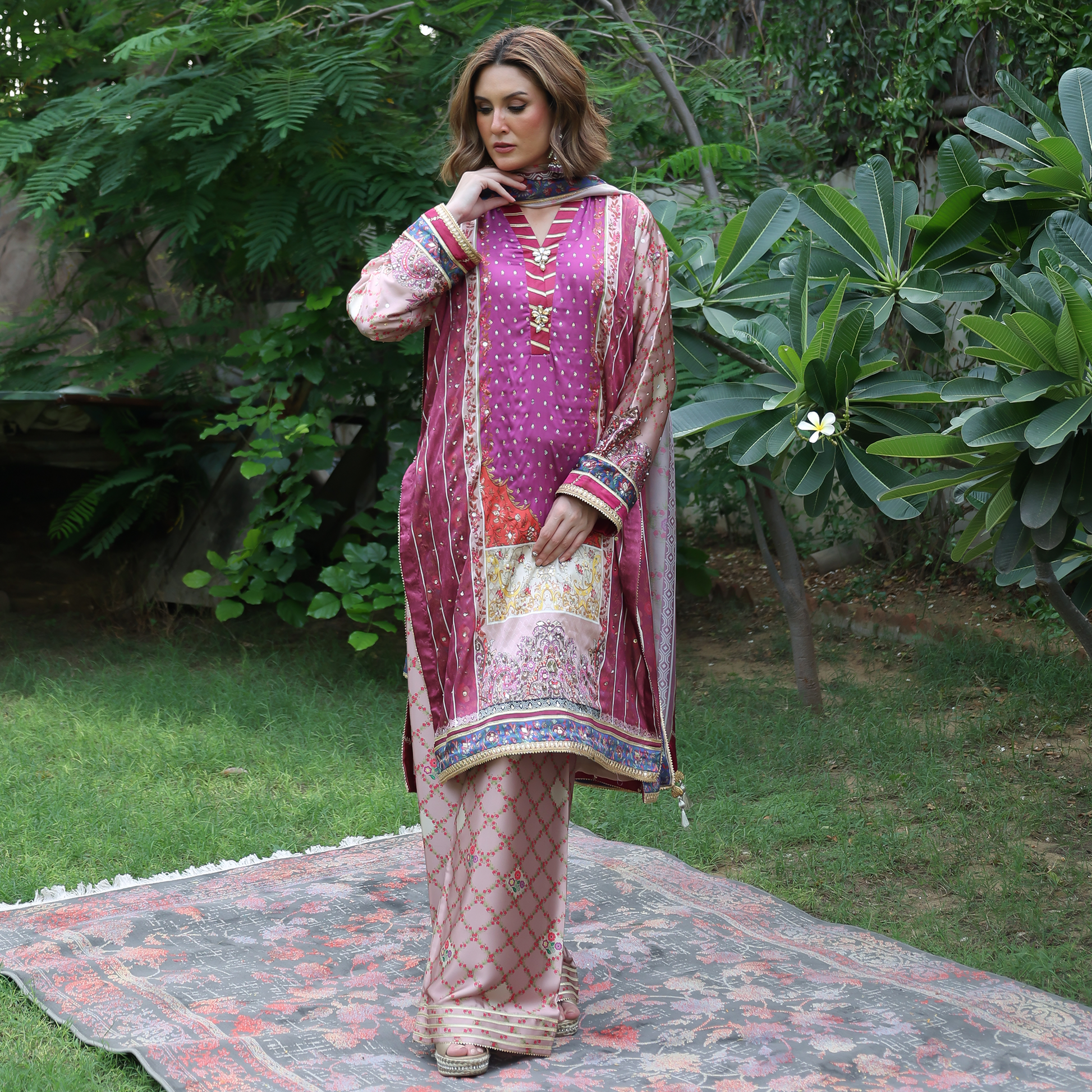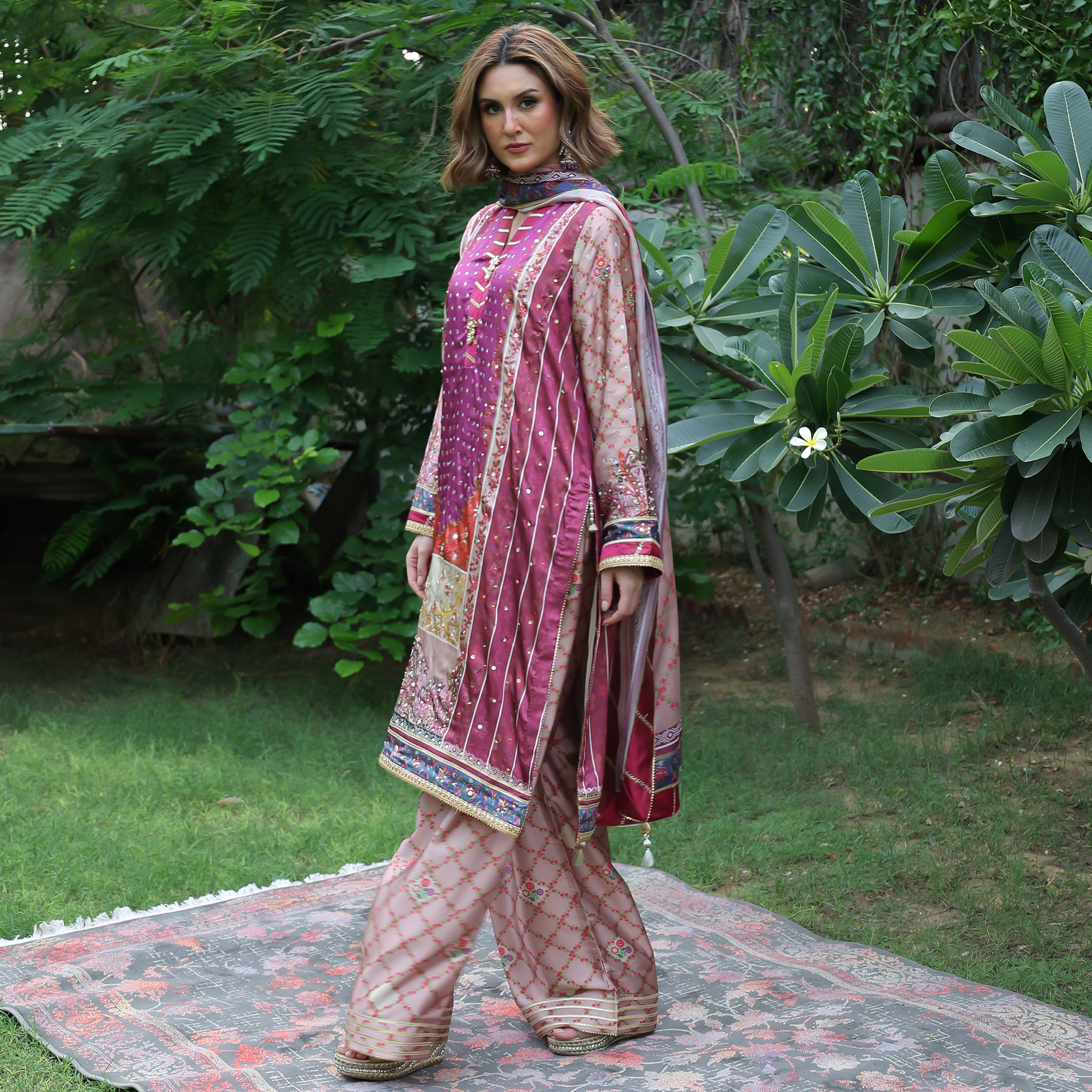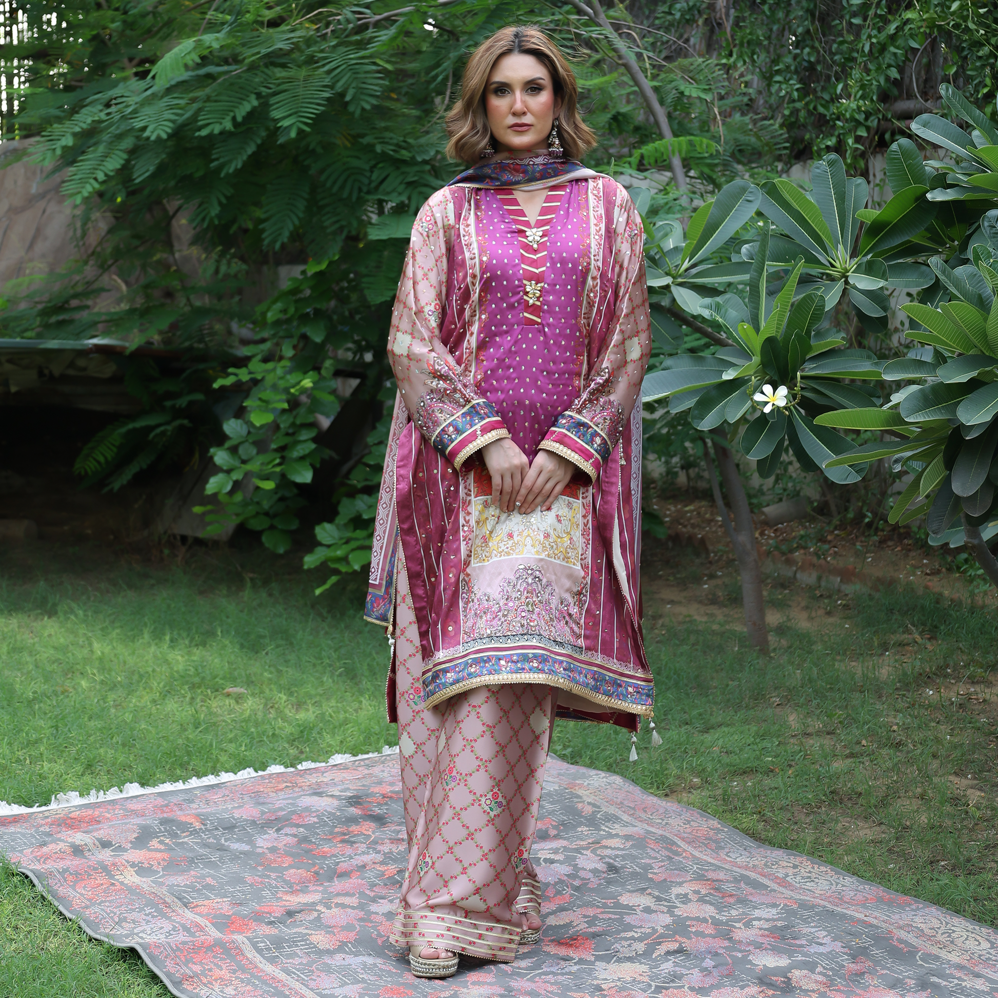 Embrace elegance with this pink silk shirt featuring a Kimono collar, hand-embroidered sleeves, and intricate gota work all over. The printed silk shirt showcases refined craftsmanship with a straight band and gota-detailed hem, creating a look that’s both traditional and timeless. Paired with a matching dupatta finished with four-side gota detailing, this pink designer outfit is perfect for festive occasions and weddings, a true reflection of Pakistani craftsmanship and luxury fashion.