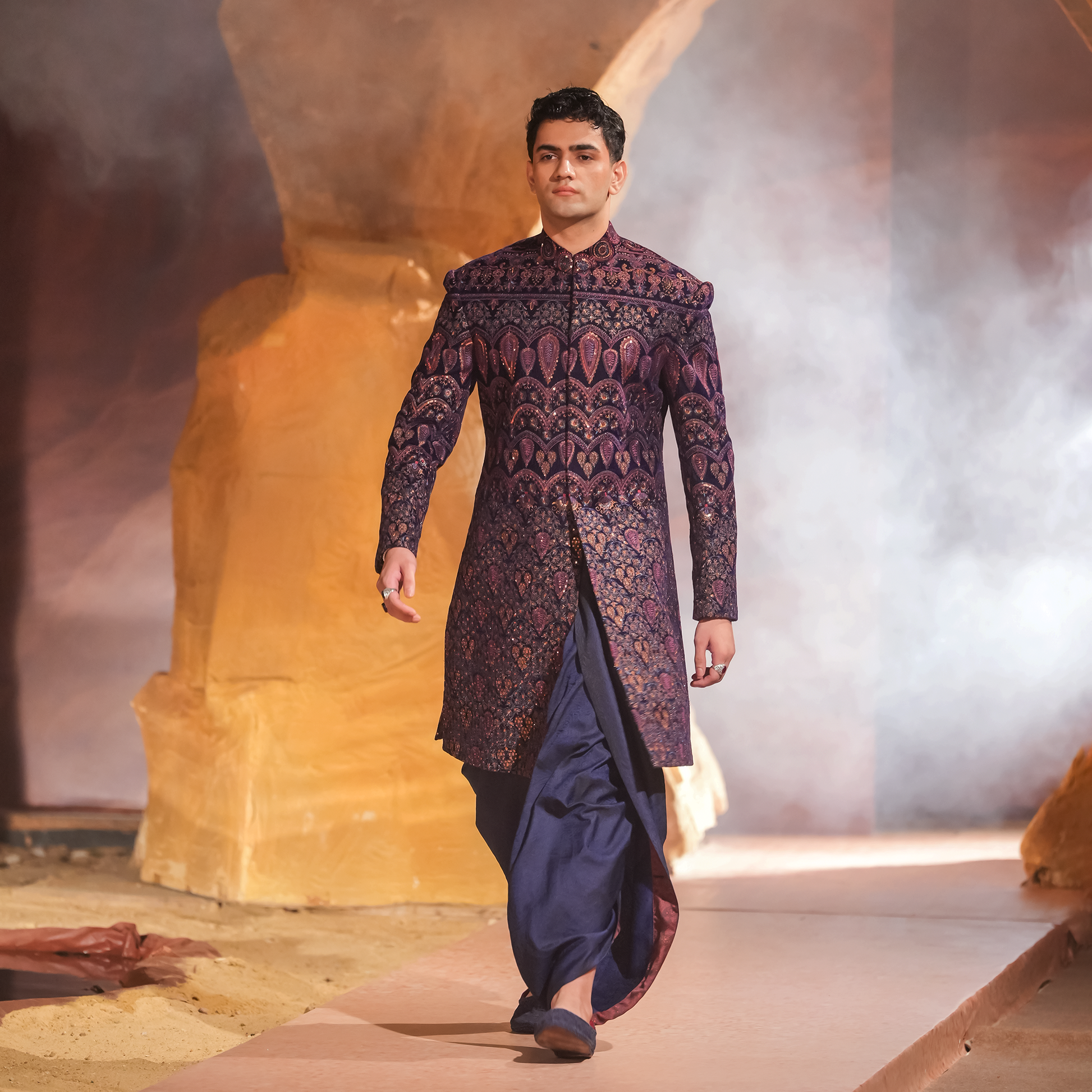 Crafted in Pakistan as a part of the Summer 25 collection, this sherwani Purple f The outer garment is created using Premium fabric that makes the garment soft yet structured. With a straight cut, this sherwani is tapered along the waist and hips to create a slim yet broad shouldered look. The regular fit allows for layering underneath and makes this garment perfect for formal occasions.