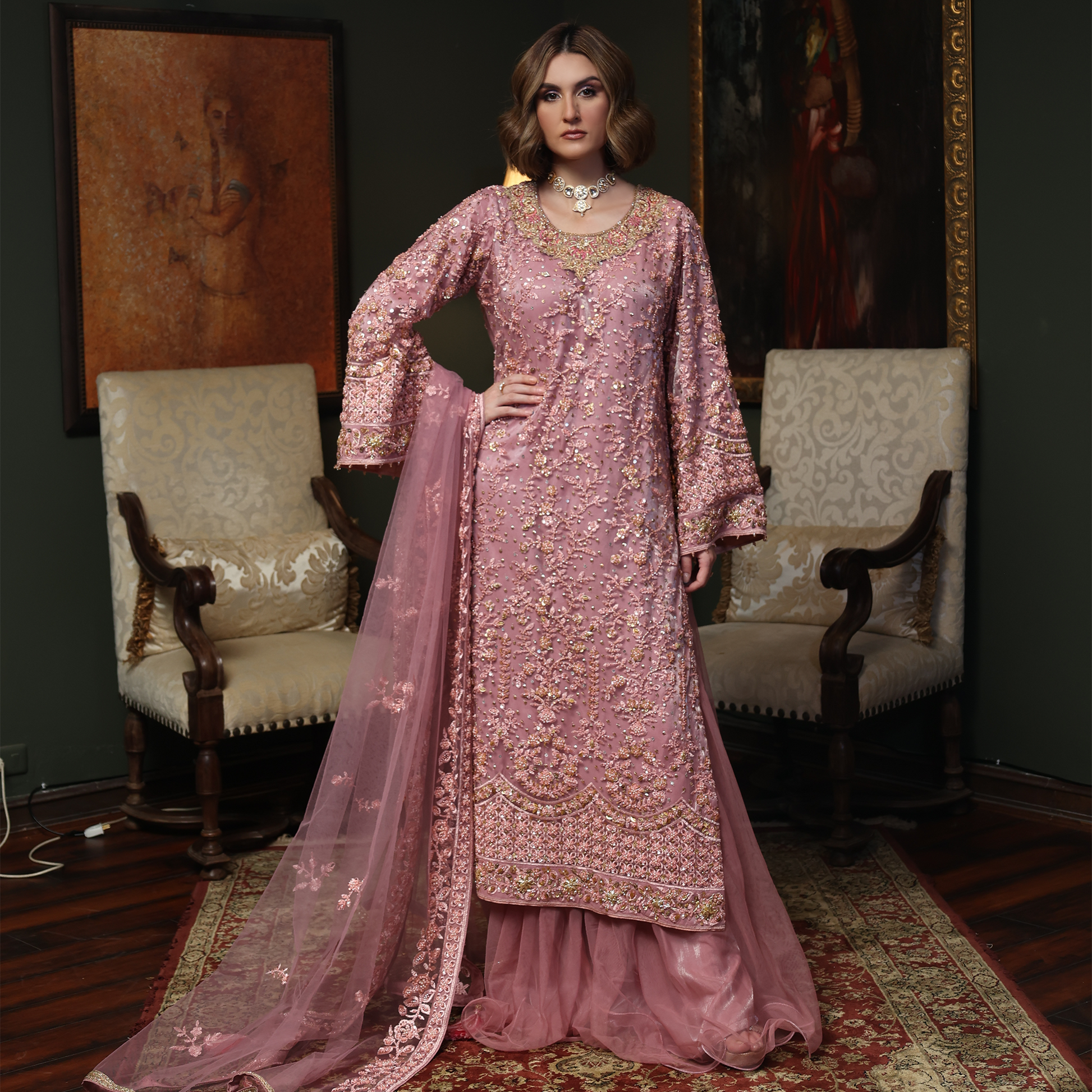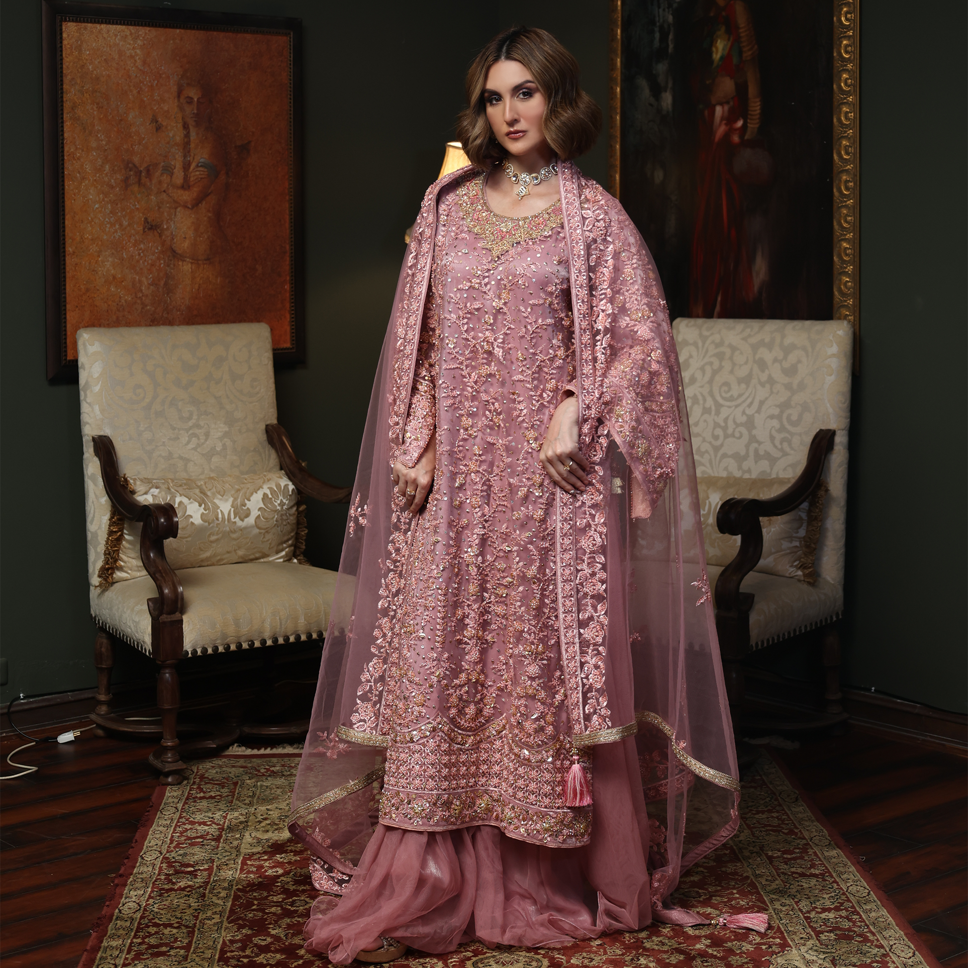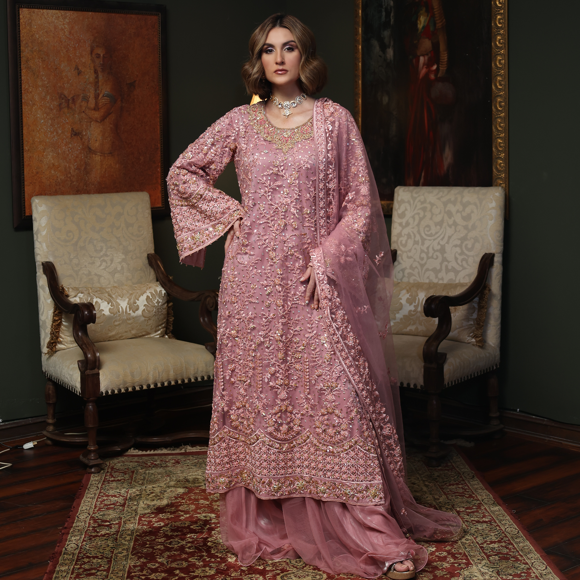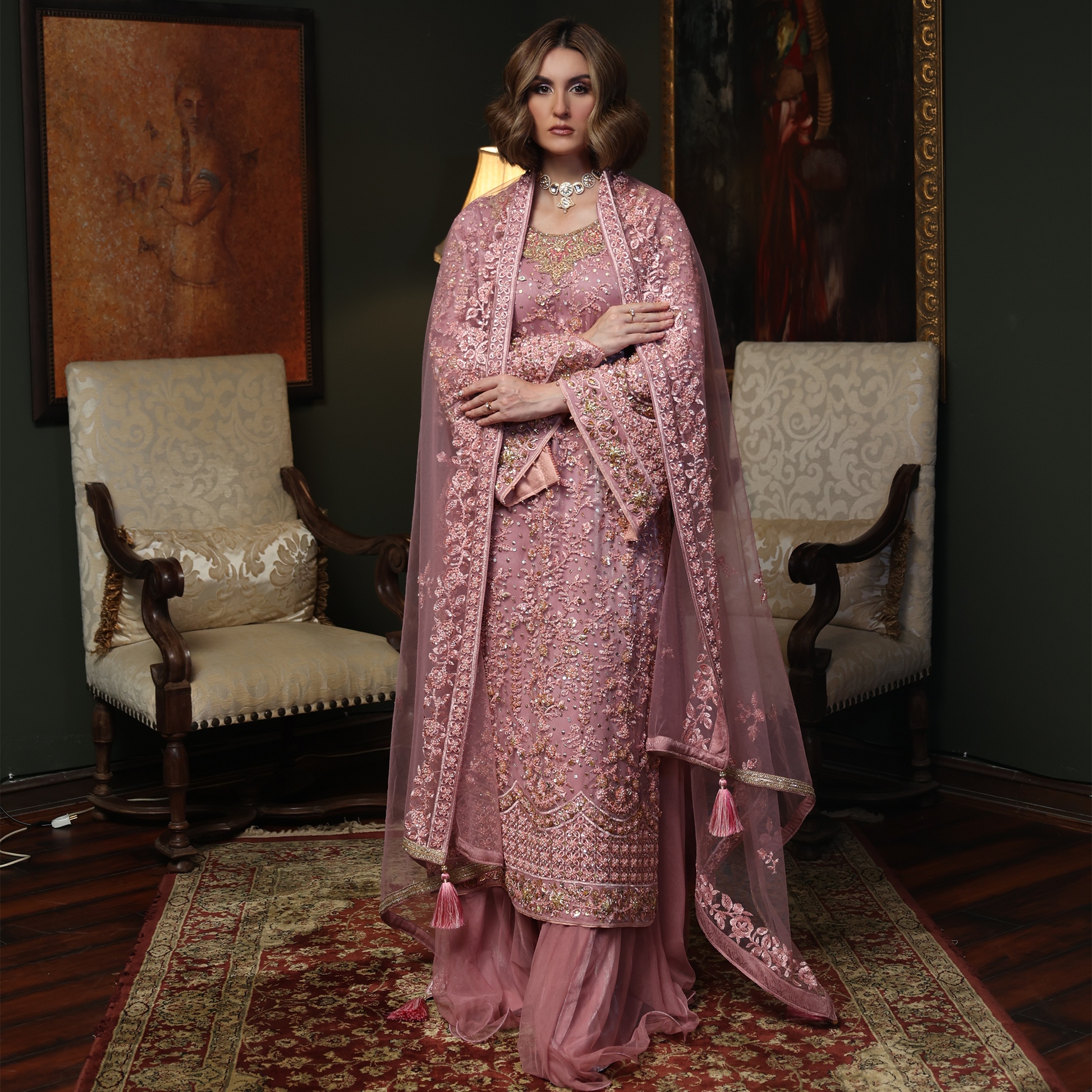 Tea pink embroidered long shirt with a round neckline, featuring intricate hand and machine embroidery. Paired with a matching net skirt and an embroidered net dupatta with slit sleeves for a graceful, feminine look