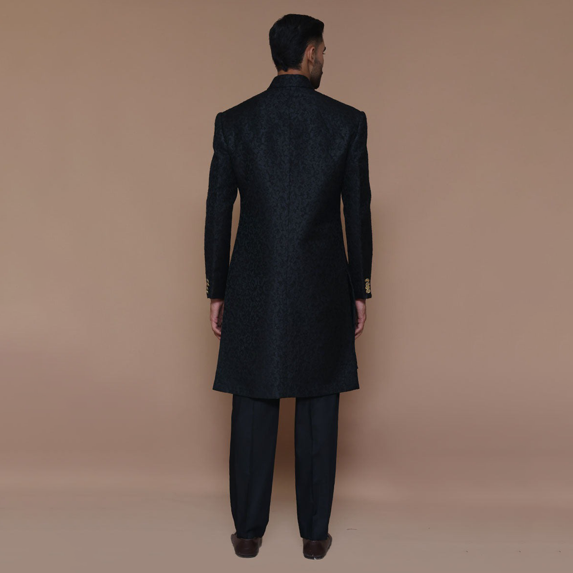 Crafted in Pakistan as a part of the Winter 24 collection, this sherwani features Amir Adnan Signature buttons in gold. The outer garment is created using Zari Karandi Jamawar  fabric that makes the garment soft yet structured. With a straight cut, this sherwani is tapered along the waist and hips to create a slim yet broad shouldered look. The regular fit allows for layering underneath and makes this garment perfect for formal occasions.