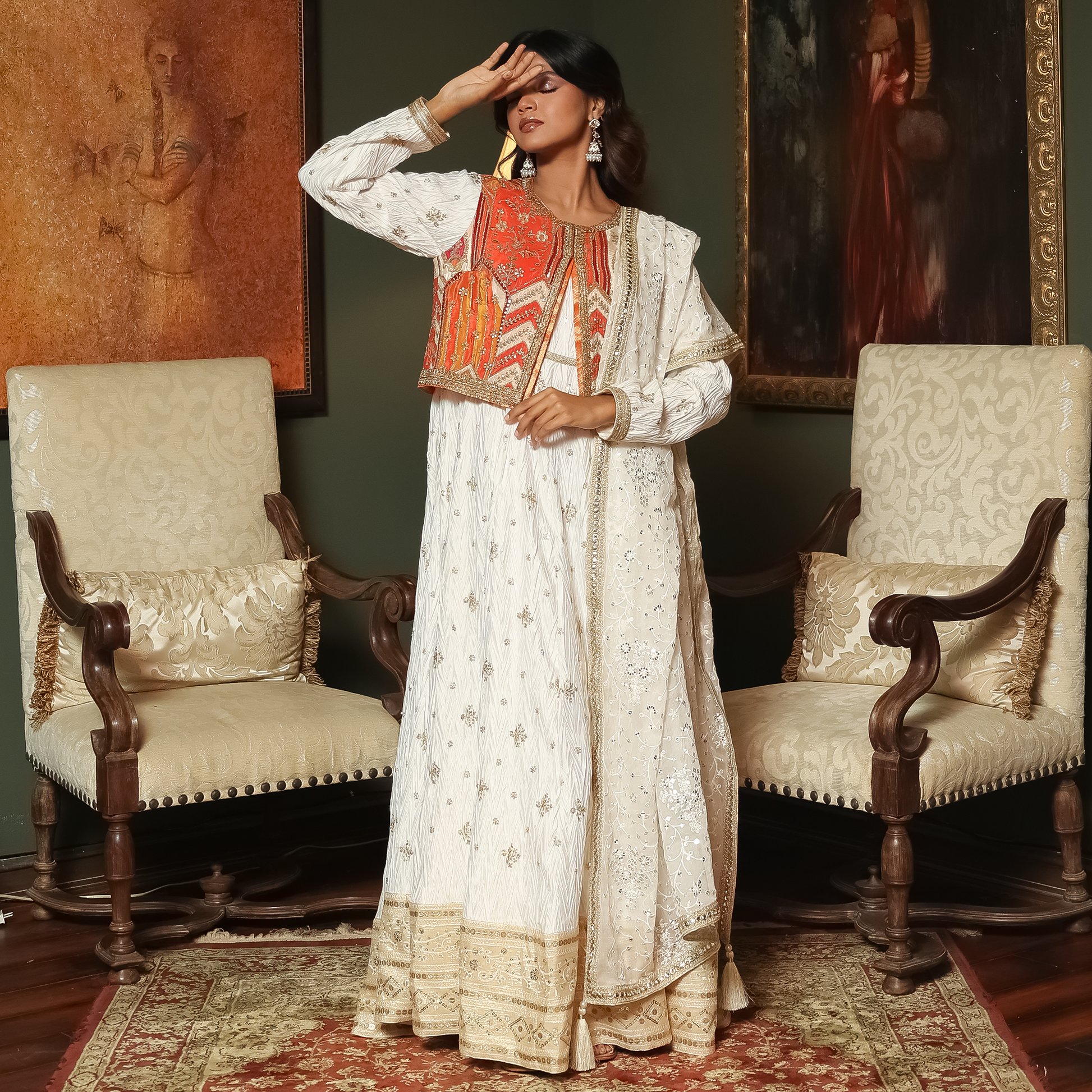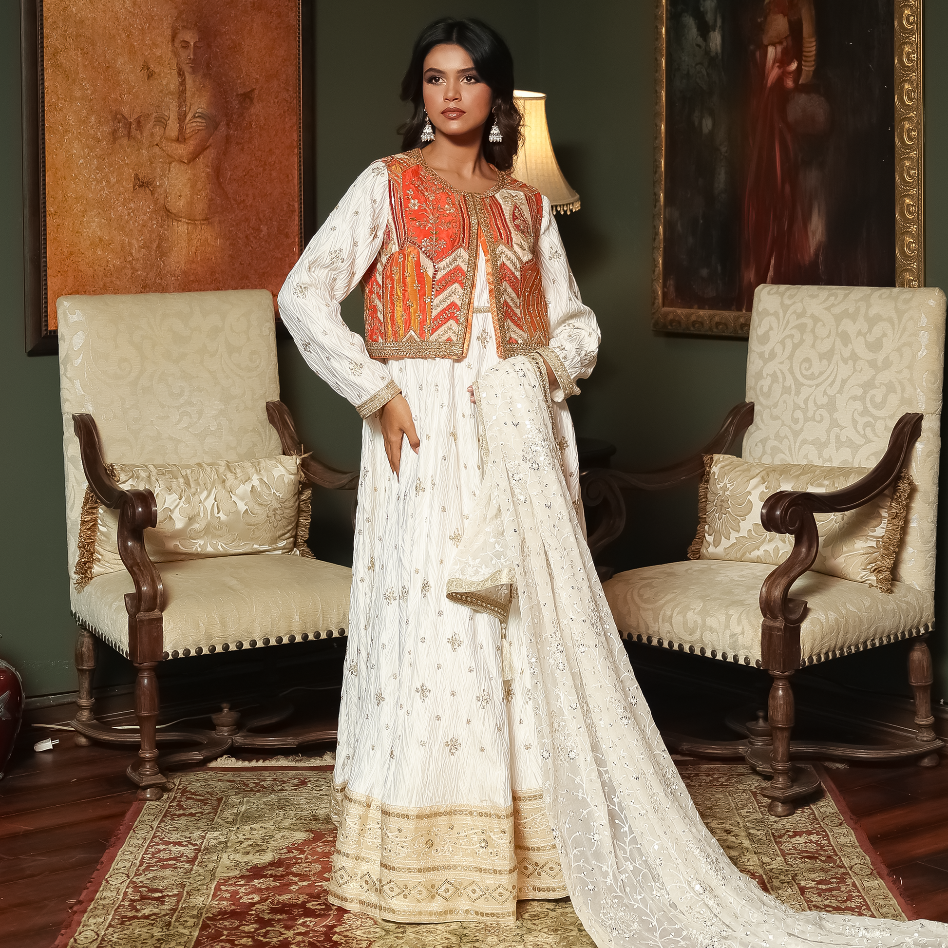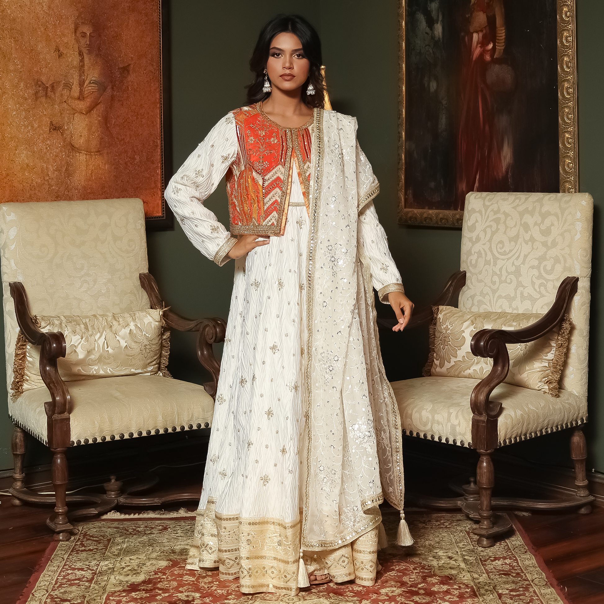 This elegant white outfit features a crushed embroidered gown with a round neckline, gota lace detailing, and a bordered hem for a refined look. It is paired with an orange silk embroidered vest accented with gota work, and a chiffon embroidered dupatta finished with gota and tassels. Perfect for weddings, festive celebrations, and formal events, this ensemble combines traditional craftsmanship with modern sophistication. The 2 pc anarkali with embroidered duppata is for 780 and the Kalamkari vest is for 380